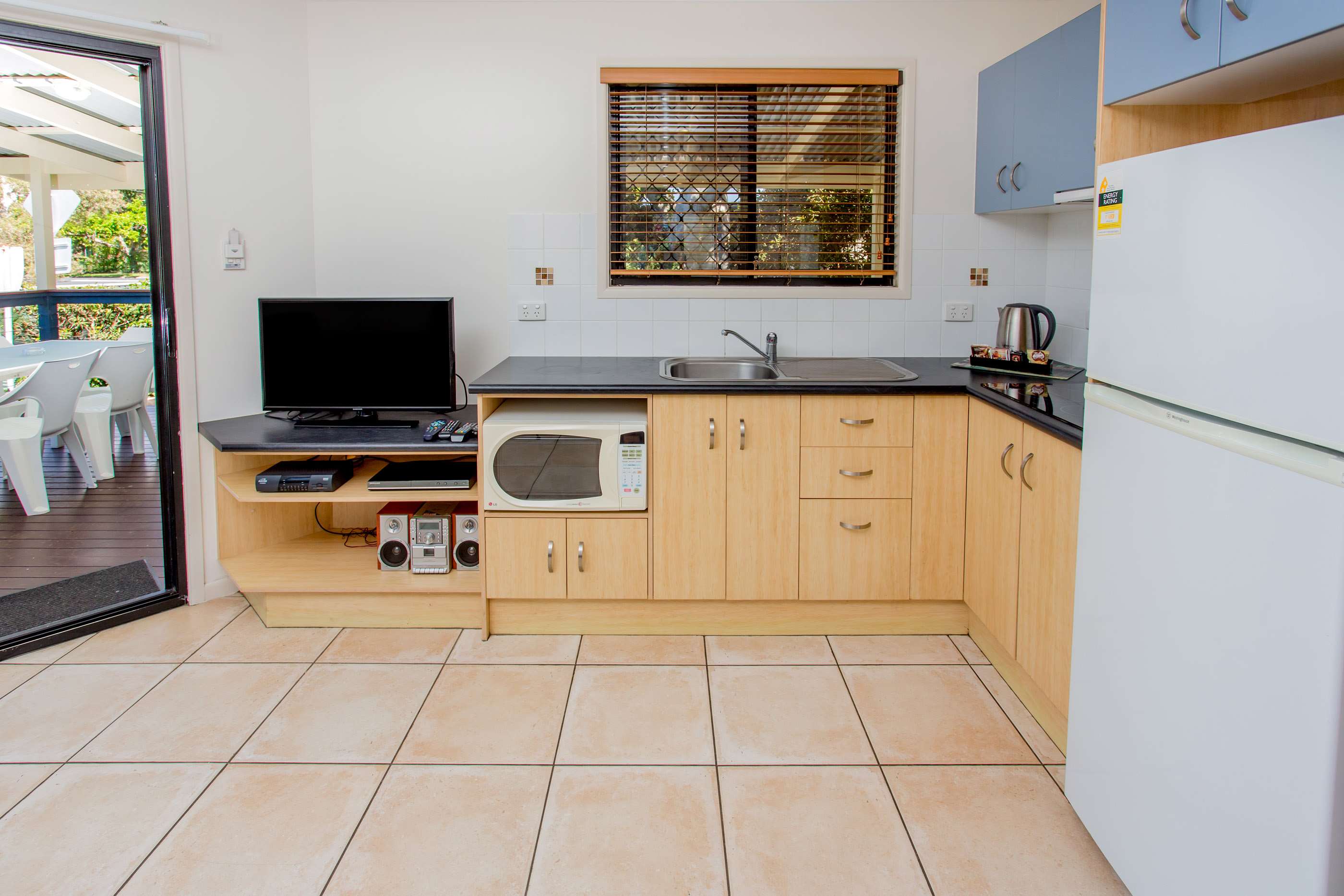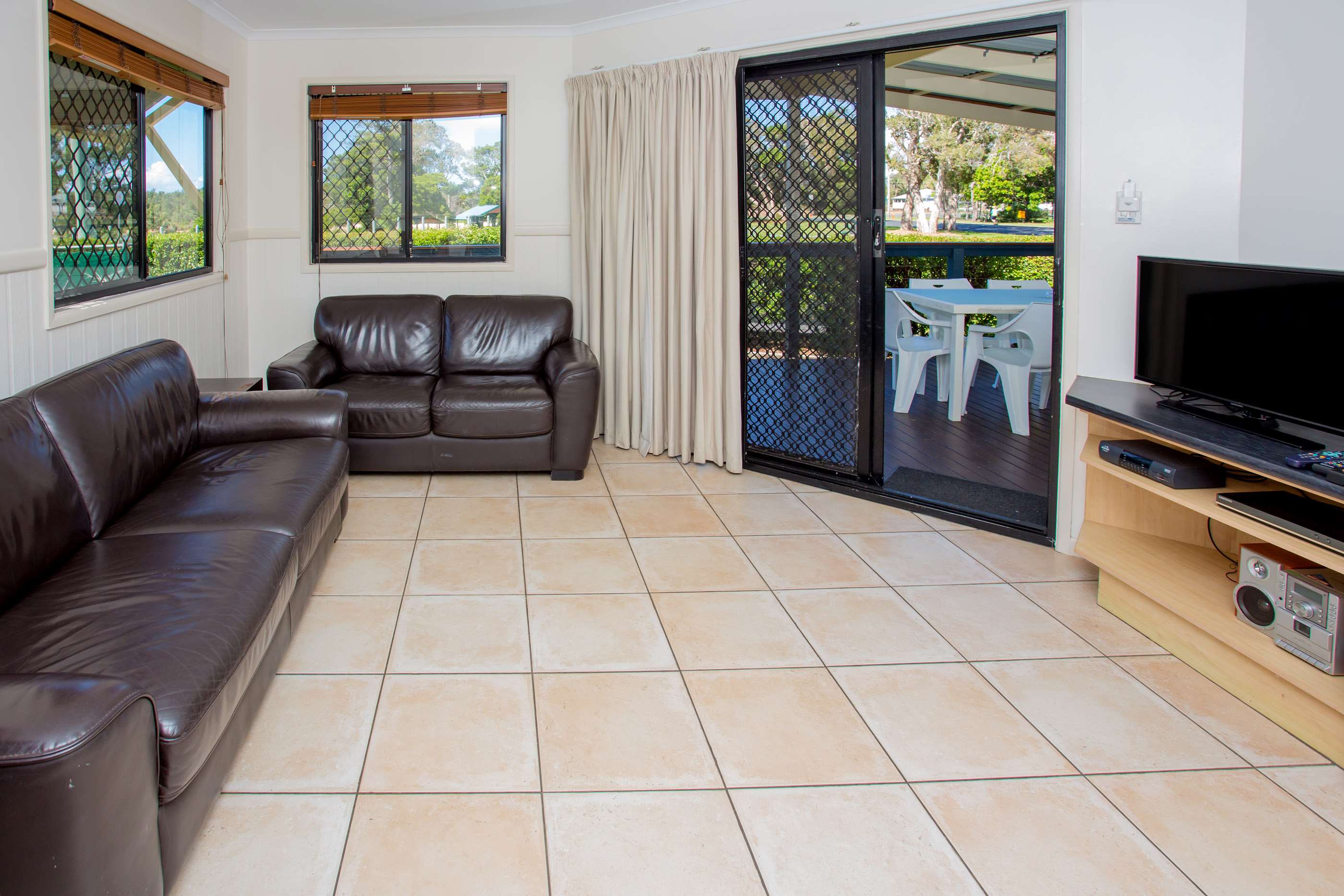 Inclusions - Two bedrooms; main bedroom queen bed made with linen, 2nd bedroom double bunk & single bed, all beds made up with linen. Reading lights next to all beds, iron & ironing board in main bedroom cupboard. Main bedroom has ceiling fan, additional TV & additional air con unit. Room for cot in main bedroom. Kitchen - full size fridge, microwave, 4 hotplates, toaster, kettle. Living - 1x2 & 1x3 seater leather lounges, TV, table with 4 chairs, reverse air con and room for cot or rollaway in living area. Bathroom - shower & basin, toilet separate, there is a wall mounted hair dryer on wall. You can hire one if need something more powerful. Verandah & carport - 3 steps onto verandah, picnic bench style table, 2 extra plastic chairs, clothes airer & child gate, driveway long enough to fit 2nd car or small trailer. Exclusions - No heater or fan as has air con, no oven. Views of Coffs Creek out towards the ocean. Parking for large boat right next to Villa.