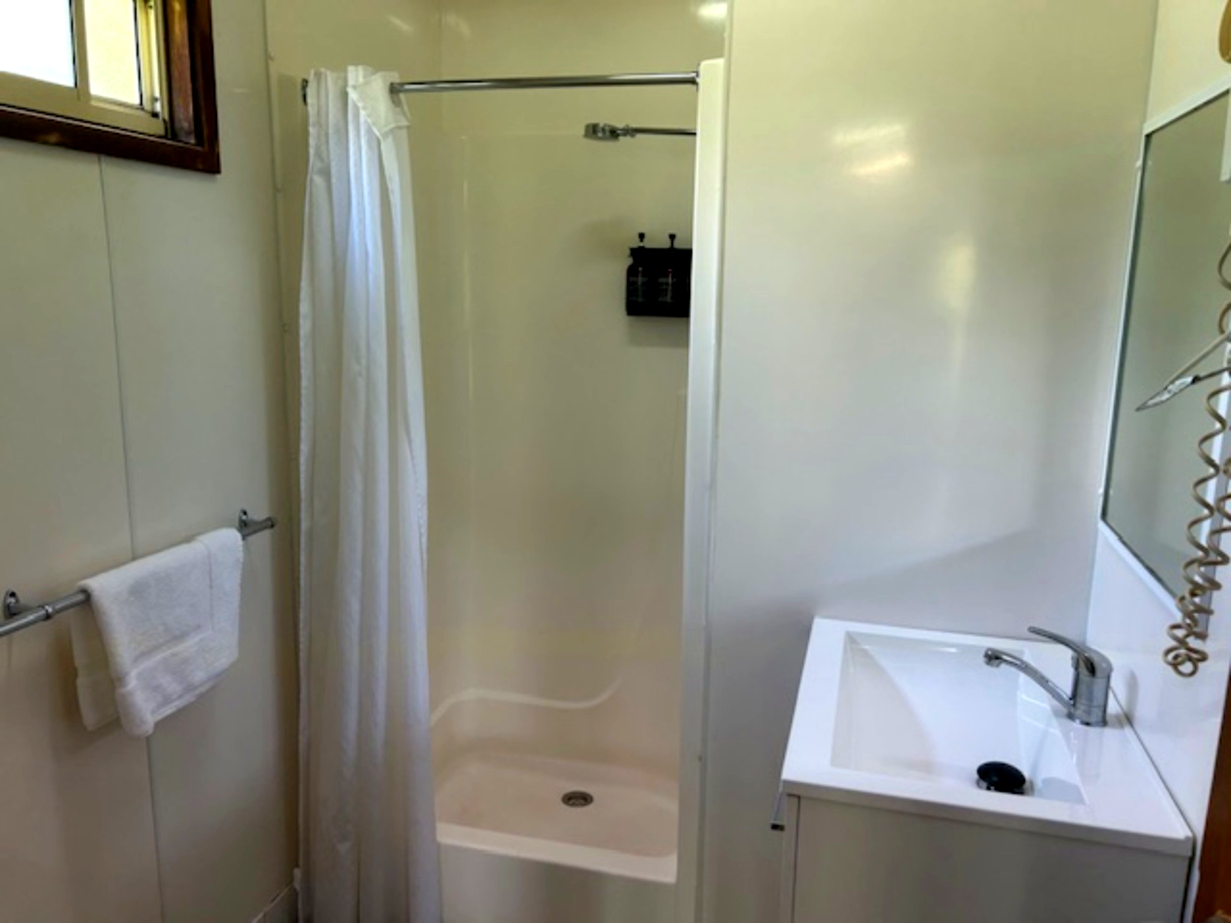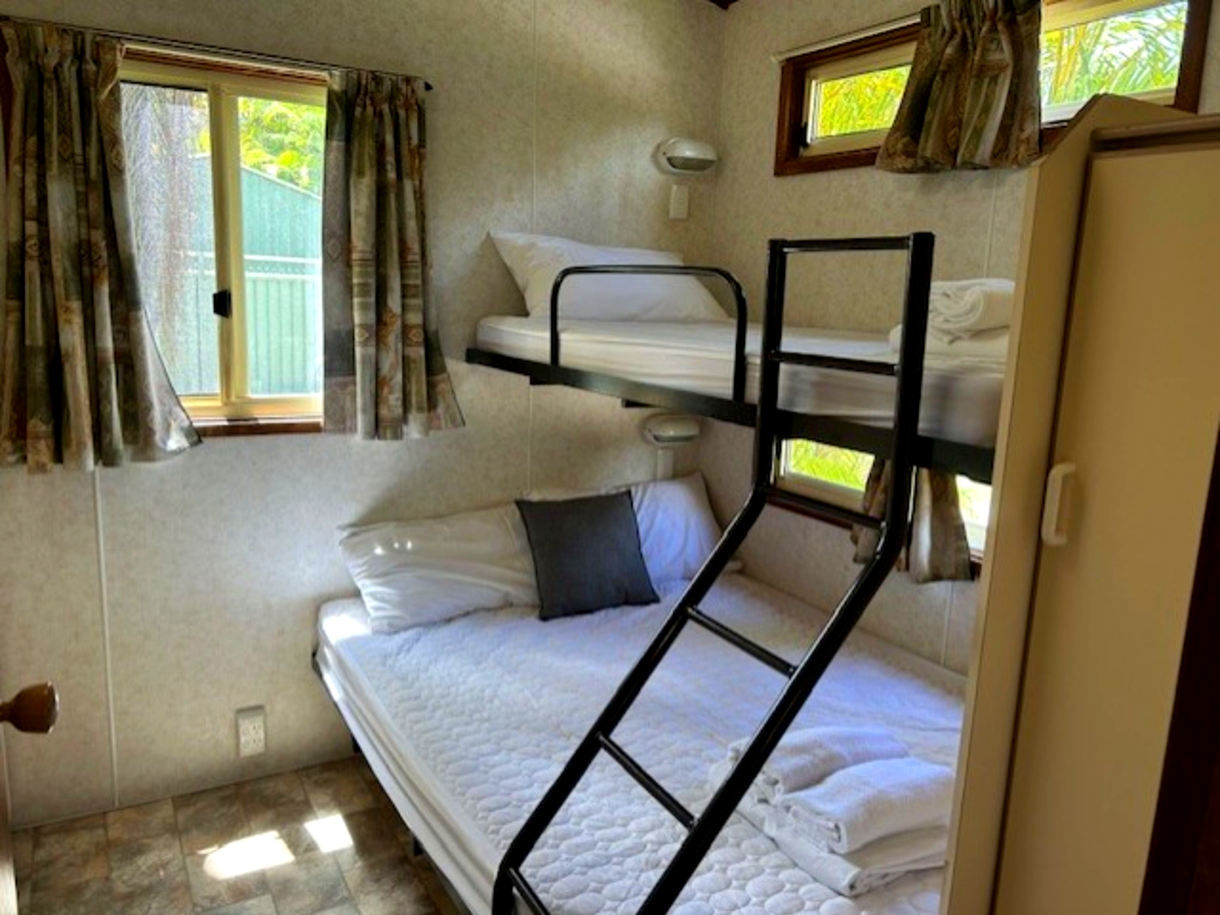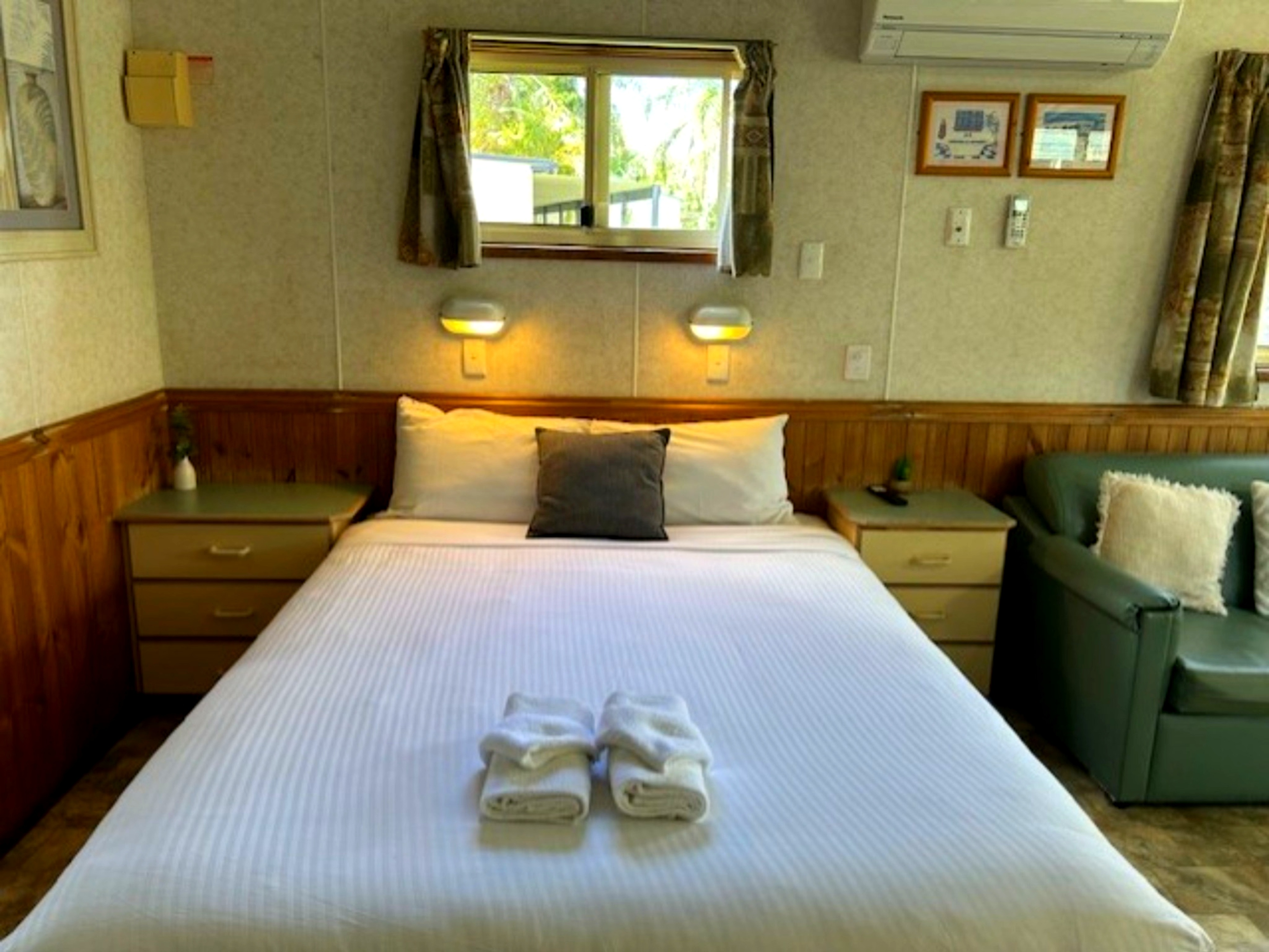 It includes a private bathroom, reverse cycle air-conditioning, ceiling fan, and a TV. The kitchenette offers electric oven and stovetop, microwave, toaster, kettle and a full size fridge for easy meals. Pets are welcome—please contact the park for approval and applicable fees.