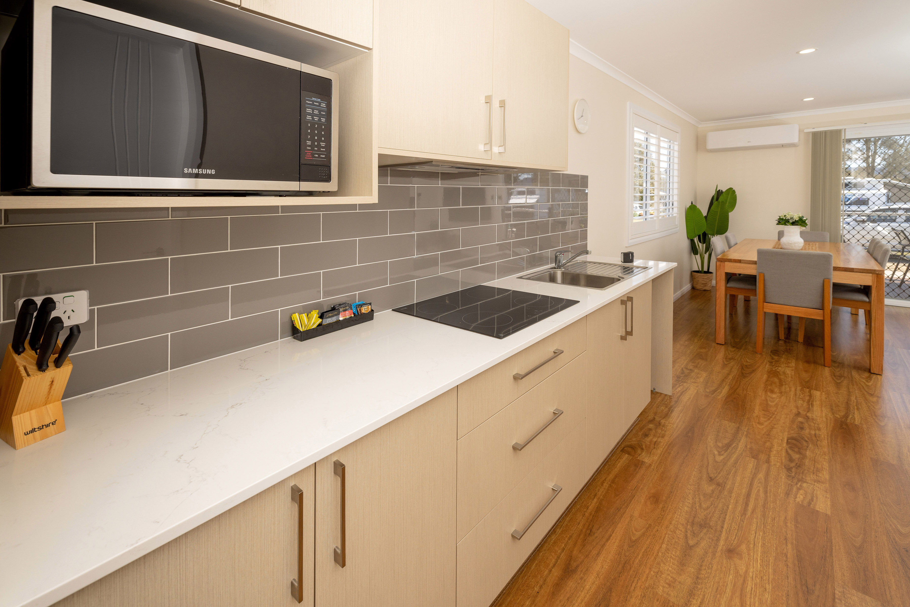 Our camp kitchen is available for use between the hours of 7am and 9pm. Please limit your cooking time to no longer than 1 hour so all our guests have access to the kitchen. The camp kitchen is not available for exclusive use. There are gas BBQs, gas cooktops, two ovens, sinks, microwaves, toasters, and kettles for your use. A refrigerator and freezer are provided for your convenience where food must be labelled and dated with your site number on it. There are tables and chairs inside and outside for your use. Pets are not permitted at the camp kitchen. Service Dogs are an exception. This area is under 24 hour CCTV surveillance.