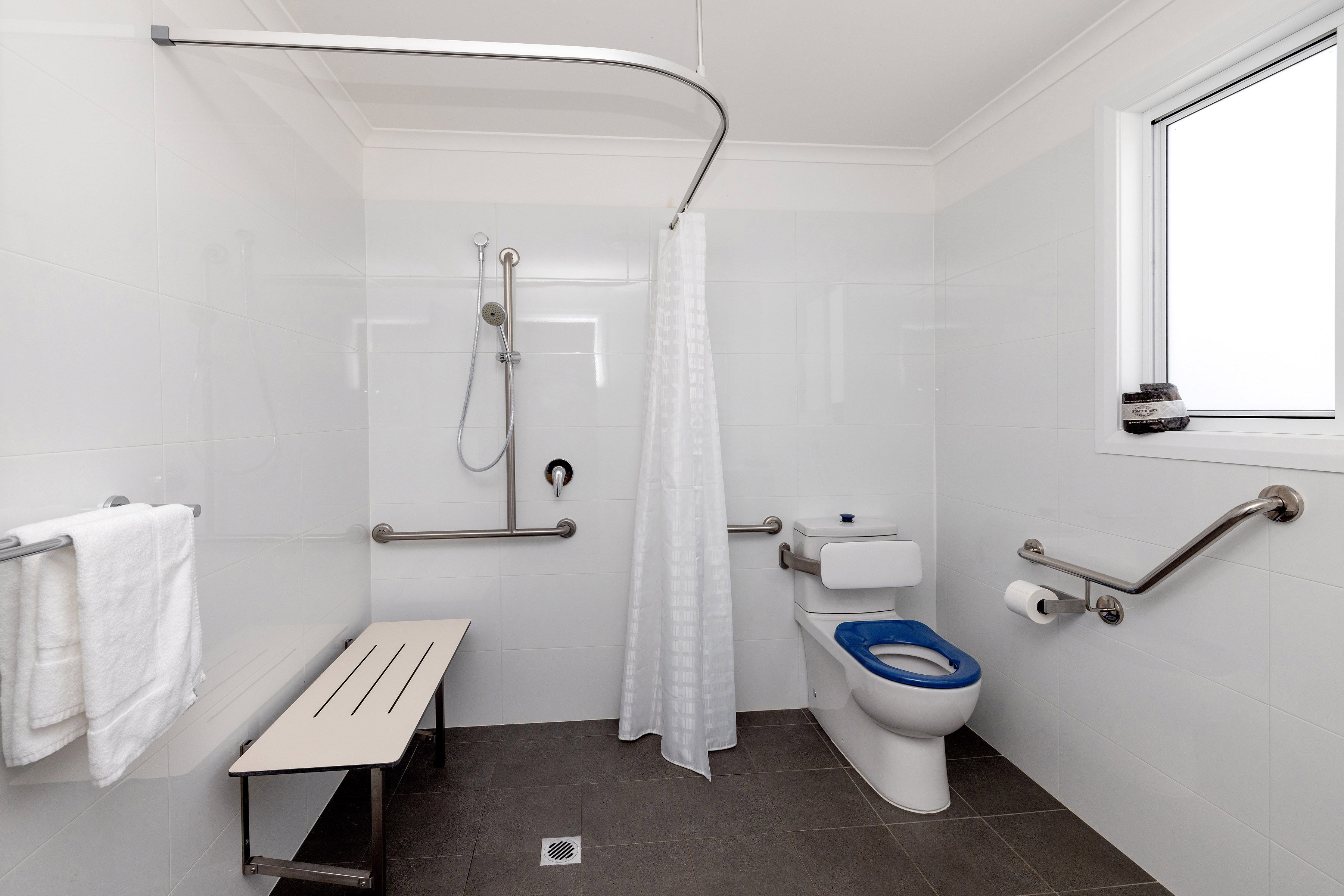 - Fully accessible with a ramp, wider doorways, a shower seat and handrails in the bathroom
