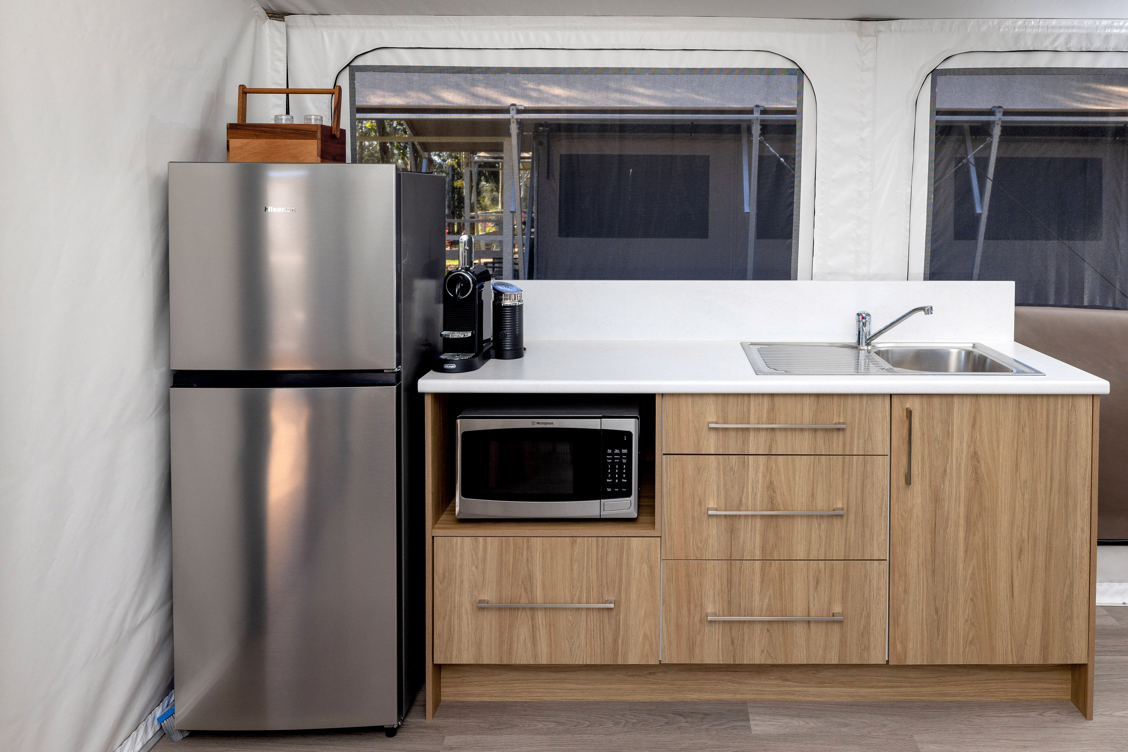 Our camp kitchen is available for use between the hours of 7am and 9pm. Please limit your cooking time to no longer than 1 hour so all our guests have access to the kitchen. The camp kitchen is not available for exclusive use. There are gas BBQs, gas cooktops, two ovens, sinks, microwaves, toasters, and kettles for your use. A refrigerator and freezer are provided for your convenience where food must be labelled and dated with your site number on it. There are tables and chairs inside and outside for your use. Pets are not permitted at the camp kitchen. Service Dogs are an exception. This area is under 24 hour CCTV surveillance.