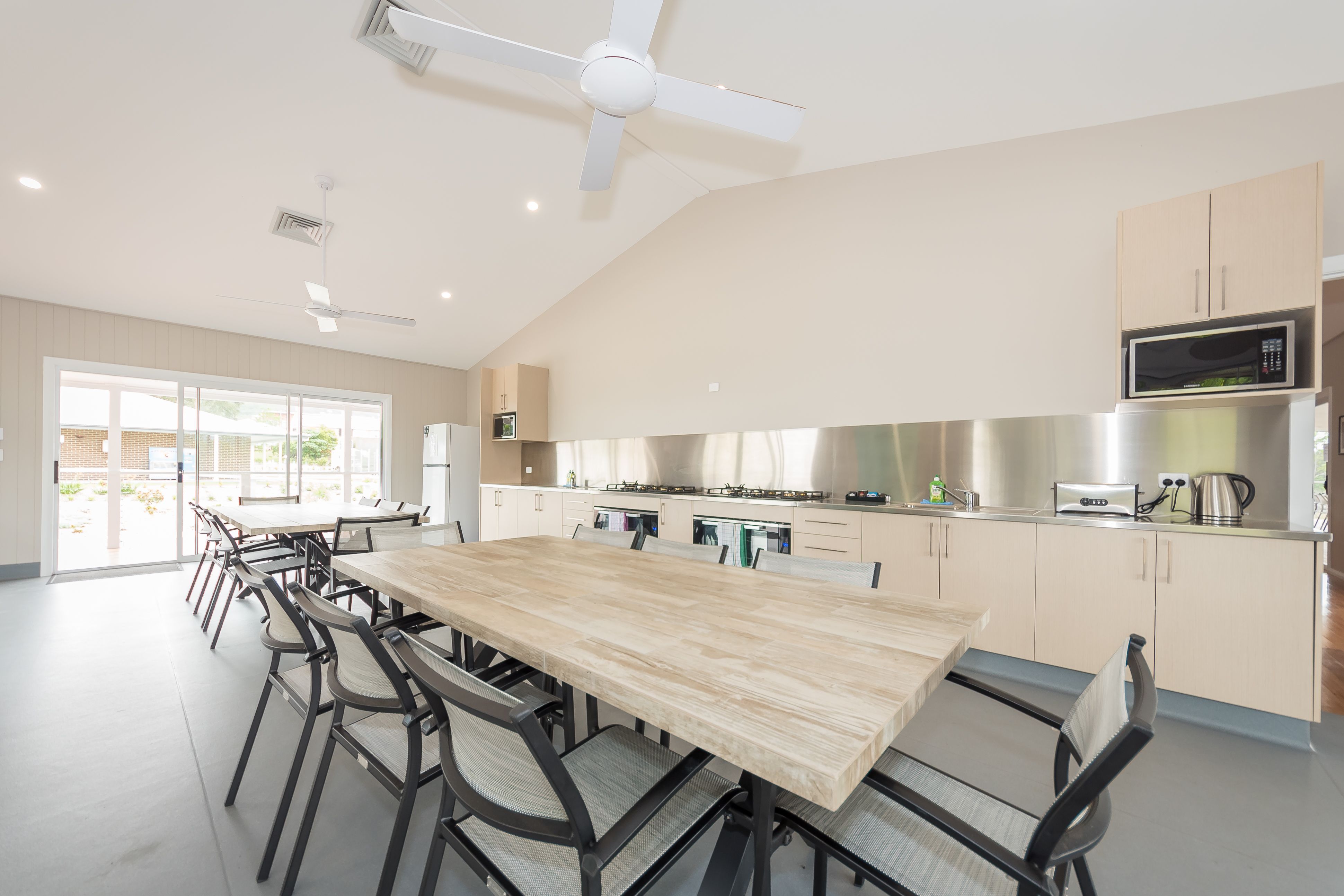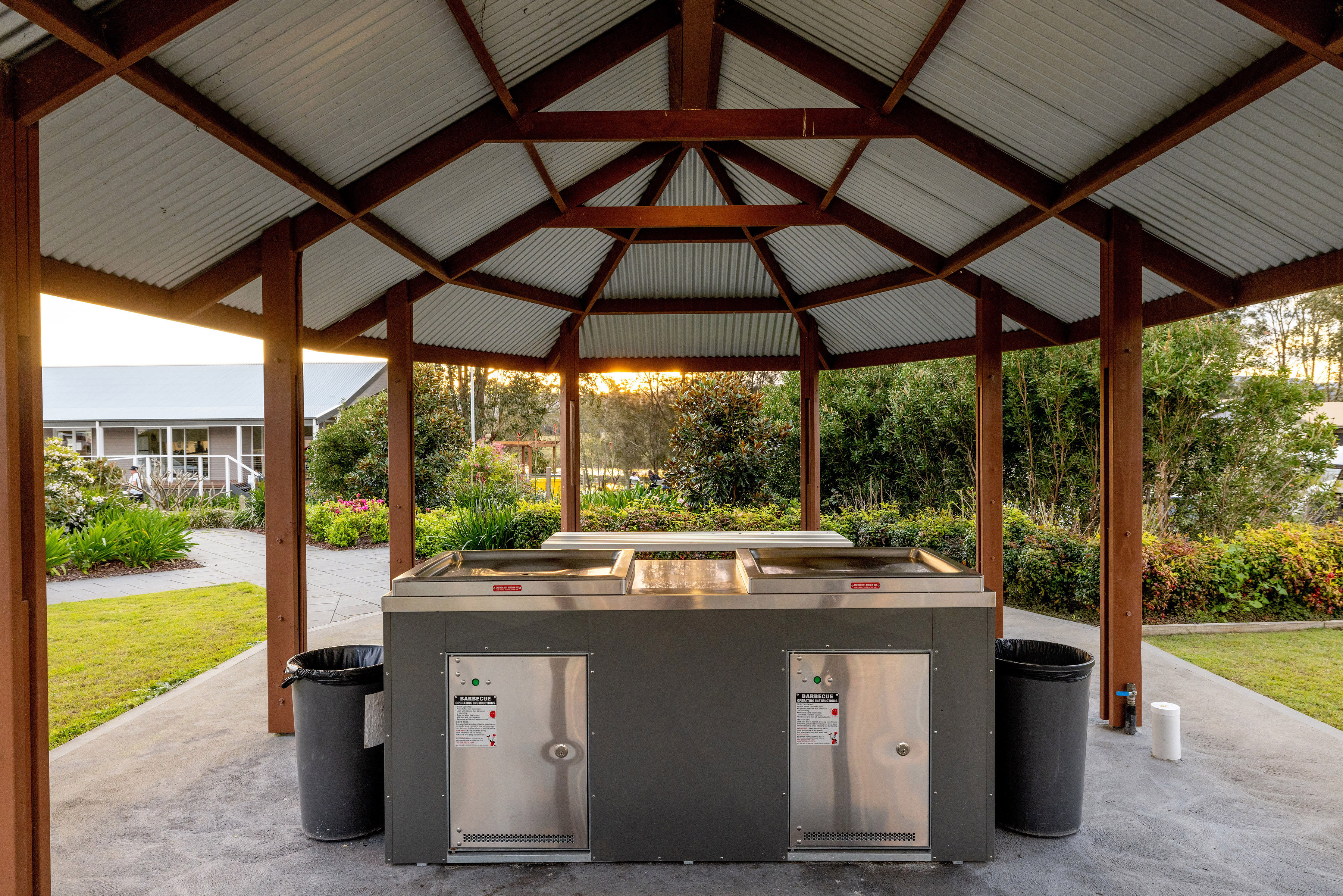 Our camp kitchen is available for use between the hours of 7am and 9pm. Please limit your cooking time to no longer than 1 hour so all our guests have access to the kitchen. The camp kitchen is not available for exclusive use. There are gas BBQs, gas cooktops, two ovens, sinks, microwaves, toasters, and kettles for your use. A refrigerator and freezer are provided for your convenience where food must be labelled and dated with your site number on it. There are tables and chairs inside and outside for your use. Pets are not permitted at the camp kitchen. Service Dogs are an exception. This area is under 24 hour CCTV surveillance.