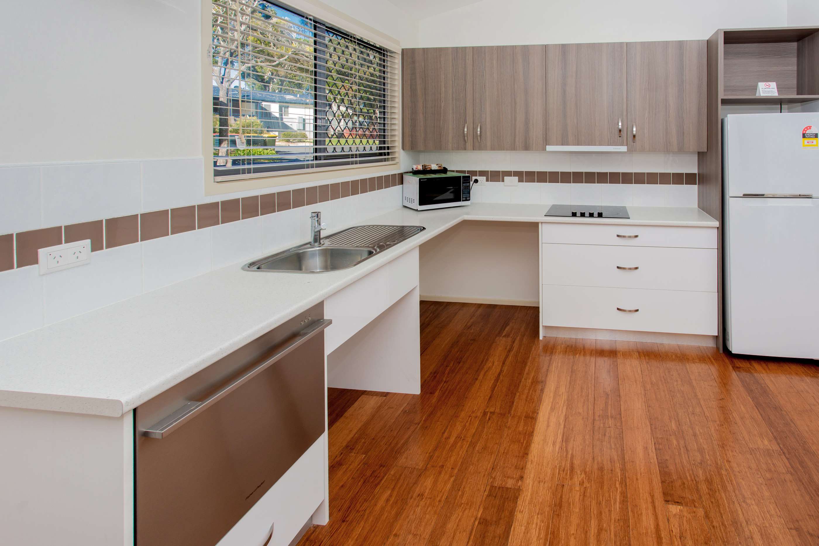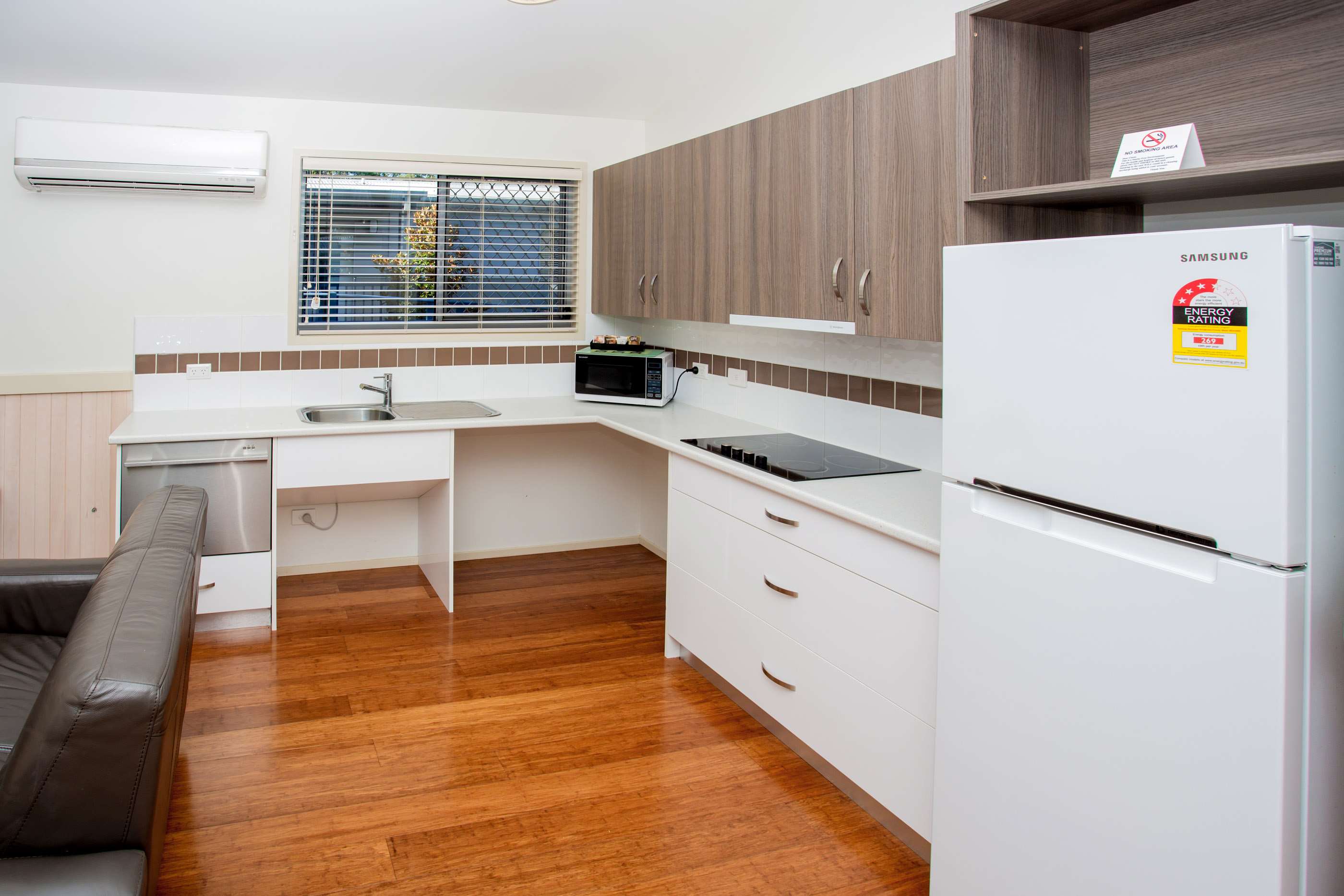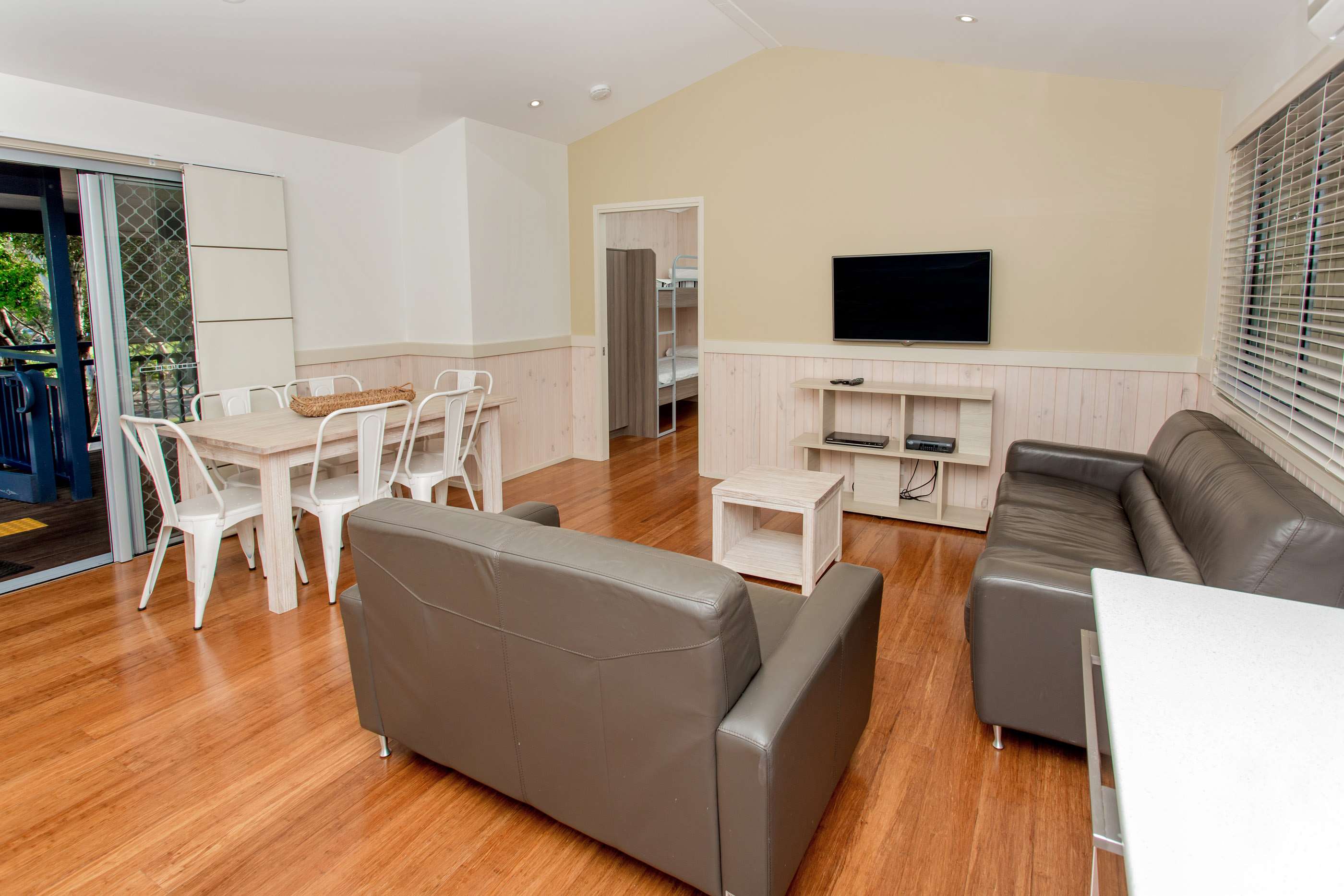 Fully self-contained kitchen with dishwasher & microwave, TV, DVD, comfortable leather lounge, dining table and split system air conditioning.