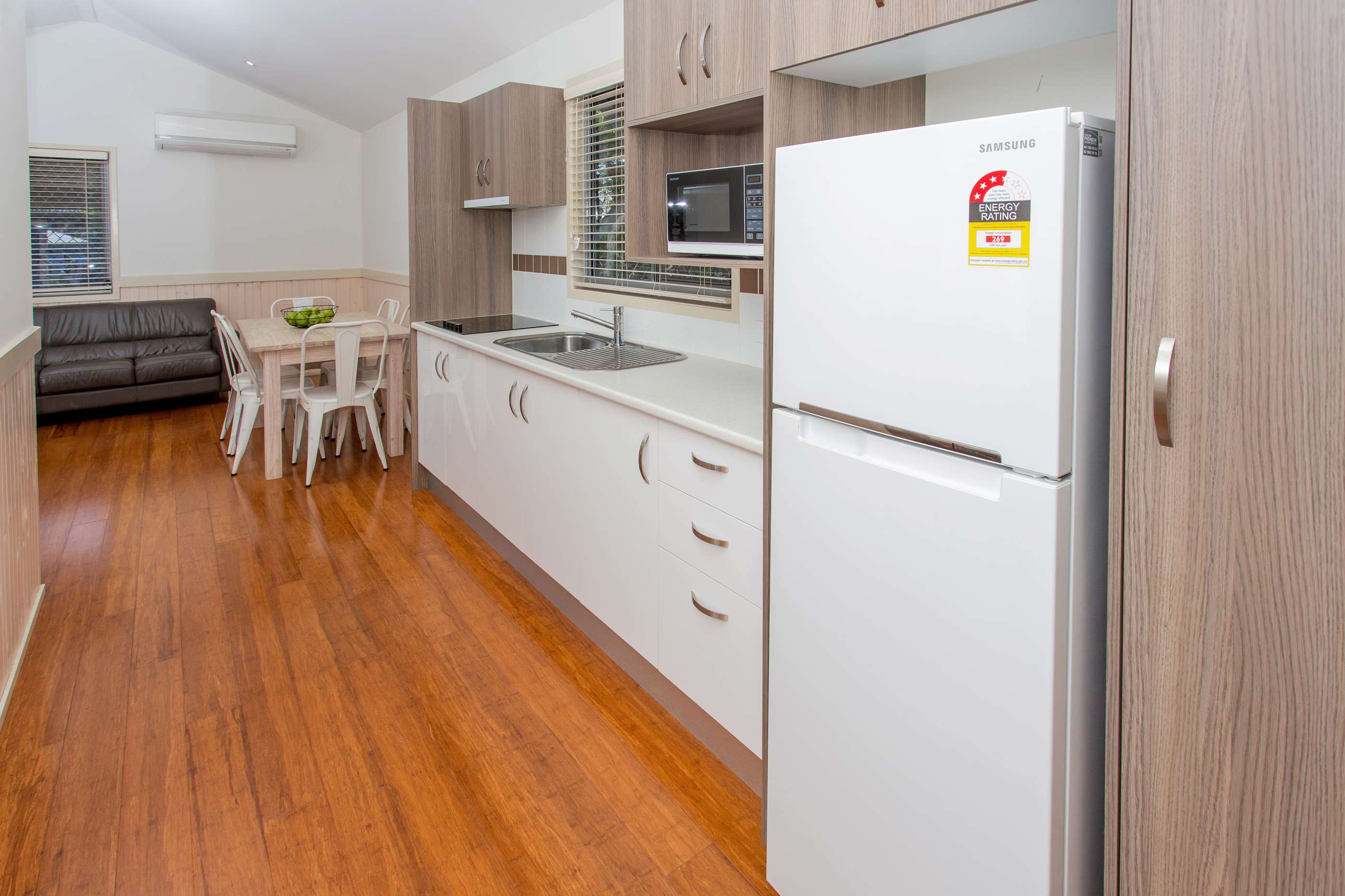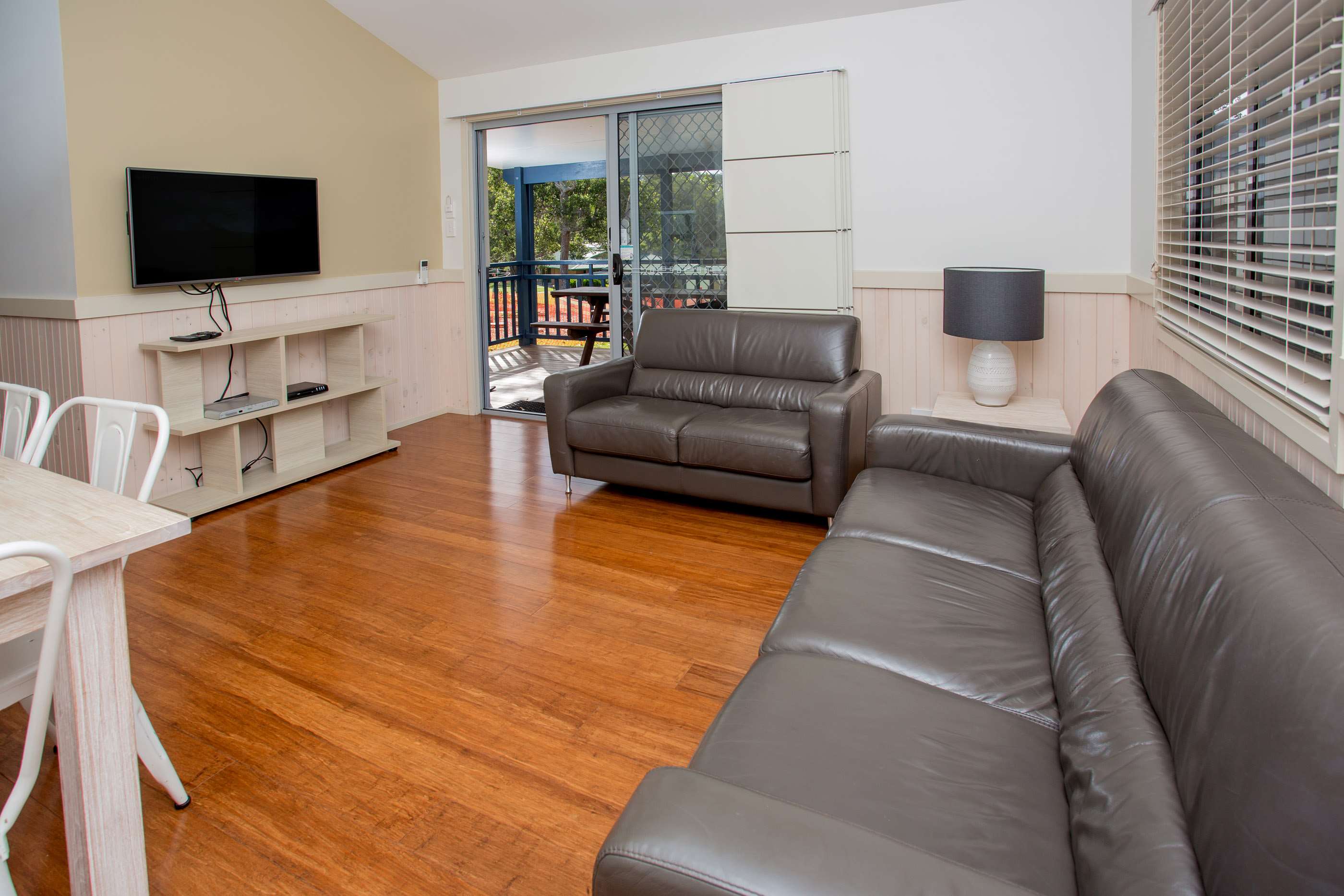 There is a large living space with a fully fitted kitchen and separate dining area. The lounge area includes leather lounge, TV, DVD and split system air conditioning.