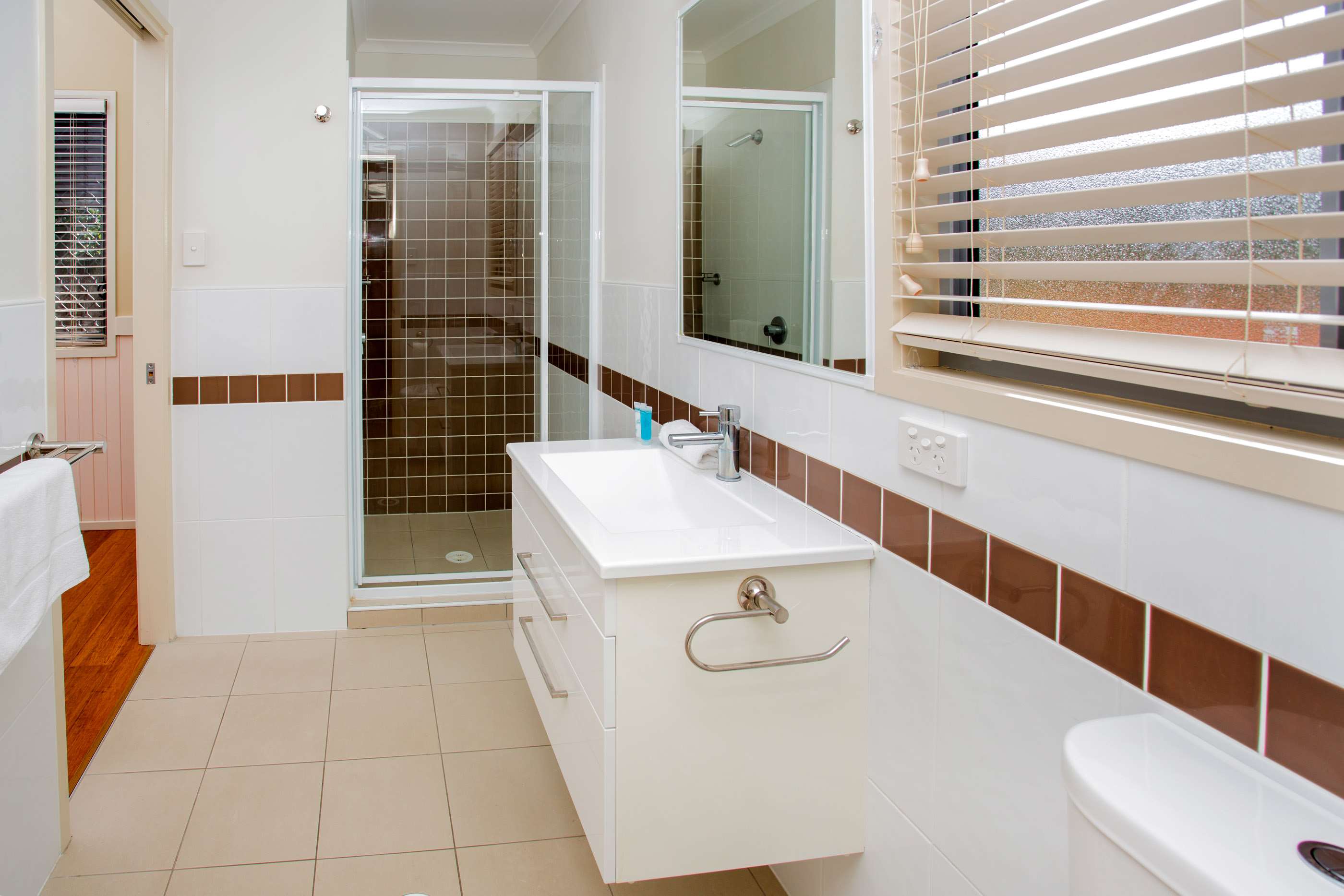 The bathroom has a shower, vanity and toilet.
