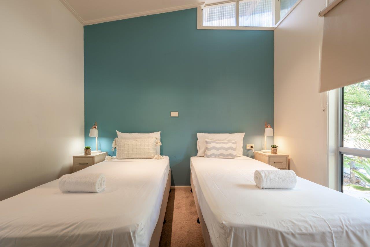 These are great and situated on the grass reserve with only a short stroll to the beach. This modern and contemporary cabin has a king bed in the main bedroom with adjoining bathroom, and the second room has two king single beds with its own bathroom. All linen is supplied. It has a large spacious kitchen with a verandah overlooking the reserve.
