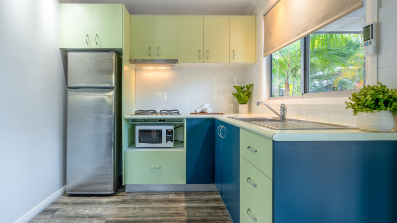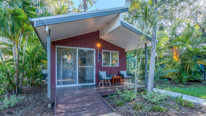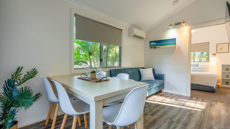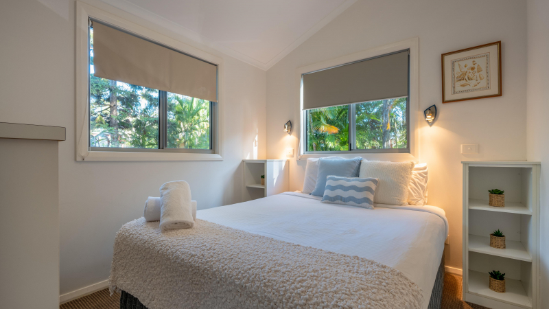 The Poolside Hut is a fun unit designed for two adults and three kids. It has two bedrooms with a queen bed in the main bedroom, ceiling fan and bathroom with a tiled walk-in shower. The second bedroom has a bunk bed and single bed. The hut is air-conditioned with a modern living area and LCD television. The kitchen features a full size fridge, microwave and four burner gas cooktop. Bedrooms are carpeted and the living area is tiled or vinyl. With raked ceilings these units feel spacious for their size. The poolside huts are located close to the heated swimming pool and water slides.