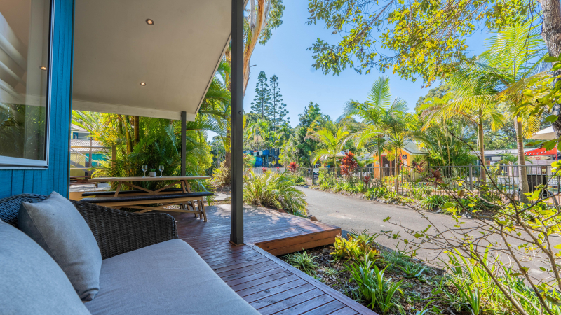 Vibrant in colour and design, the Surf Villa features quality contemporary furniture and design. 2 bedrooms - main with queen bed and second has 2 sets of bunks. Sleeps 6 (maximum). All linen provided. Roomy kitchen with stove, microwave and fridge. Air conditioned with lounge, dining bench, TV and deck. Resort style pool and water slides just a splash away.