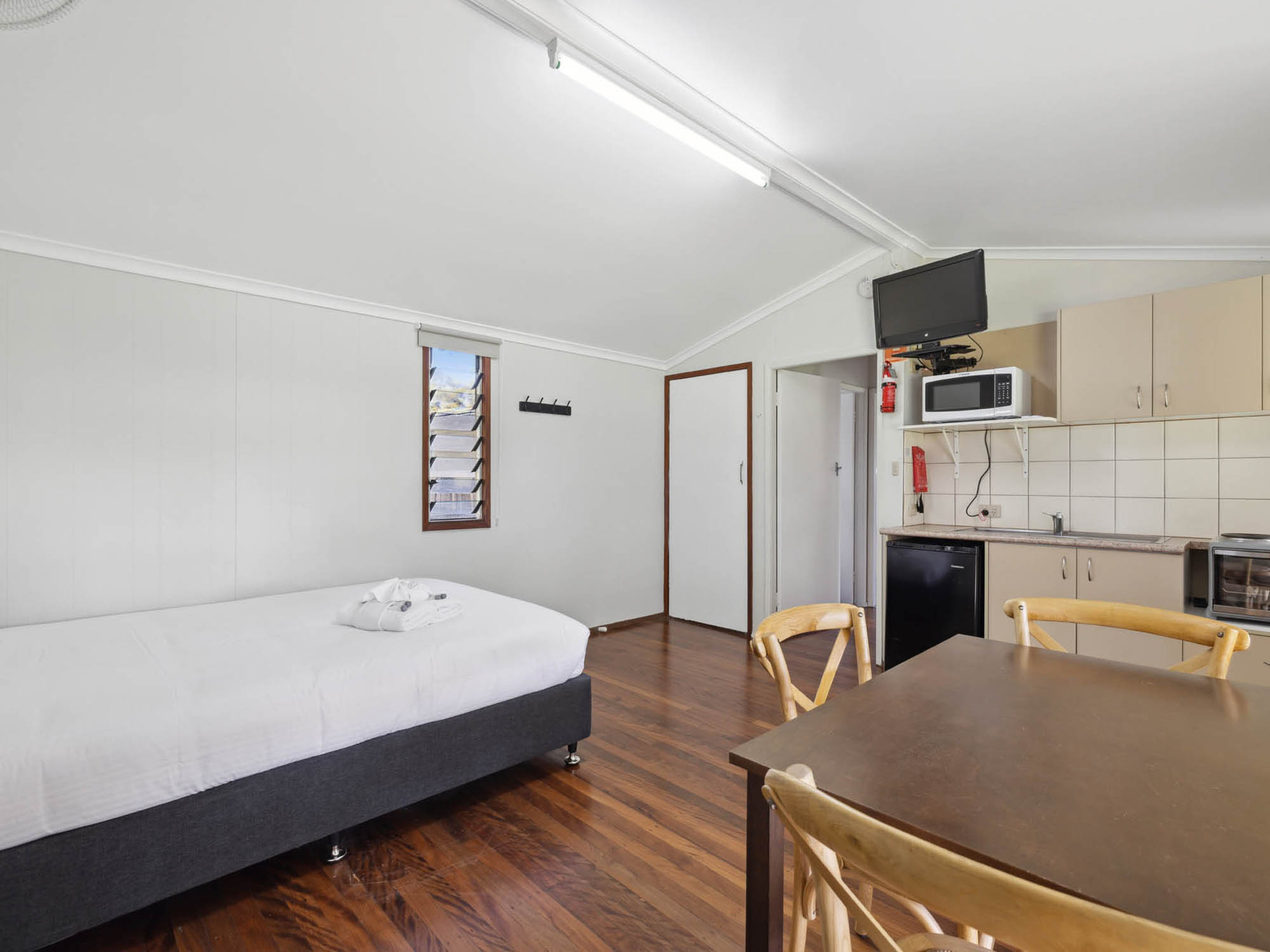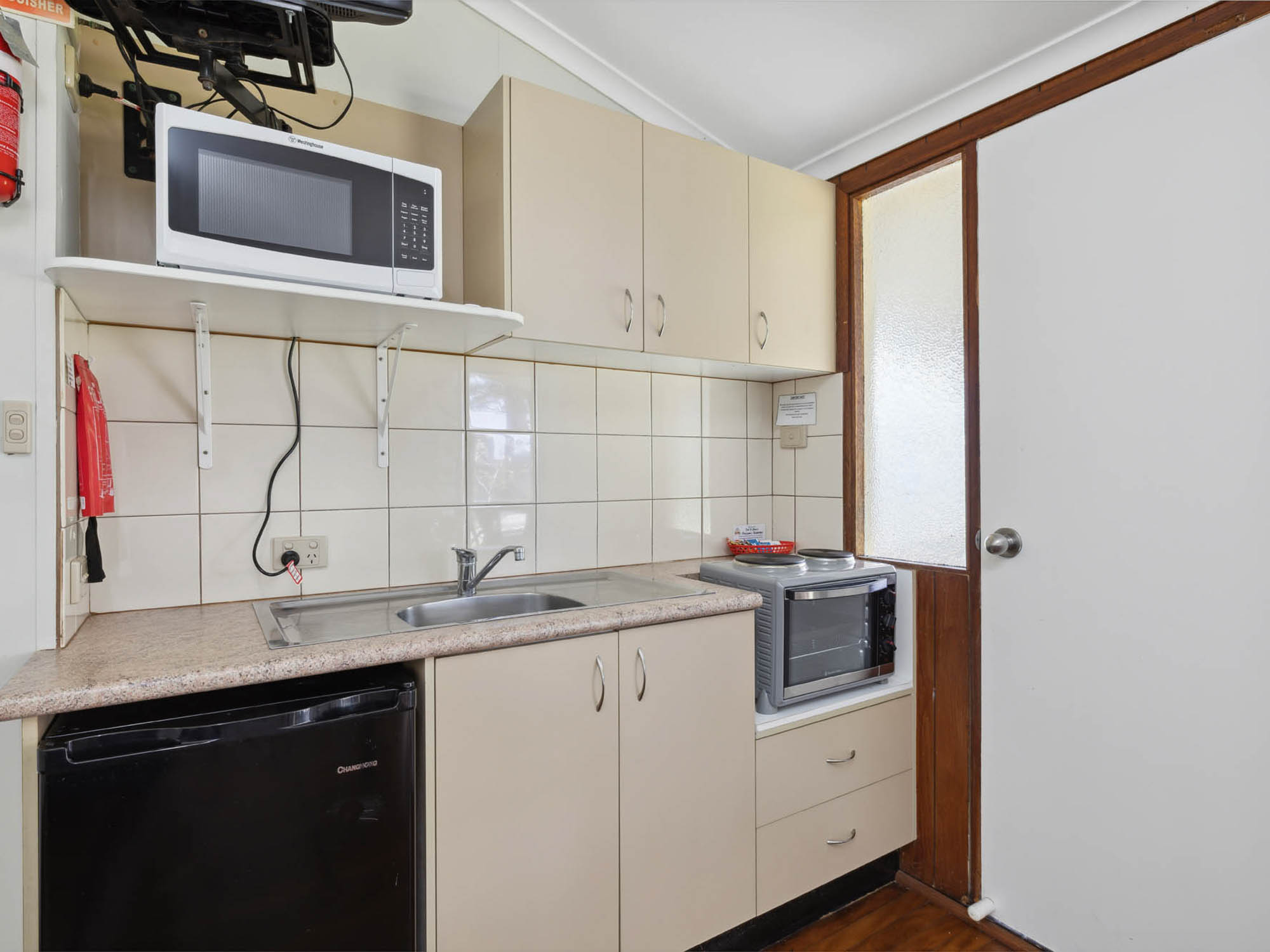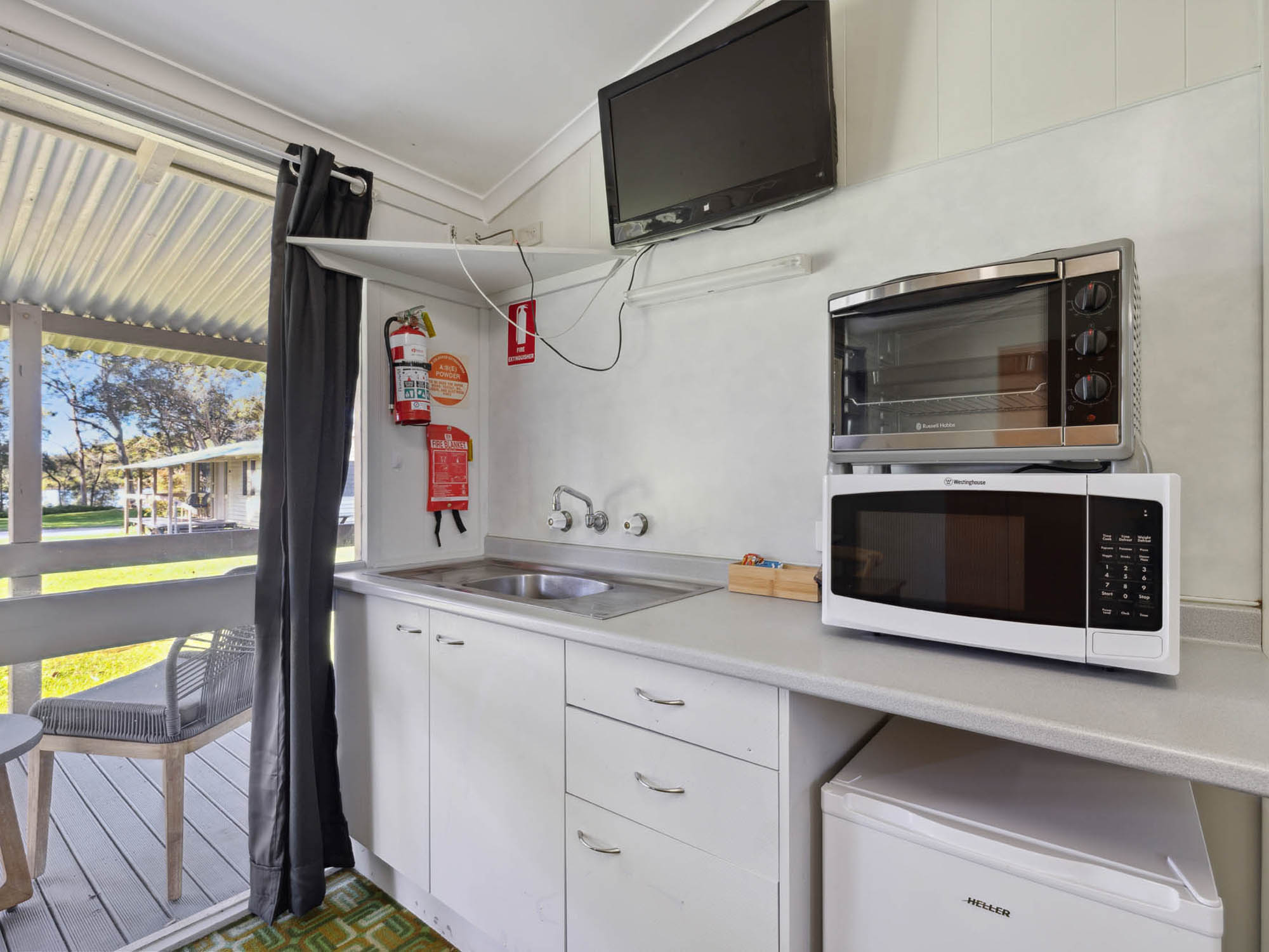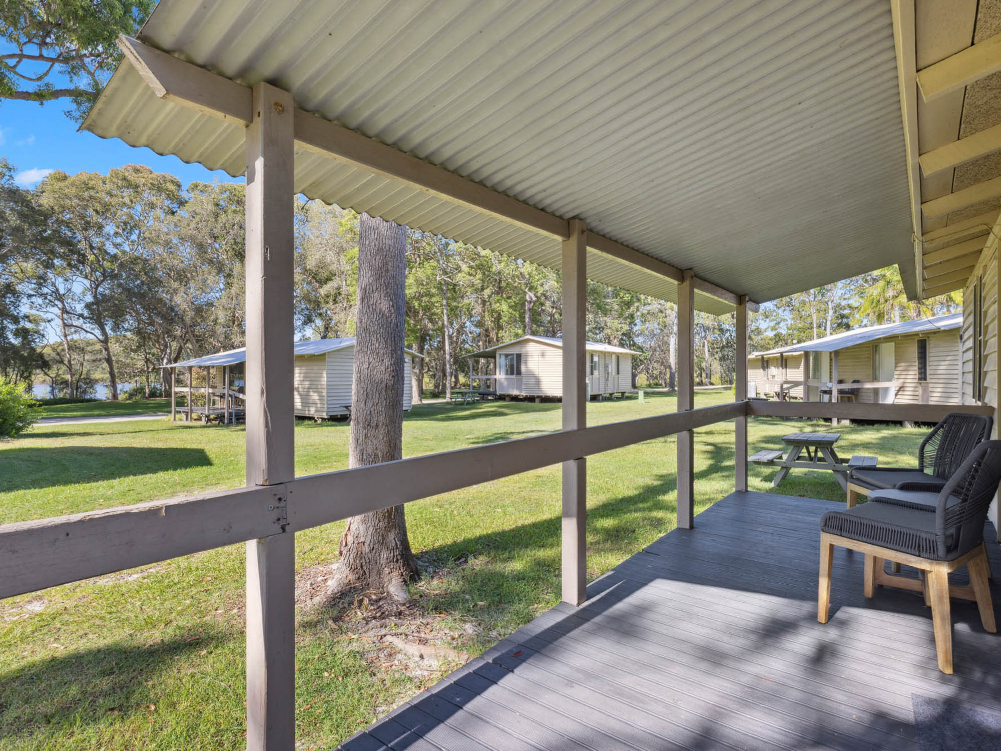 Designed with easy access in mind, this cabin comfortably sleeps up to six guests with a queen bed in the main area and two sets of bunk beds in a separate room. The open-plan layout includes a roll-in shower, grab rails, and step-free access throughout. A compact kitchenette offers a microwave, electric stovetop, toaster and bar fridge. Air conditioning, TV and a dining area add to the comfort, while the private deck provides a quiet spot to unwind outdoors.