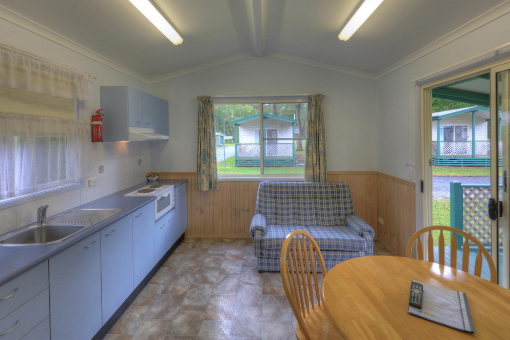 The cabin includes a well-equipped kitchen with a cooktop grill, microwave, fridge, and a dining table set for four. Guests can also enjoy a lounge area, TV, air conditioning, and a covered verandah with outdoor seating.