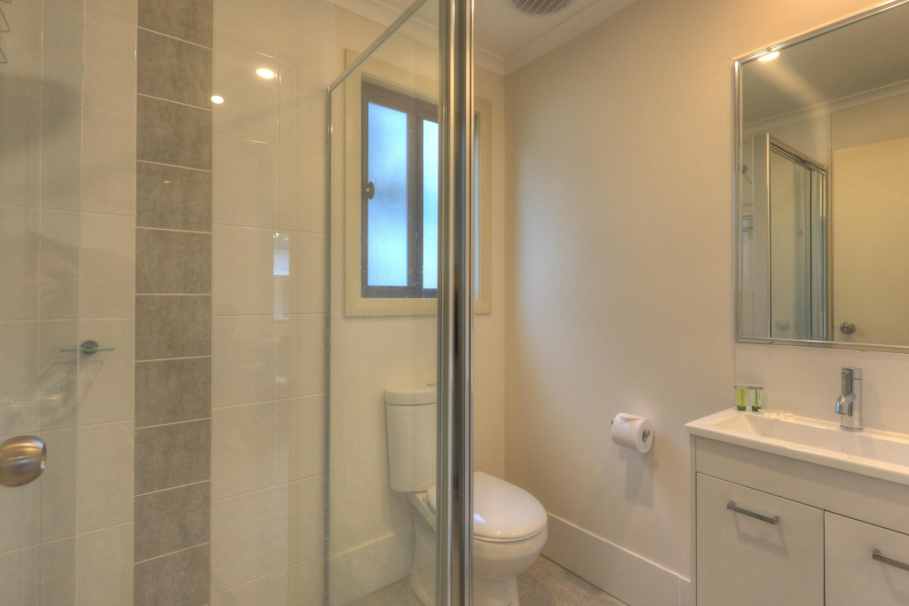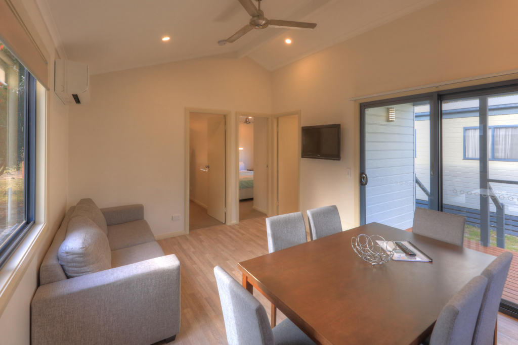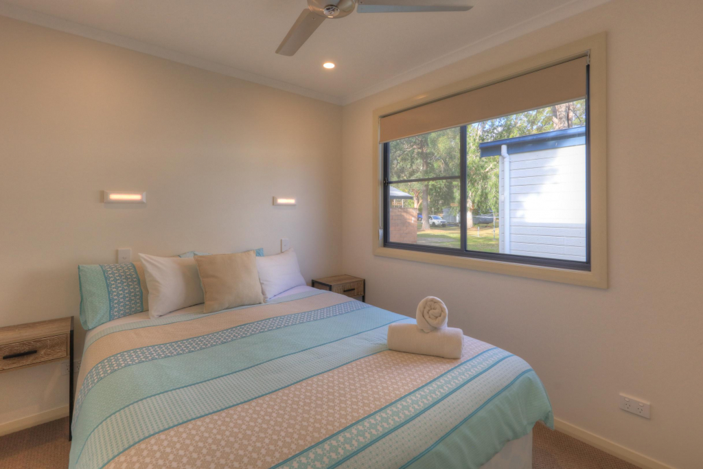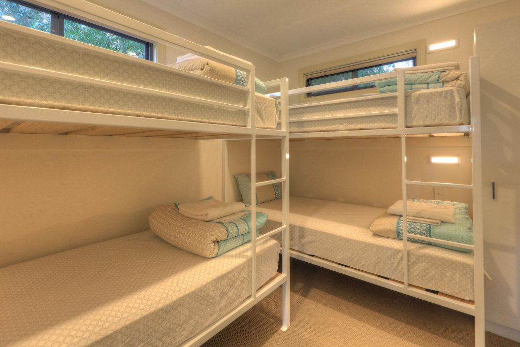Each cabin includes two separate bedrooms and a spacious bathroom. The main bedroom features a queen-sized bed, while the second bedroom offers two sets of king single bunk beds—perfect for kids or group stays. Linen and towels are provided.