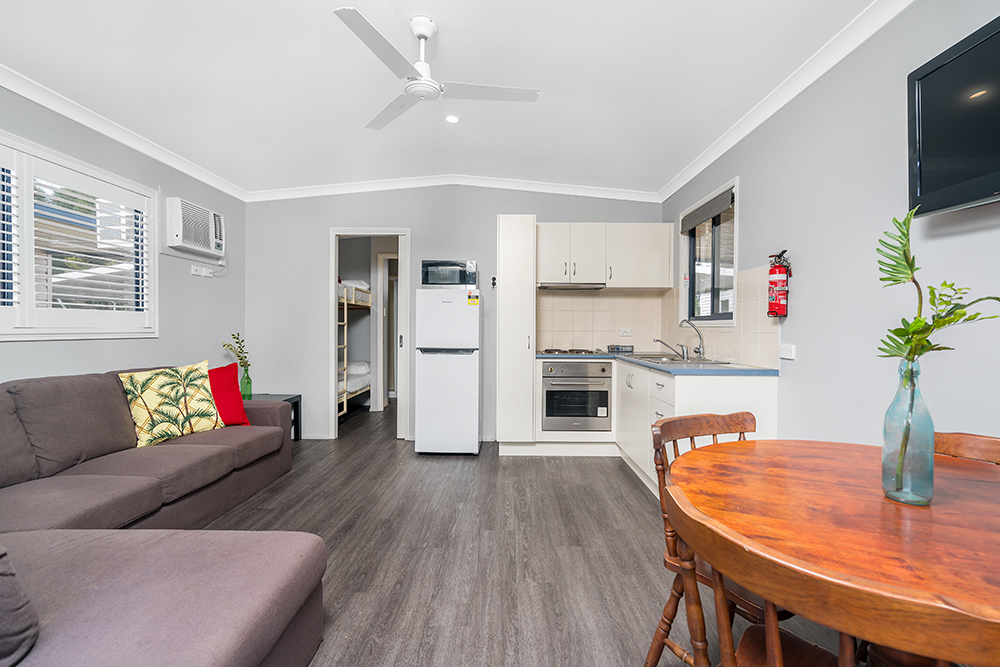 Spacious open plan living area. Full kitchen, with family fridge, oven, cooktop and microwave. Ensuite bathroom.