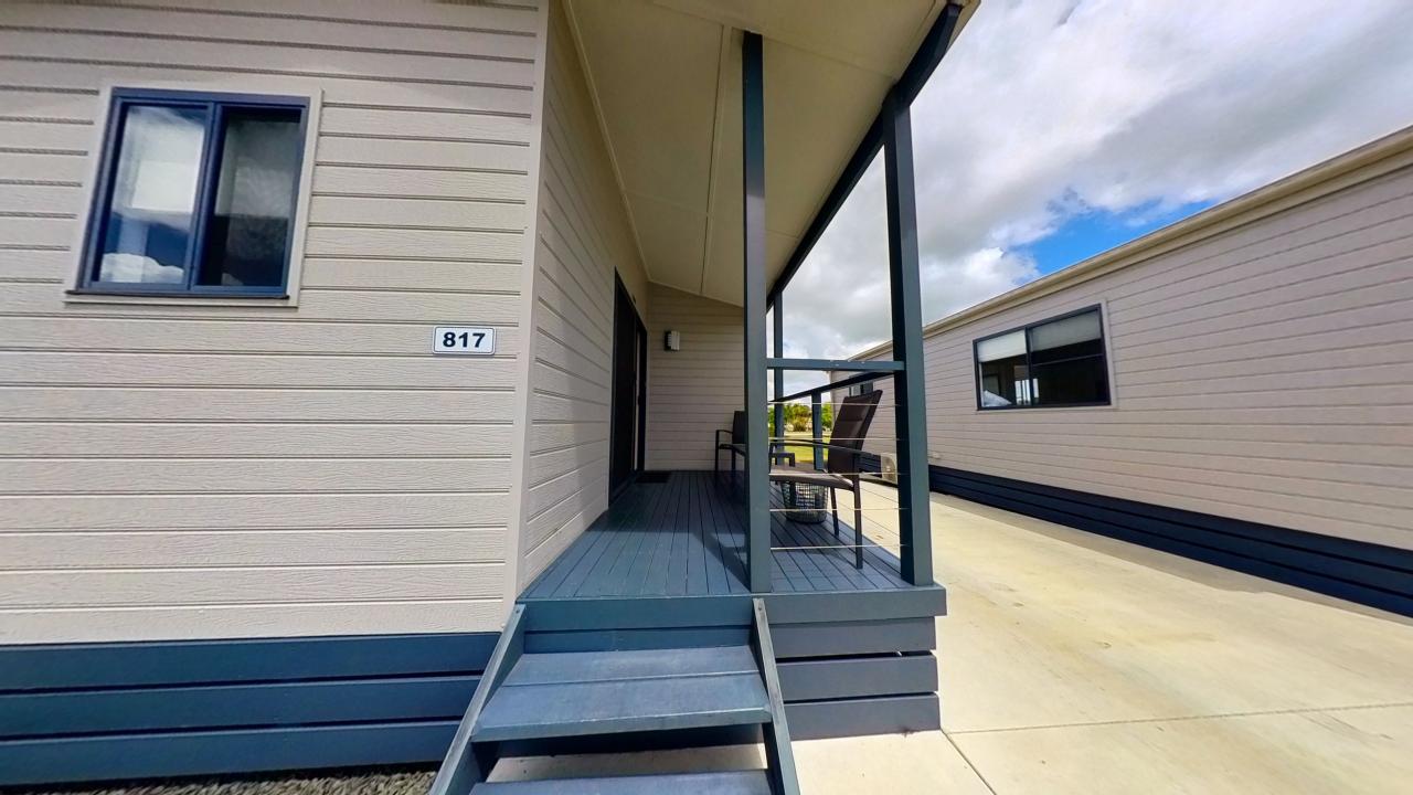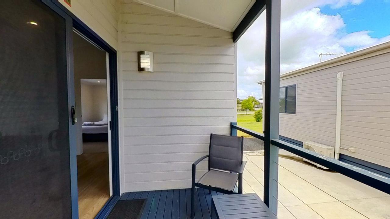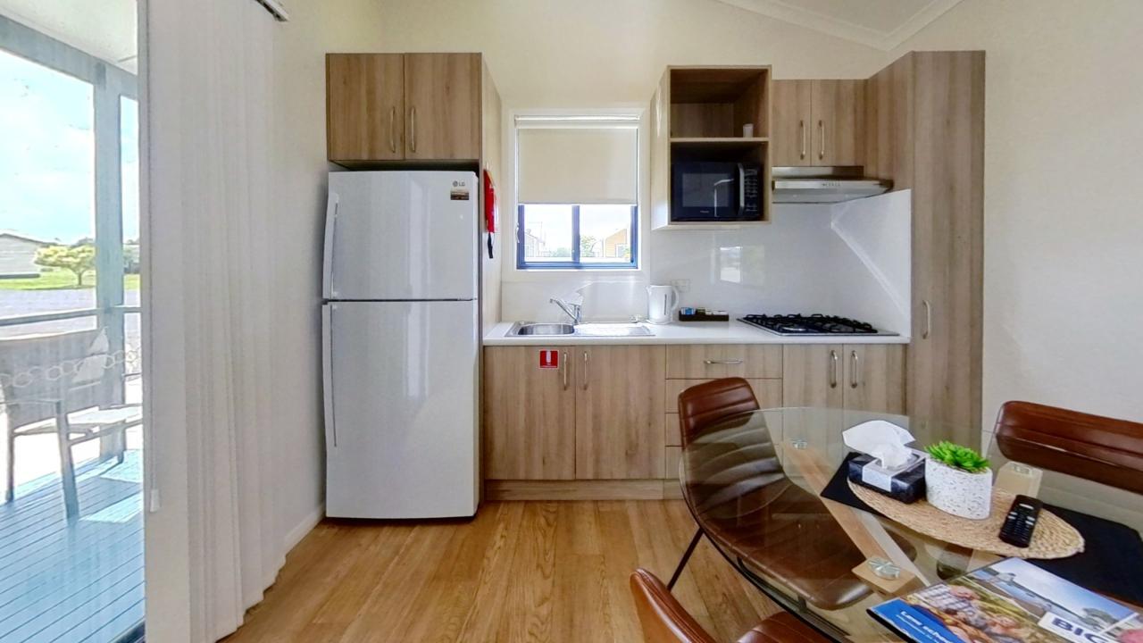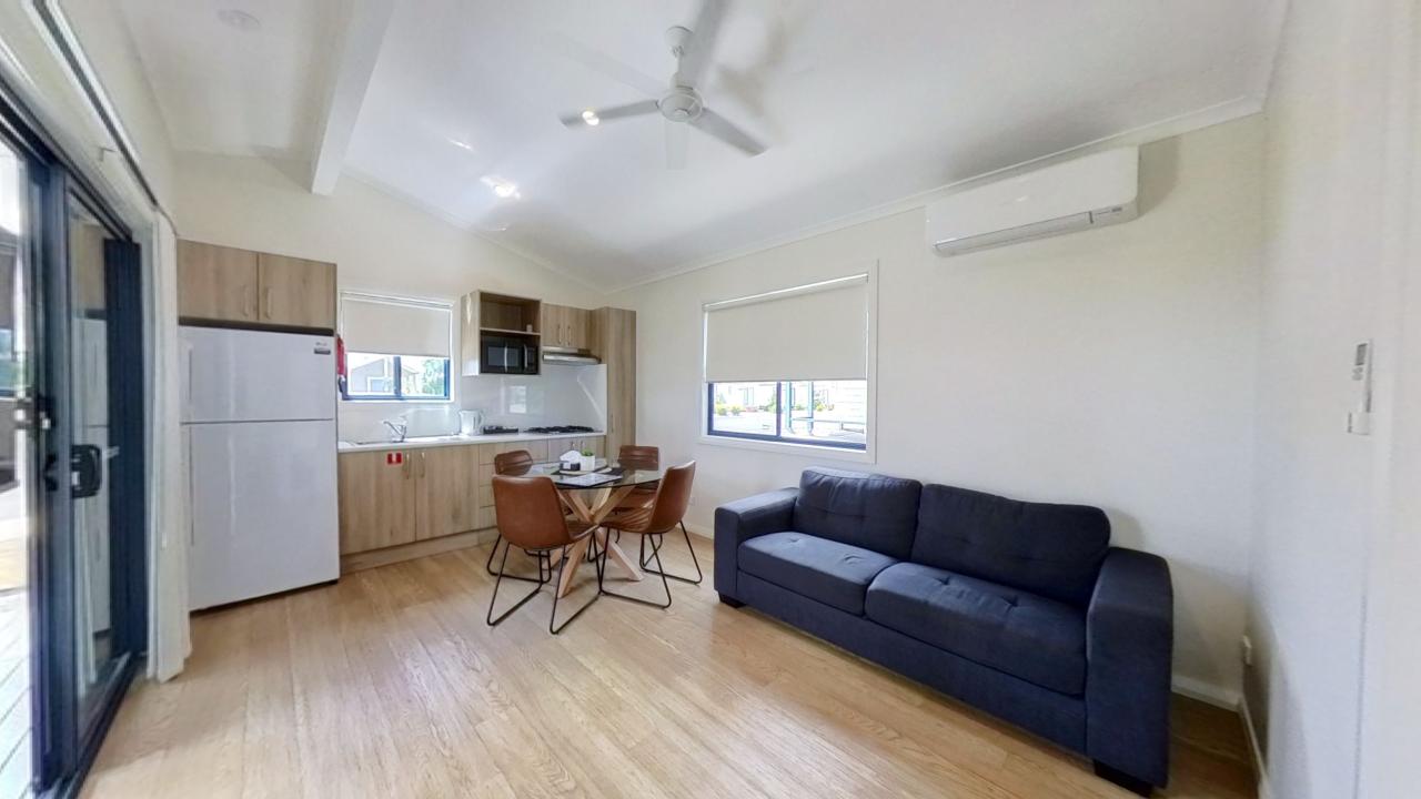 The air-conditioned living space includes a dining area and TV, while the kitchen comes equipped with an electric cooktop, microwave, and full-size fridge. A spacious undercover deck adds a relaxing outdoor touch.