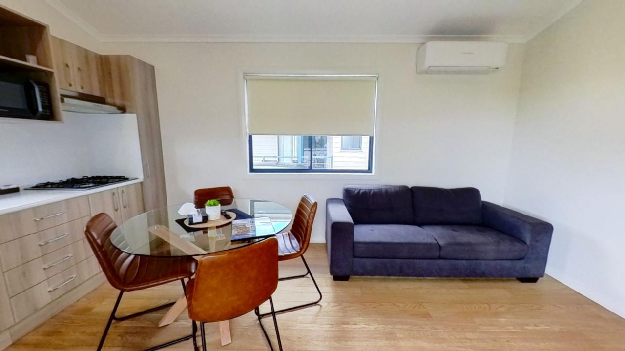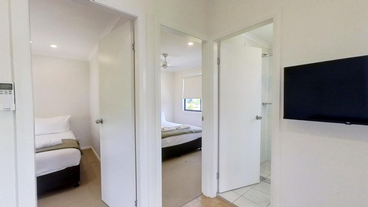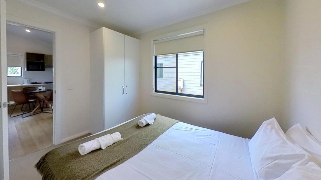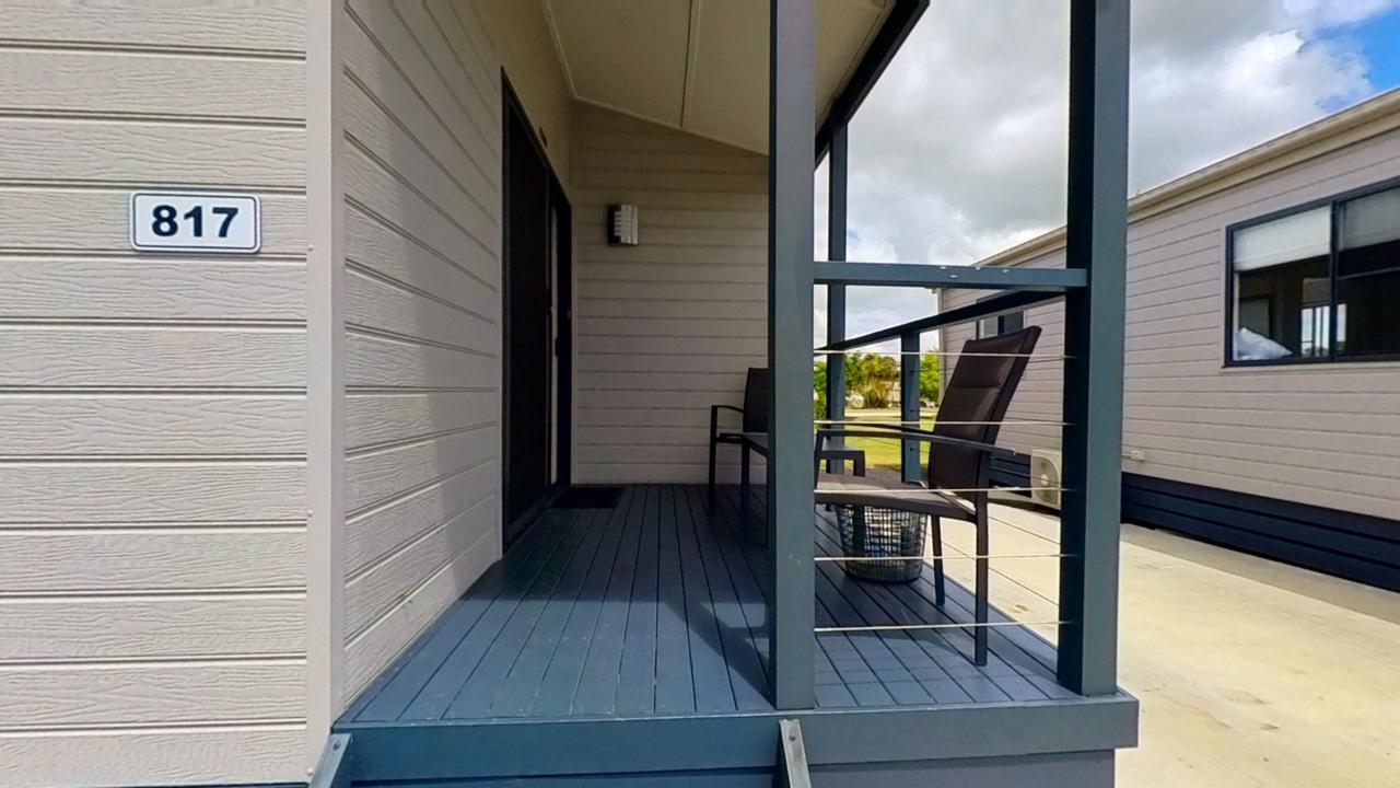 The air-conditioned living space includes a dining area and TV, while the kitchen comes equipped with an electric cooktop, microwave, and full-size fridge. A spacious undercover deck adds a relaxing outdoor touch.