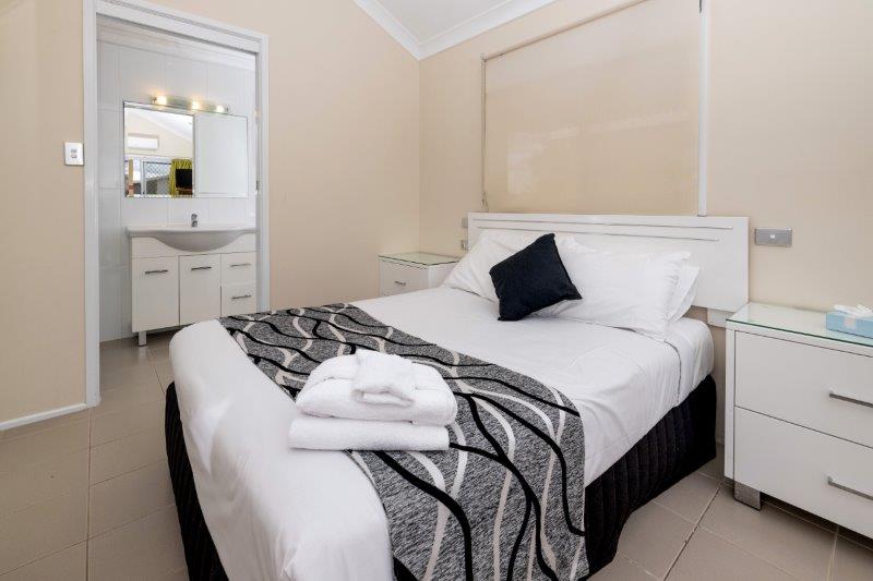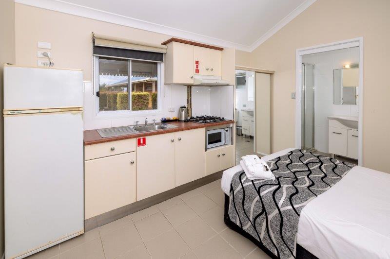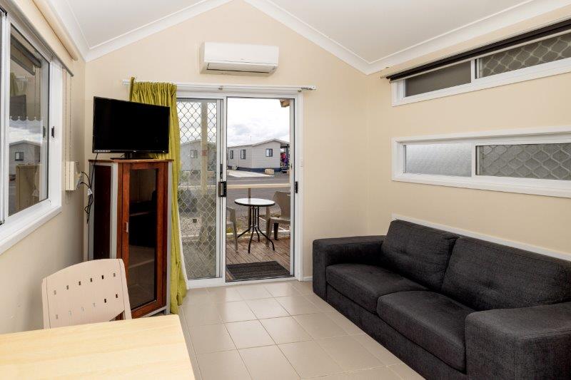 Perfect for singles or couples, this studio cabin features a queen bed, private bathroom, and open-plan layout.