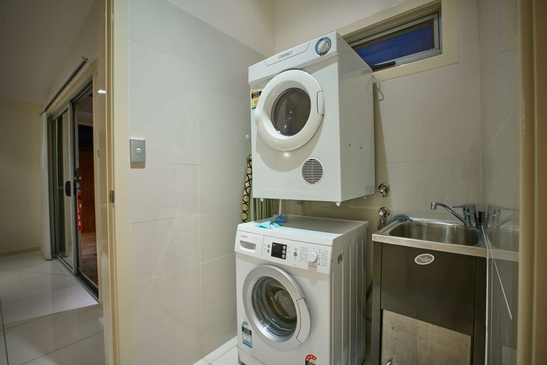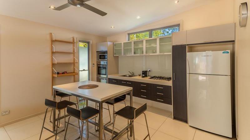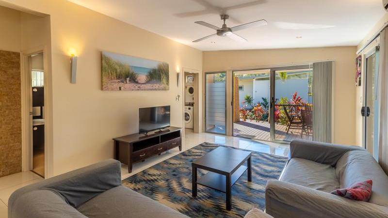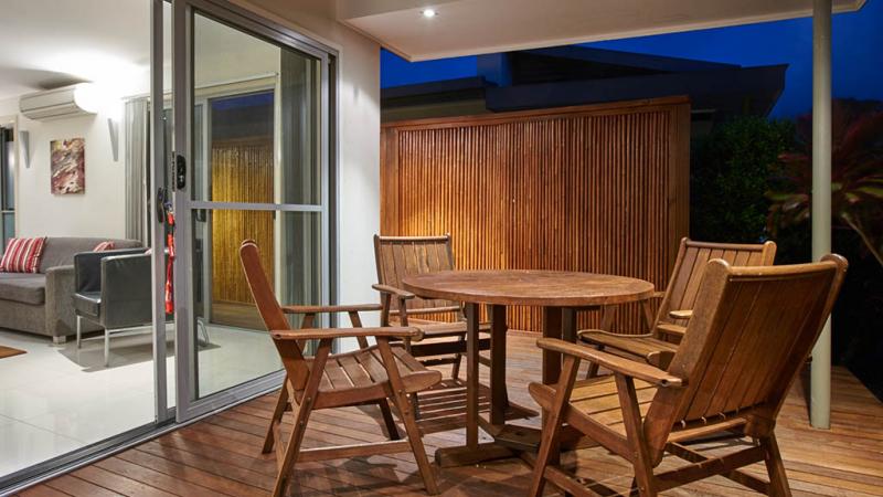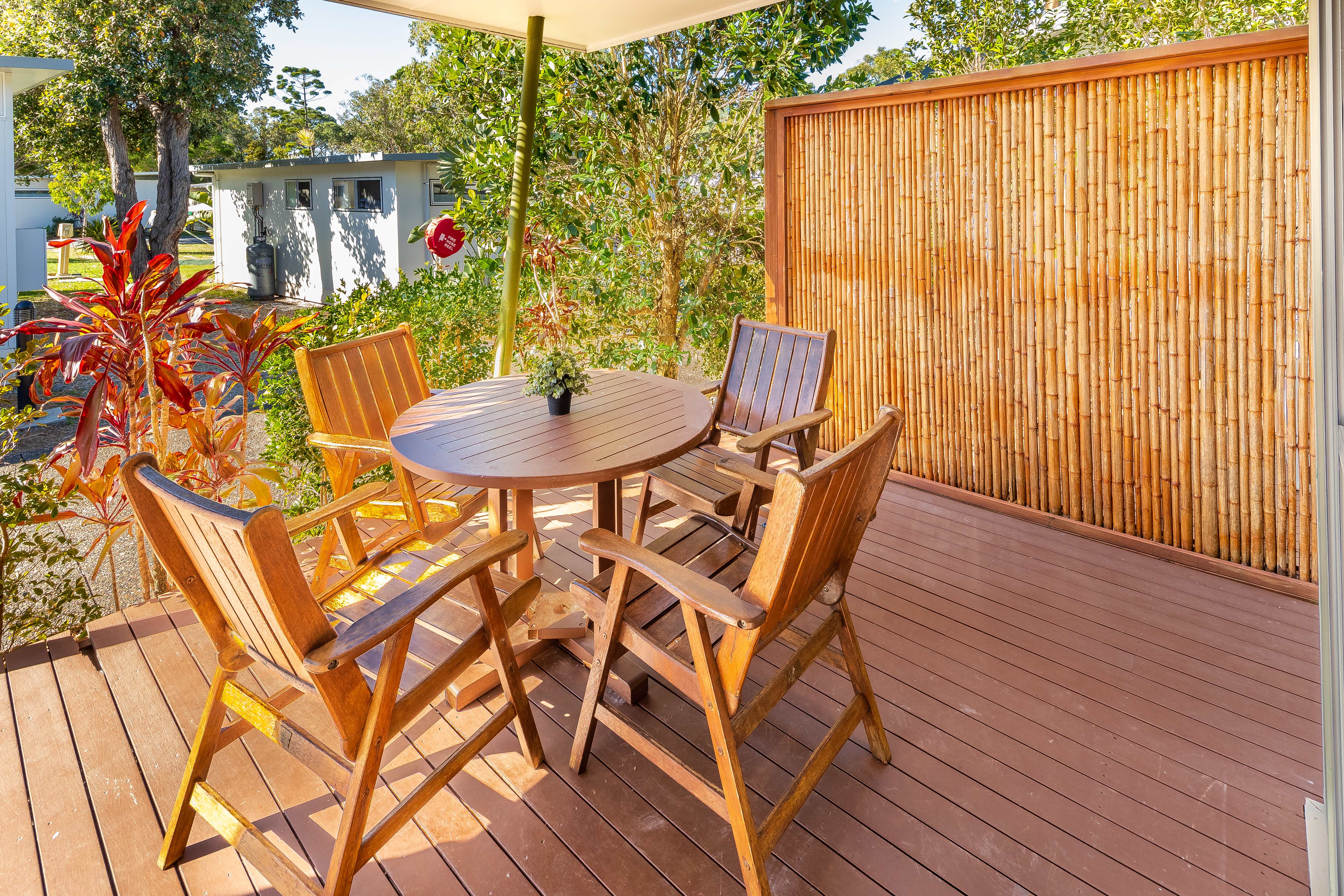 Our Coastal Family Villas sleep up to six guests with a queen bed in the main bedroom with an ensuite bathroom and two bunks in the second bedroom, as well as a living area, kitchen, laundry facilities, private deck, and undercover parking.