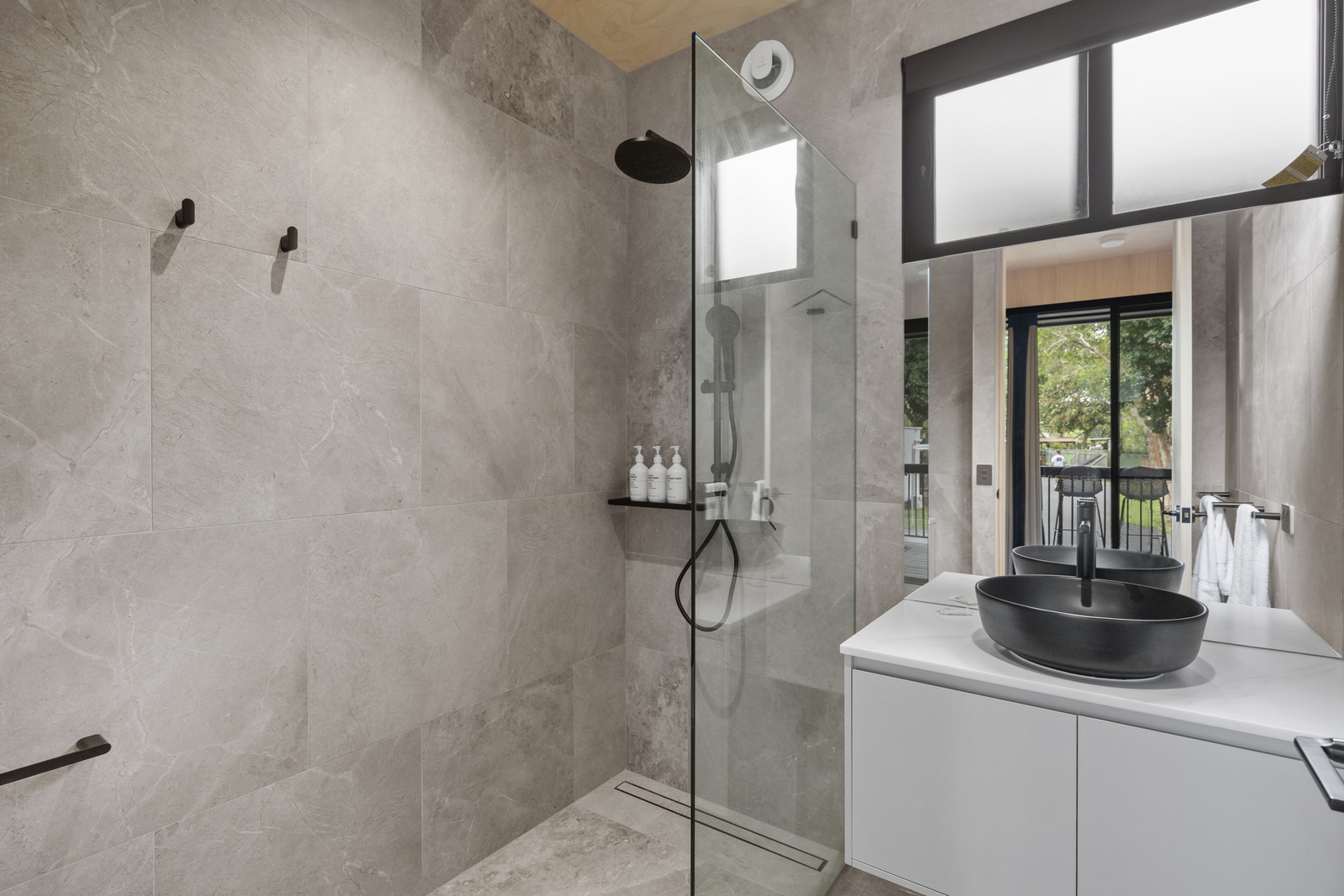 Enjoy a unique and modern duplex cabin stay. Our Studio Pod sleeps up to two guests with a queen bed in the main bedroom, as well as a bathroom, living area, kitchen, and deck with BBQ.