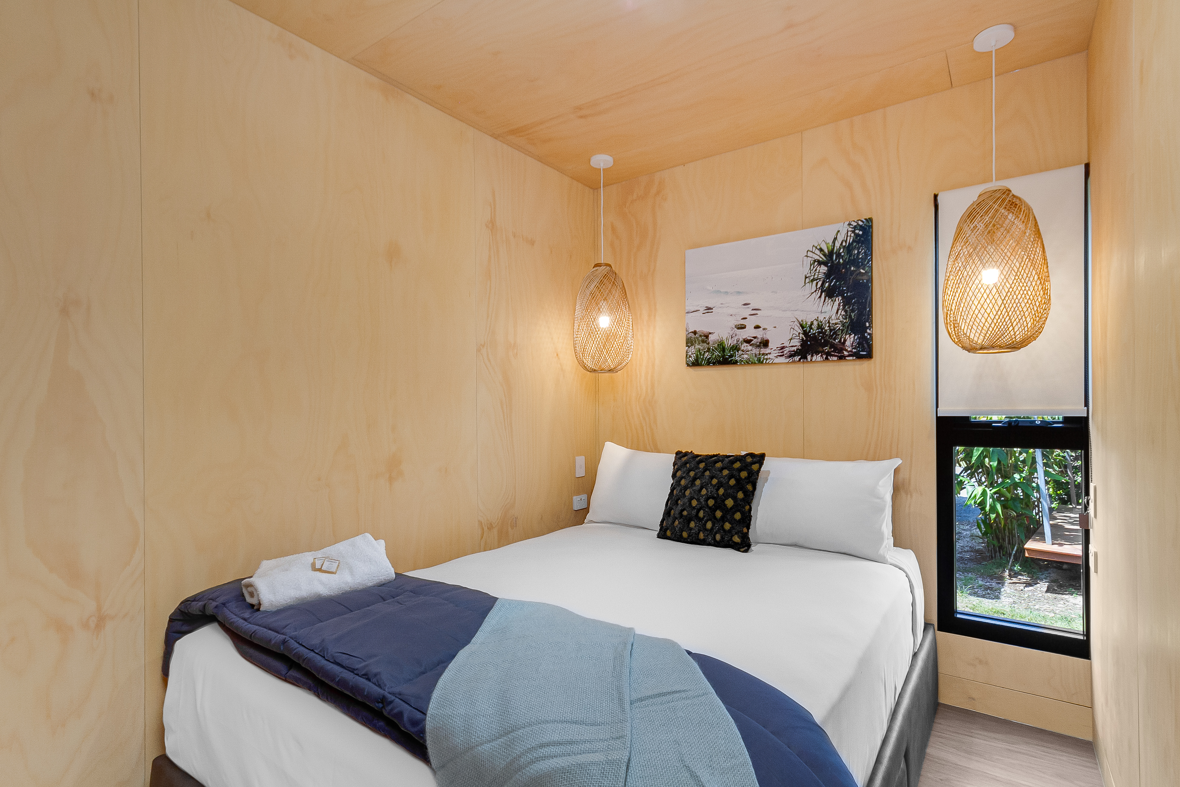 A stylish, minimalistic and sustainable stay, designed to complement the natural landscape with natural materials and finishes, and encompassing thermal efficiency and climate control. Our Eco Pavillion Pods sleep up to four guests with a queen bed in the open plan main bedroom and a set of bunk beds in the open plan second bedroom, a spacious bathroom, living area, kitchenette, and private deck.
