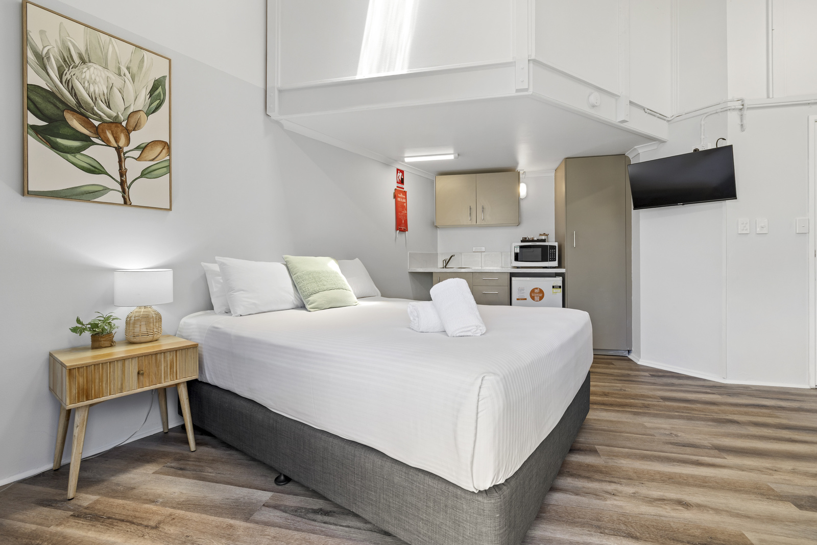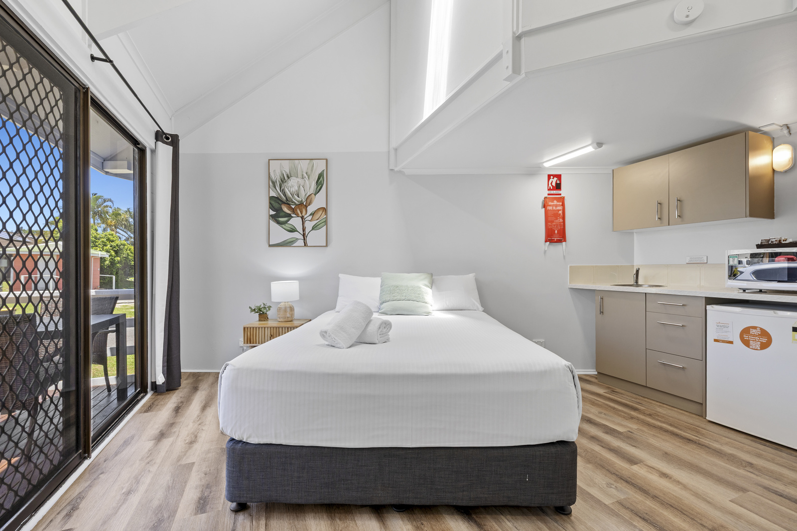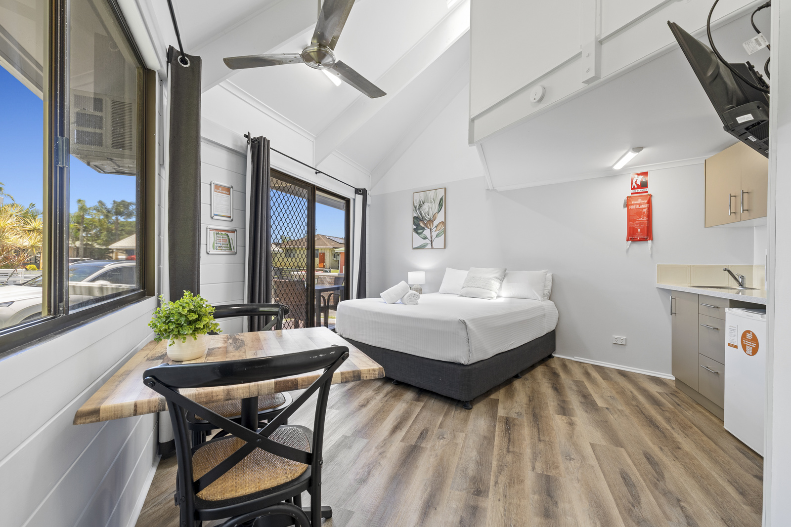 An open plan and modern stay on a budget. Our Studio Cabins sleep two guests with a queen bed in the open plan kitchen and living area, as well as an ensuite bathroom and a private deck.
