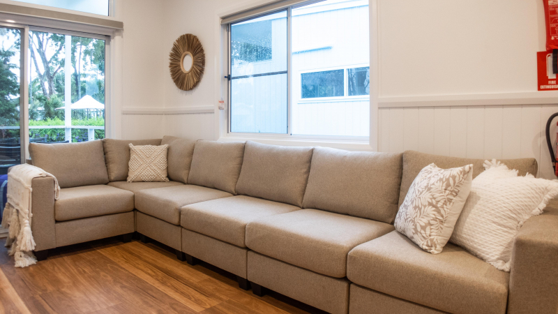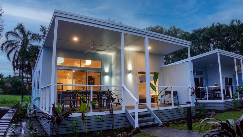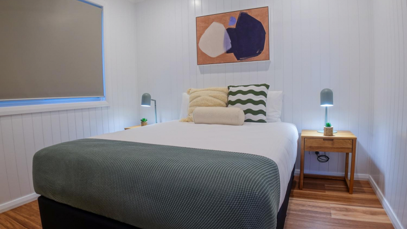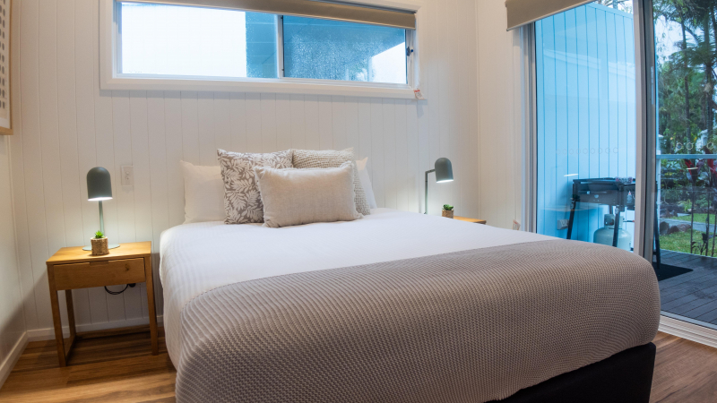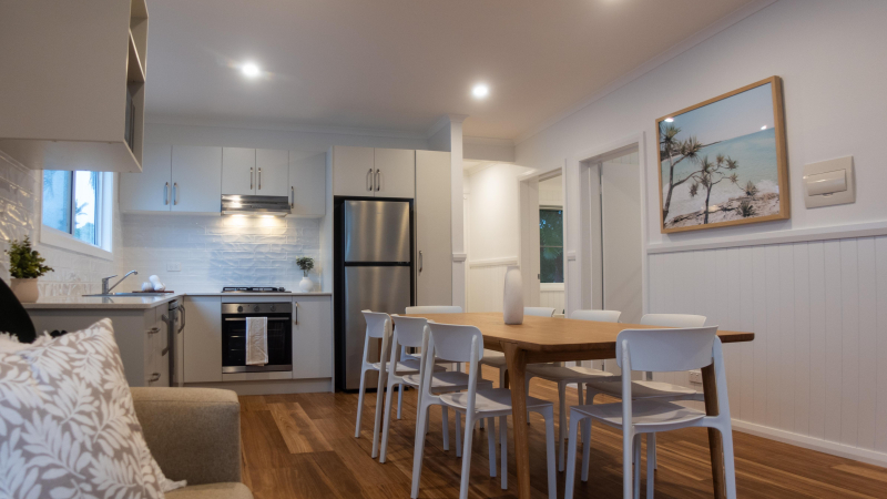 Ideal for larger families or groups, these cabins sleep up to eight guests and feature two rooms with queen beds and a third bedroom with 2 x bunk beds. They boast two full-size bathrooms, a fully equipped kitchen with stone benchtops, and raked ceilings that, together with highlight windows, fill the space with plenty of natural light. The large, oversized decks provide the perfect setting for family gatherings, and top-of-the-line appliances, including a washing machine and dryer, add to the convenience. Direct access to the pool and a location in a brand-new precinct of the park make these cabins an exclusive retreat.