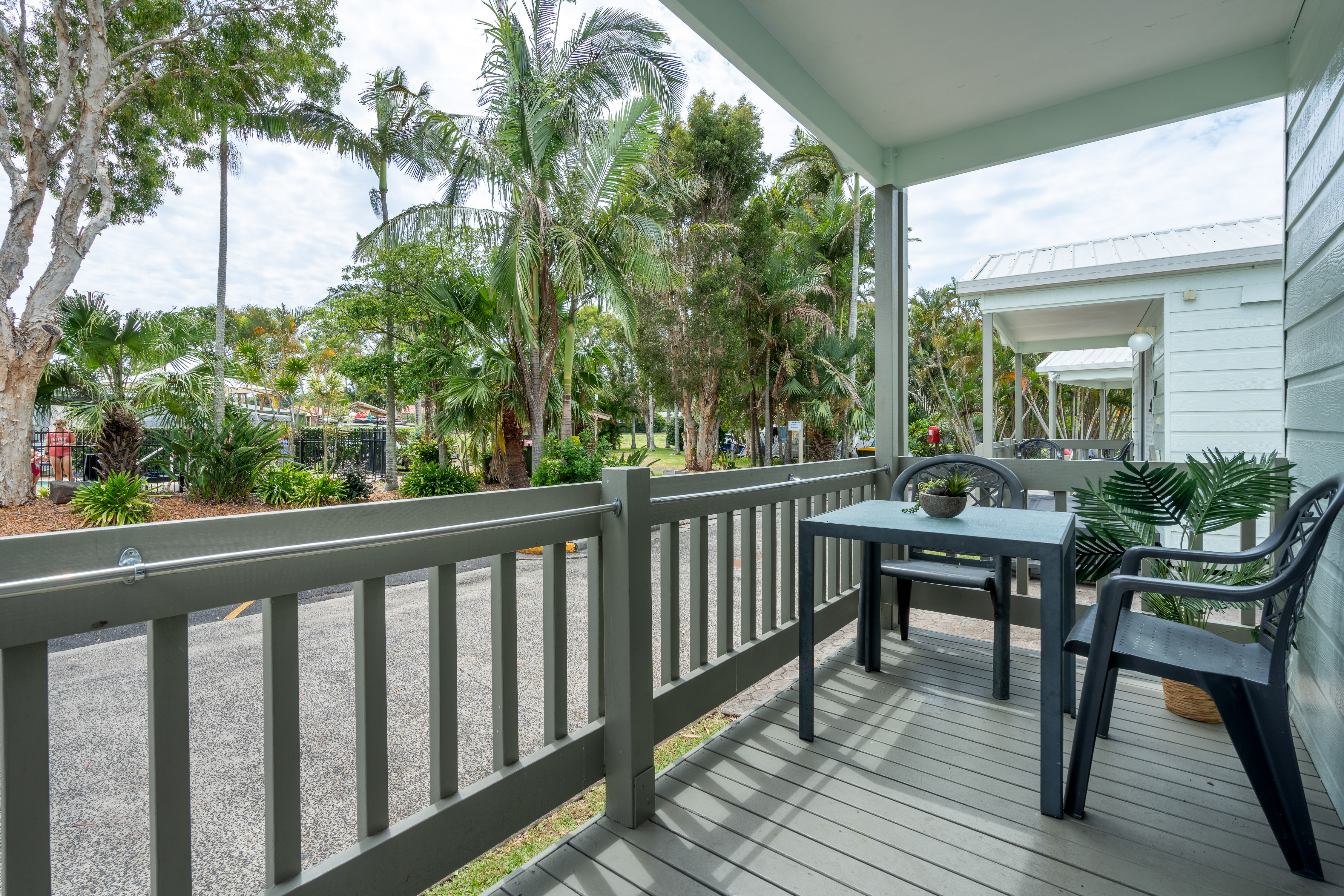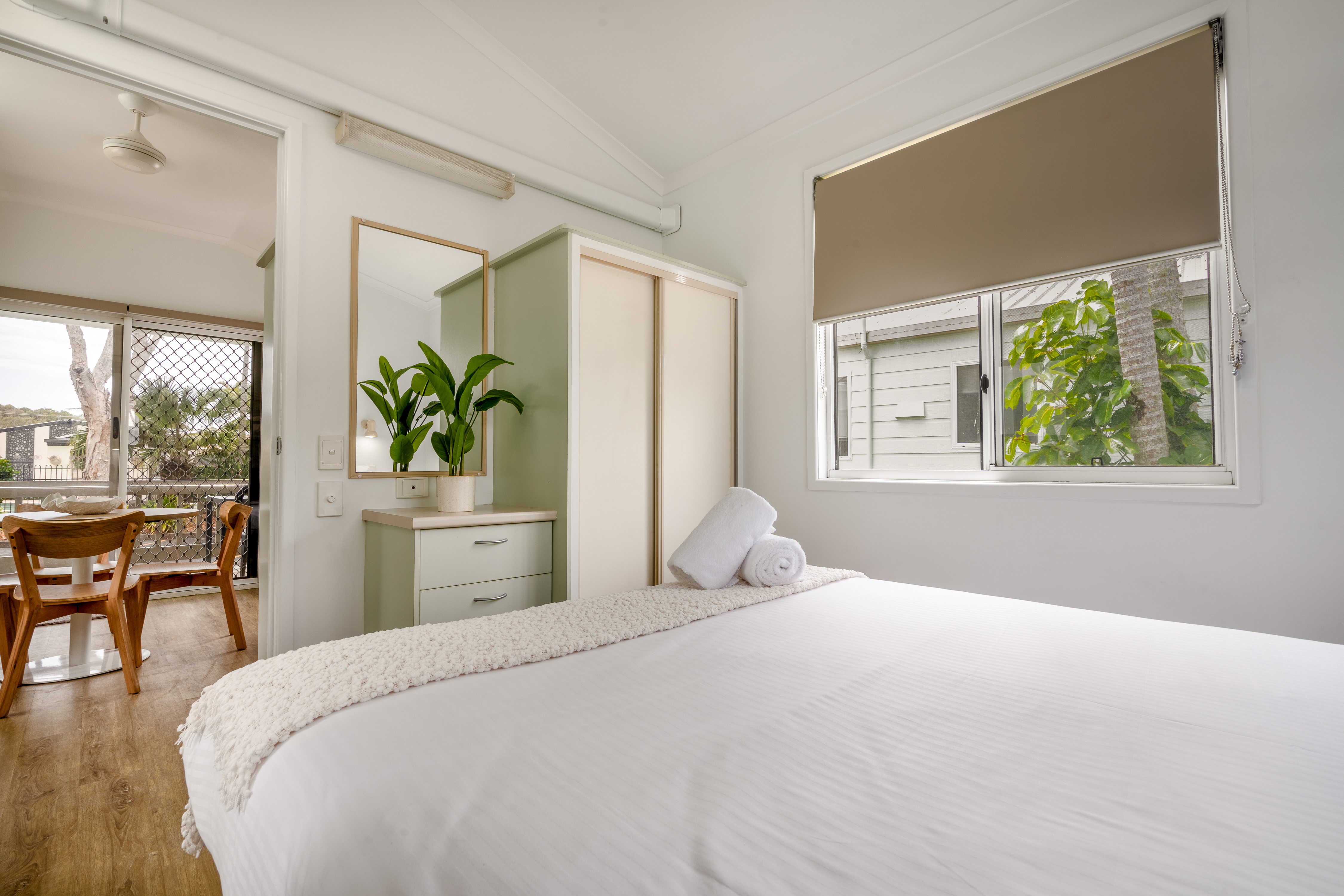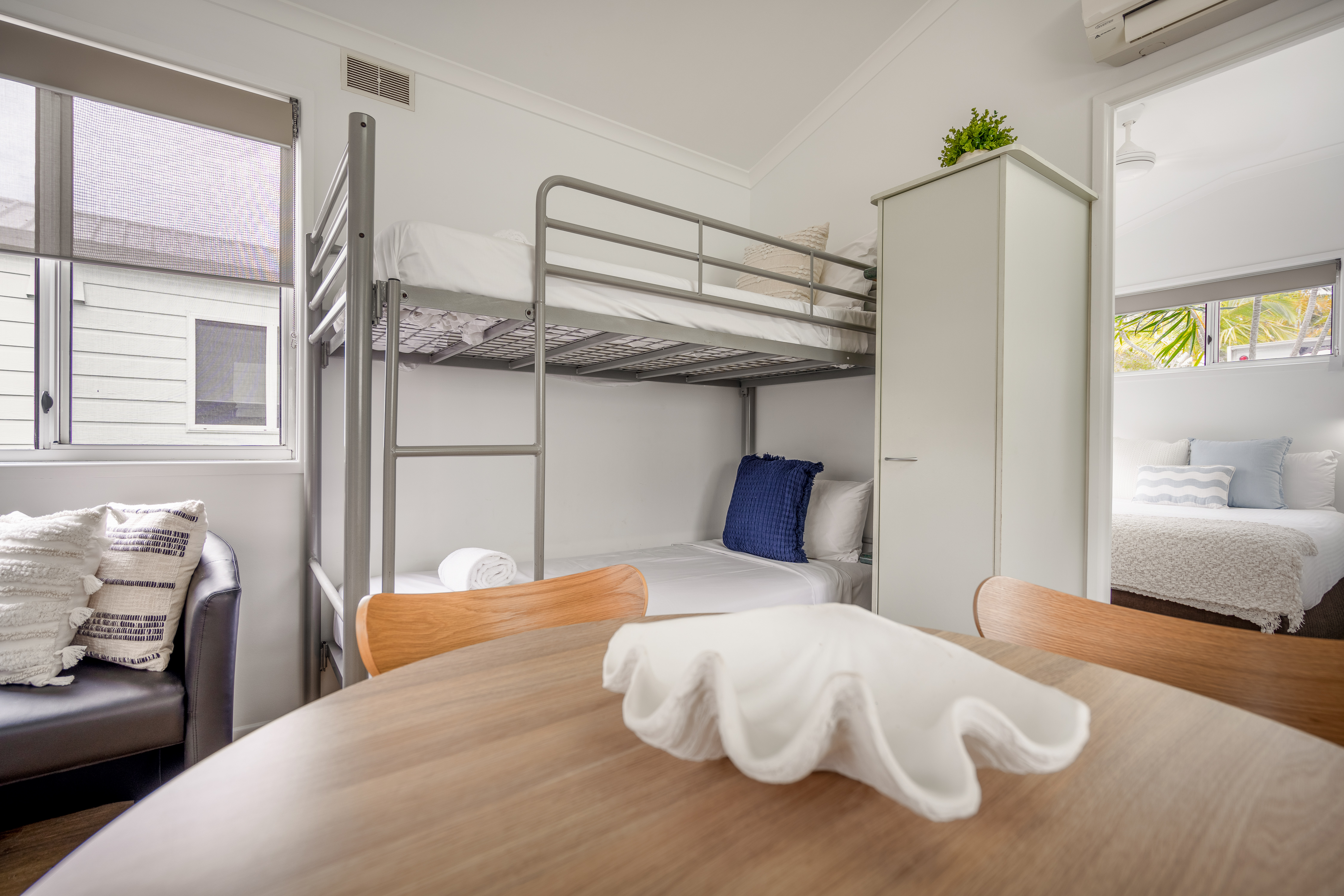 Ensuite cabin with queen size bed in a separate bedroom sleeping 4. Bunks (suitable for 2 children) are located in kitchen/living room area with linen supplied to all beds. Fully Air conditioned with Ceiling fans. Full size fridge, gas oven & microwave. Smart TV. Deck with outdoor furniture. A/C.