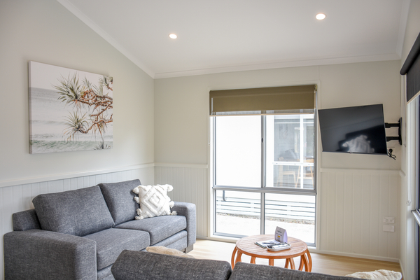 Our two bedroom Driftwood Lodge has a king size bed in the main bedroom and two sets of single bunks in the second bedroom. Bathroom has a spacious shower and separate toilet. The lodge has a fully equipped kitchen and open plan lounge area and BBQ with outdoor setting on the patio.