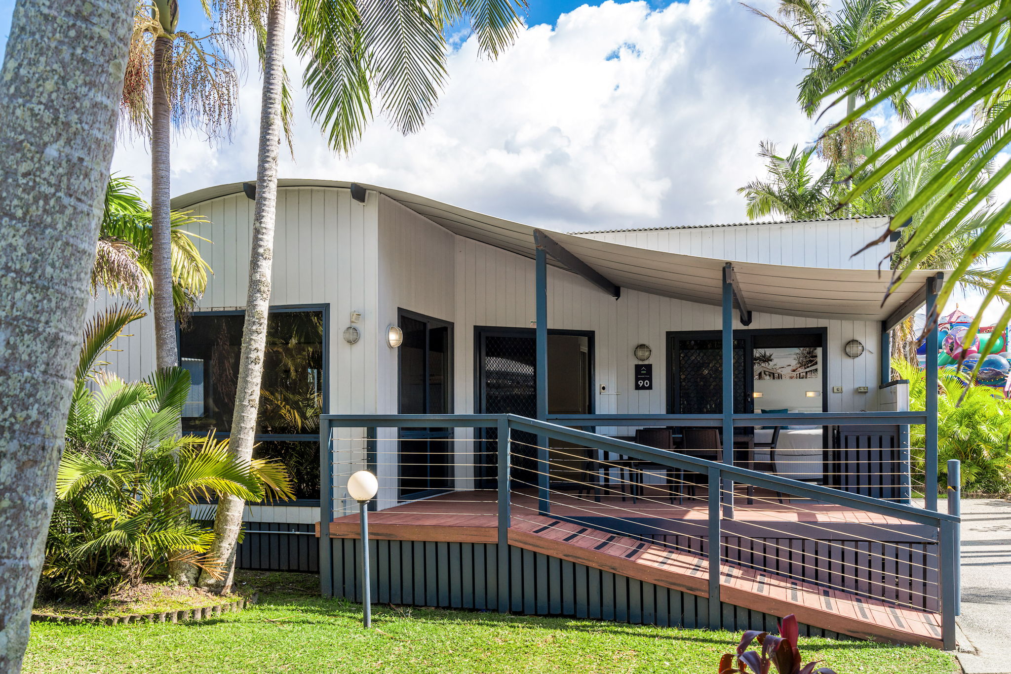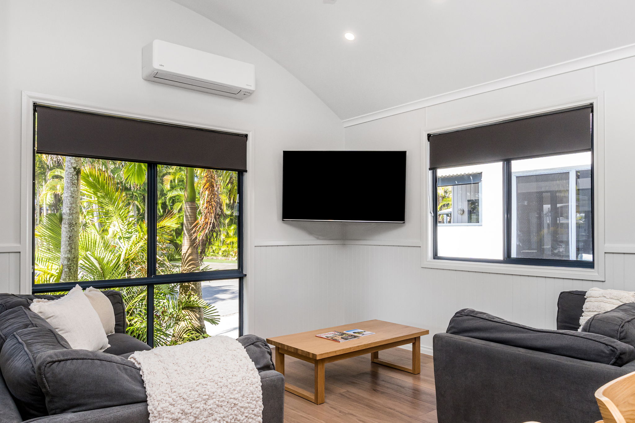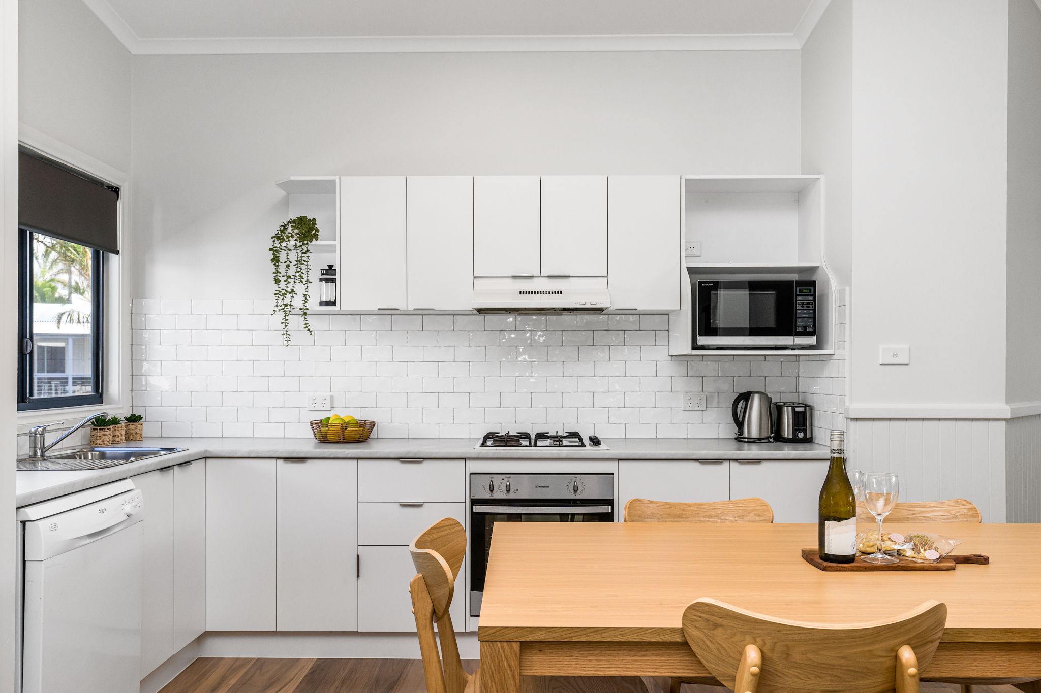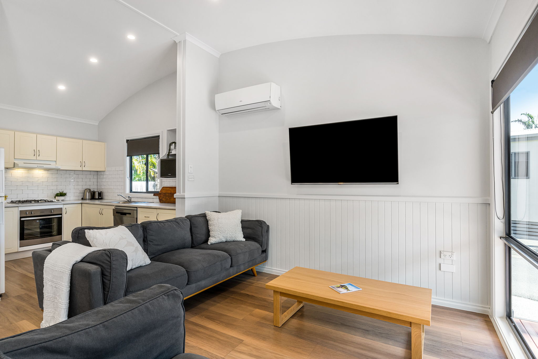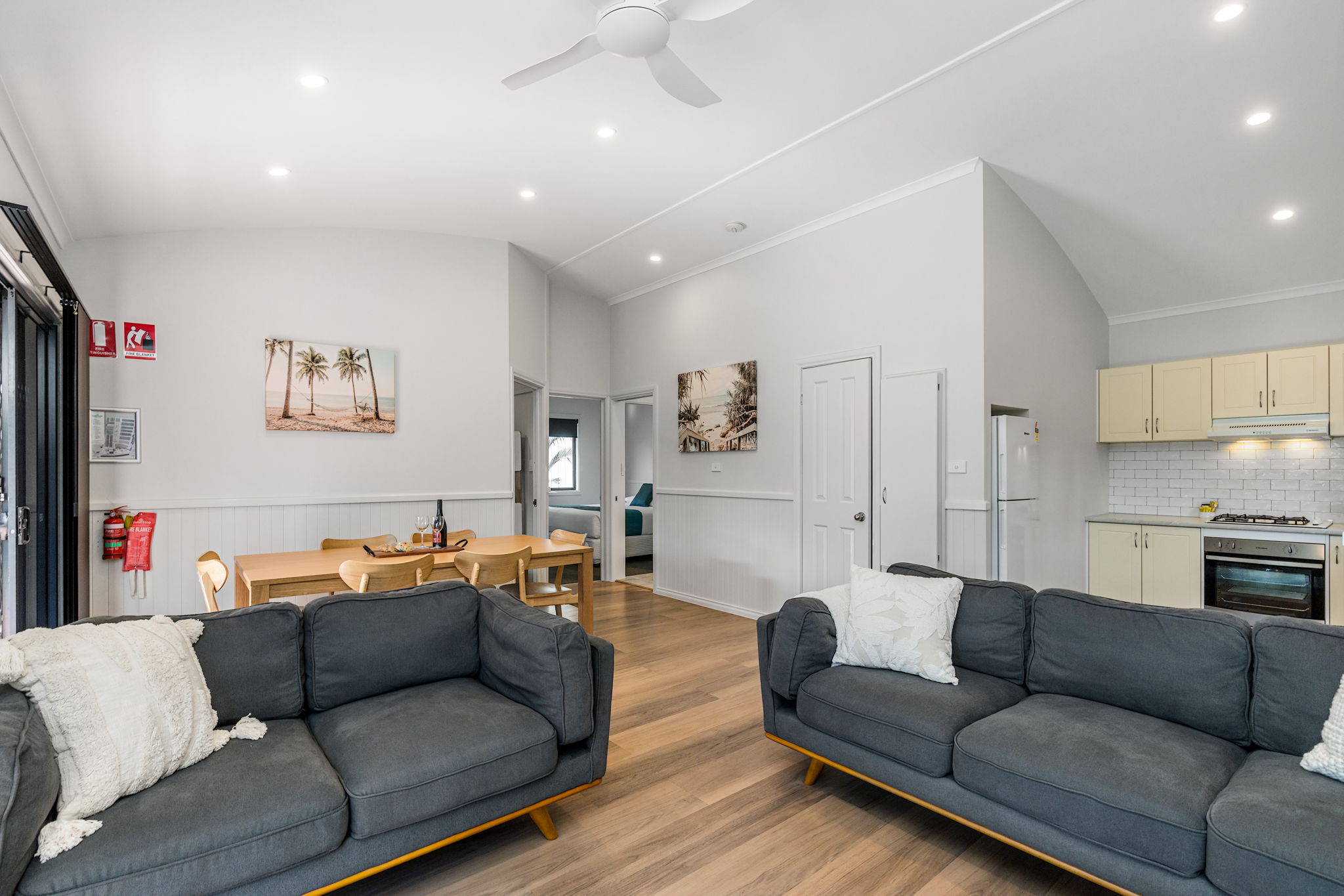 Our Grande Villas have two double bedrooms with a king in the main, queen and single bunks in the second bedroom. The villa has a bathroom with separate shower and bath, washing machine and dryer, fully equipped kitchen with a dishwasher, two TVs and is air-conditioned. There is a patio with a BBQ.