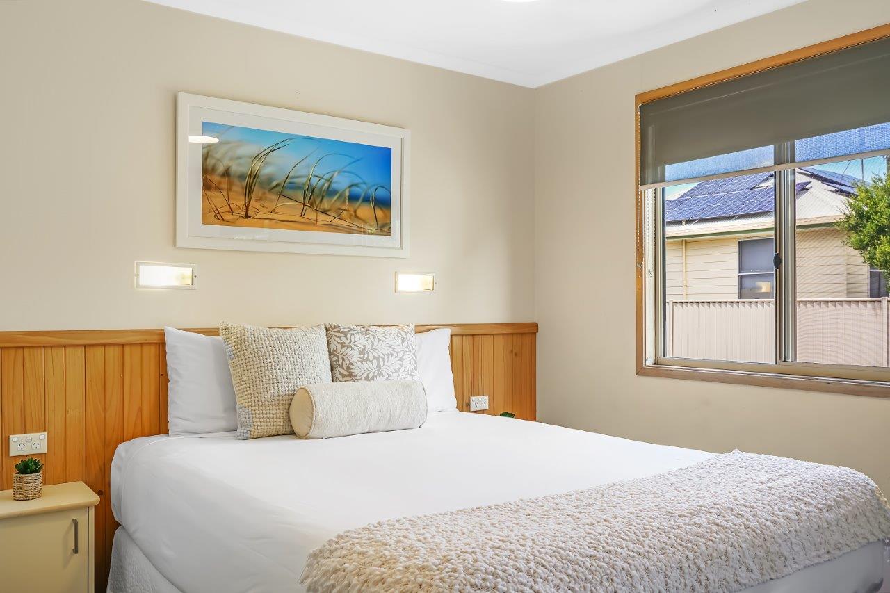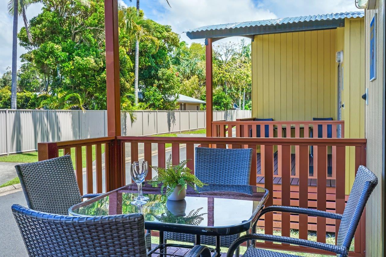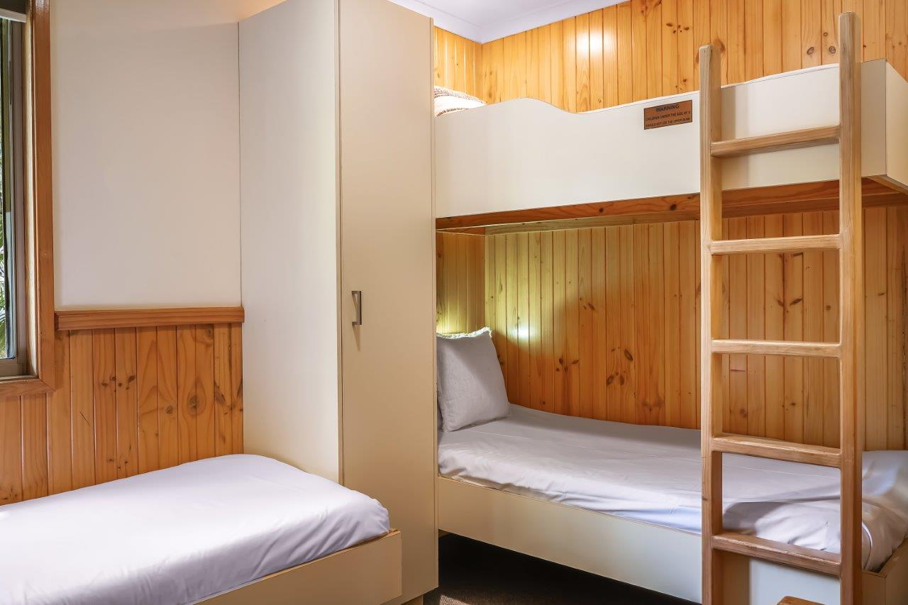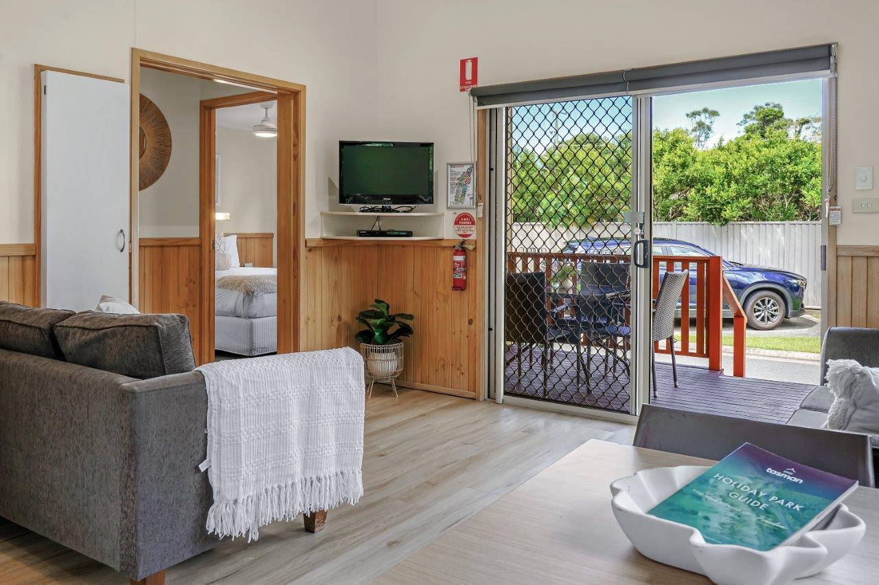 The two bedroom Holiday Lodge has a queen bed in the main bedroom and single bed and set of bunks in the second bedroom. This air-conditioned lodge has a TV and DVD player and a small patio.
