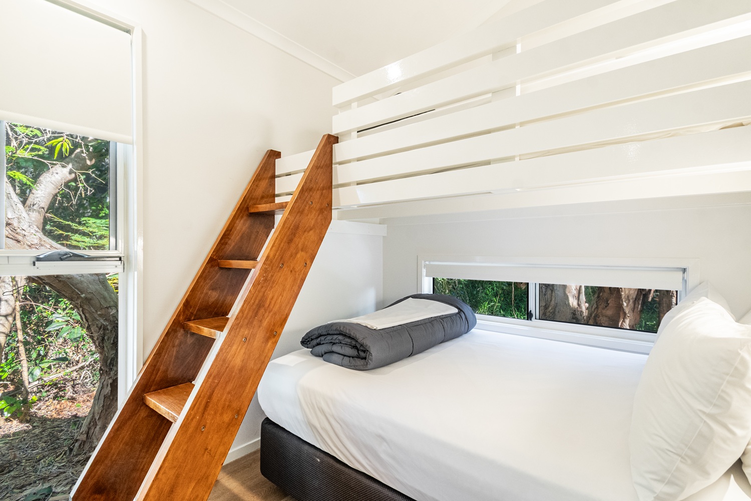 These cabins feature two separate bedrooms. The main room has a queen bed, the second room has a bunk with a double and single bed. All linen is provided and all beds are made.