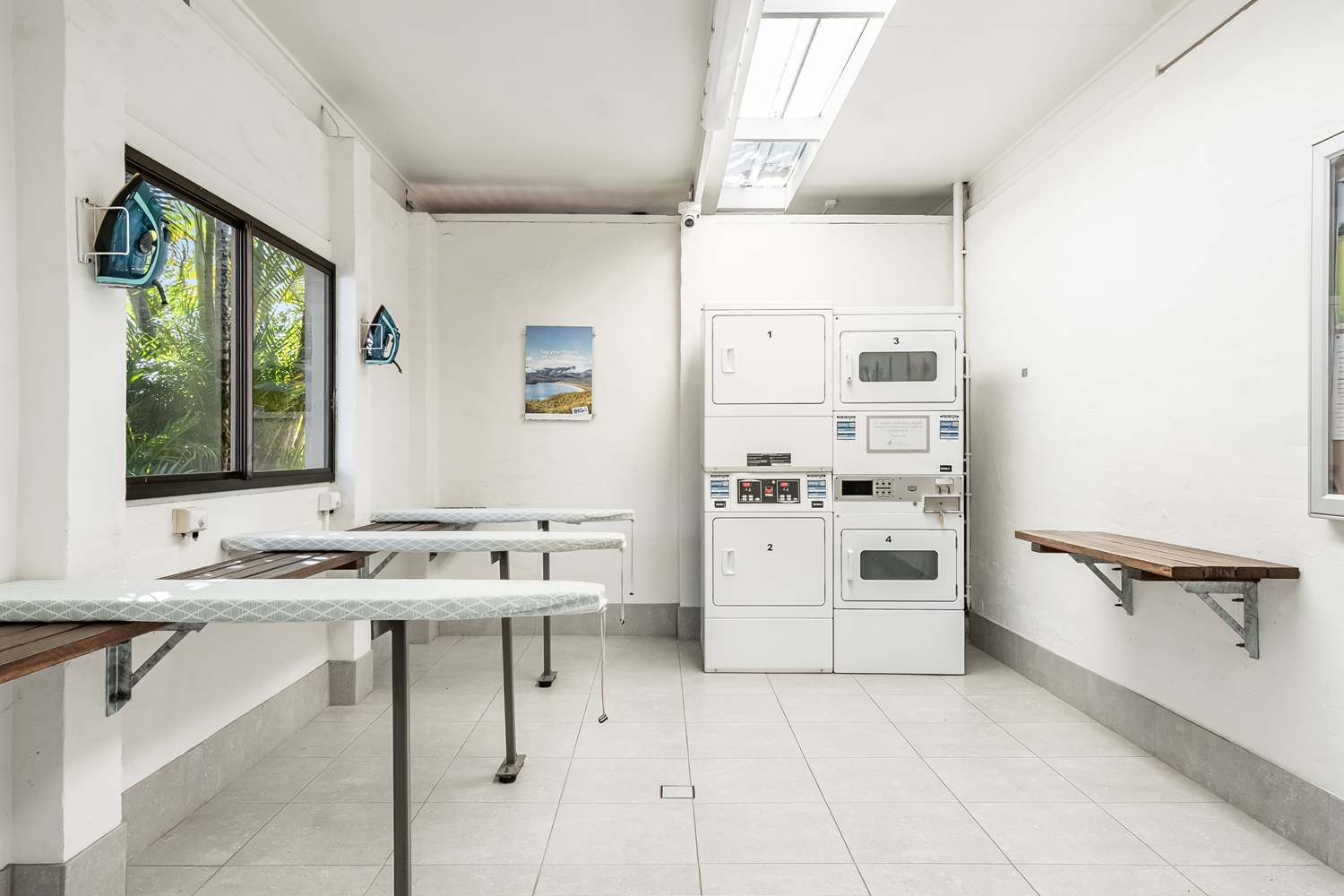 LAUNDRY: The laundry is located on the western side of the main amenities and is open from 8am-8pm. It has coin operated washing machines and dryers for your use. Please use the clothes drying lines behind the laundry. Erecting temporary clothes lines on your site/accommodation is not permitted. Ironing boards are also located in the laundry. Washing powder is available to purchase at reception. All children under 12 years must be accompanied by an adult and be supervised at all times in the amenities and laundry areas.