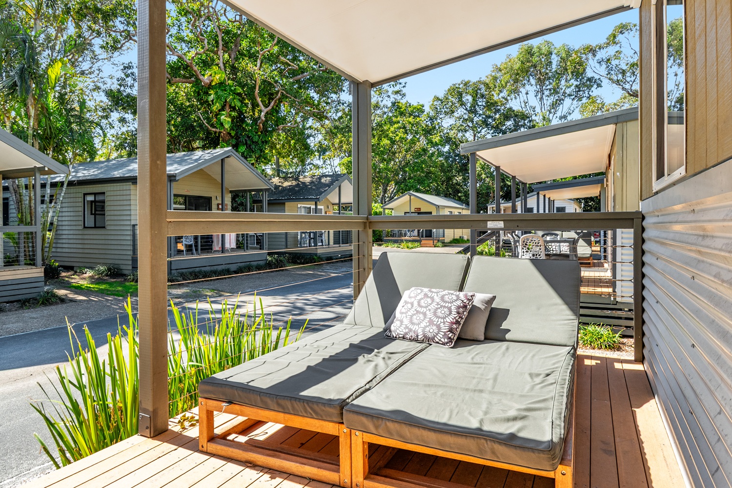 These great family cabins have two bedrooms and are situated close to the pool with a large sunny balcony with a day bed.
