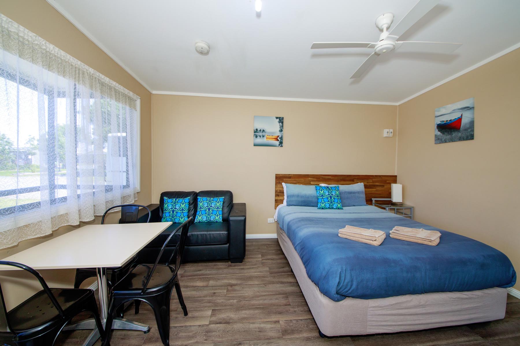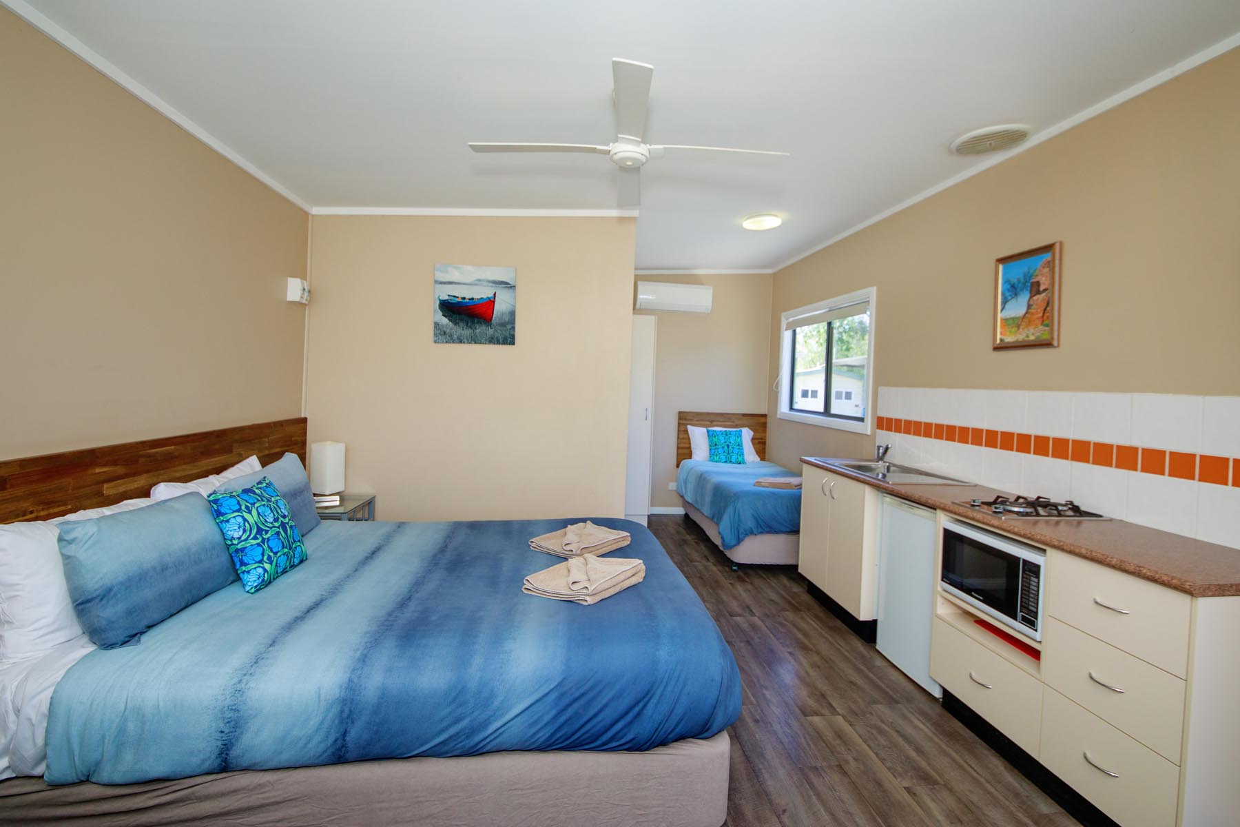 Our Deluxe Studios are designed for 2 or 3 people. They boast the latest in facilities and amenities including split system air conditioning/heating & gas hot water. They are fully self contained, including cooking utensils and facilities, crockery, cutlery, heating, air conditioning, indoor and alfresco dining area, LCD TV and full ensuite. All linen for all three beds and the bathroom is supplied.