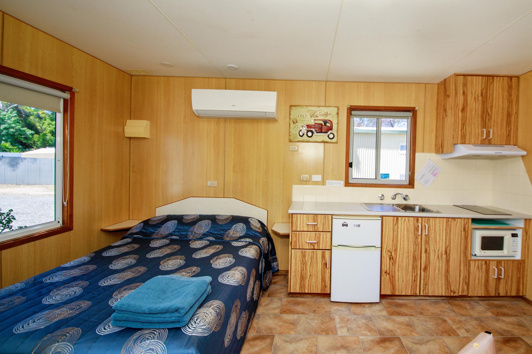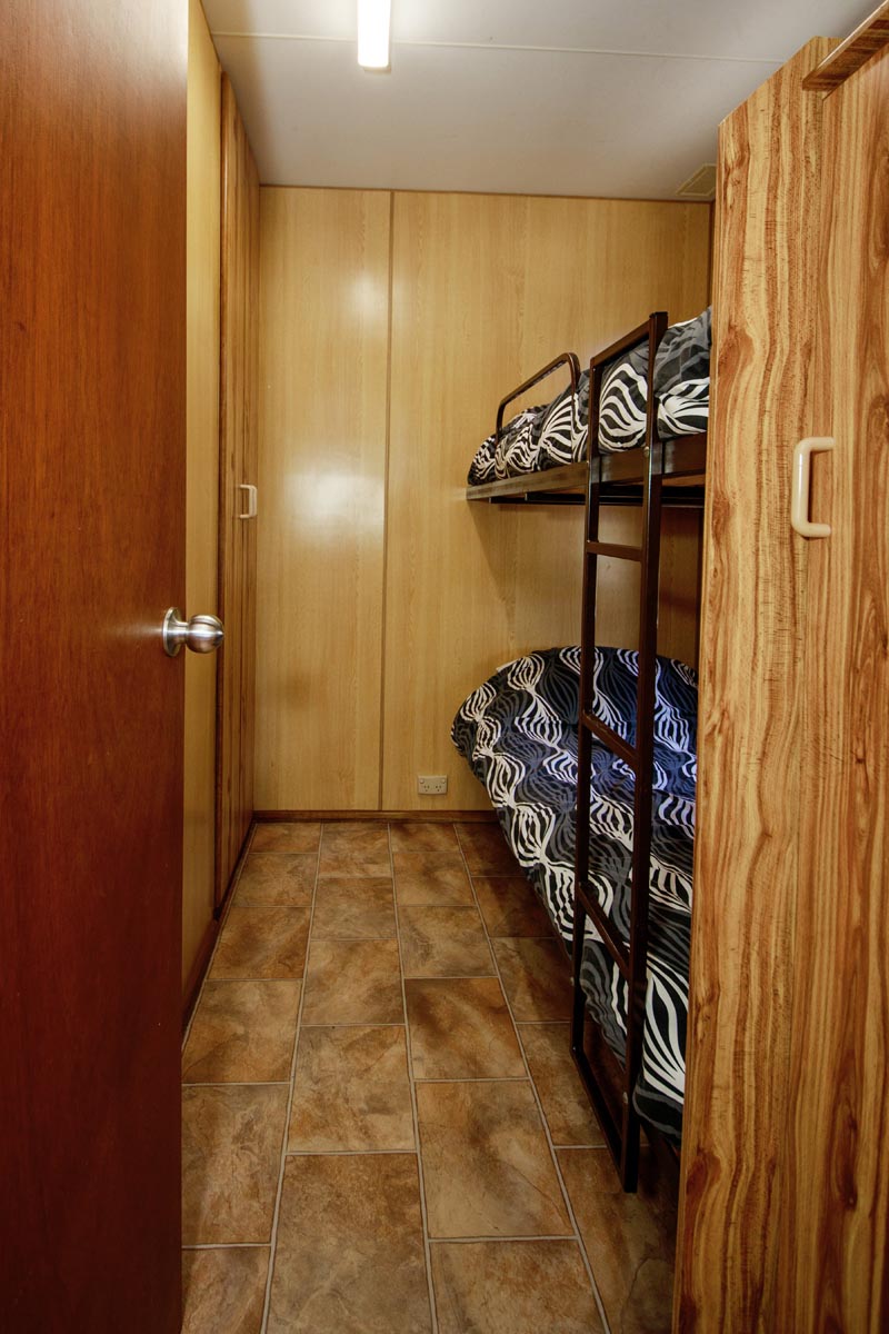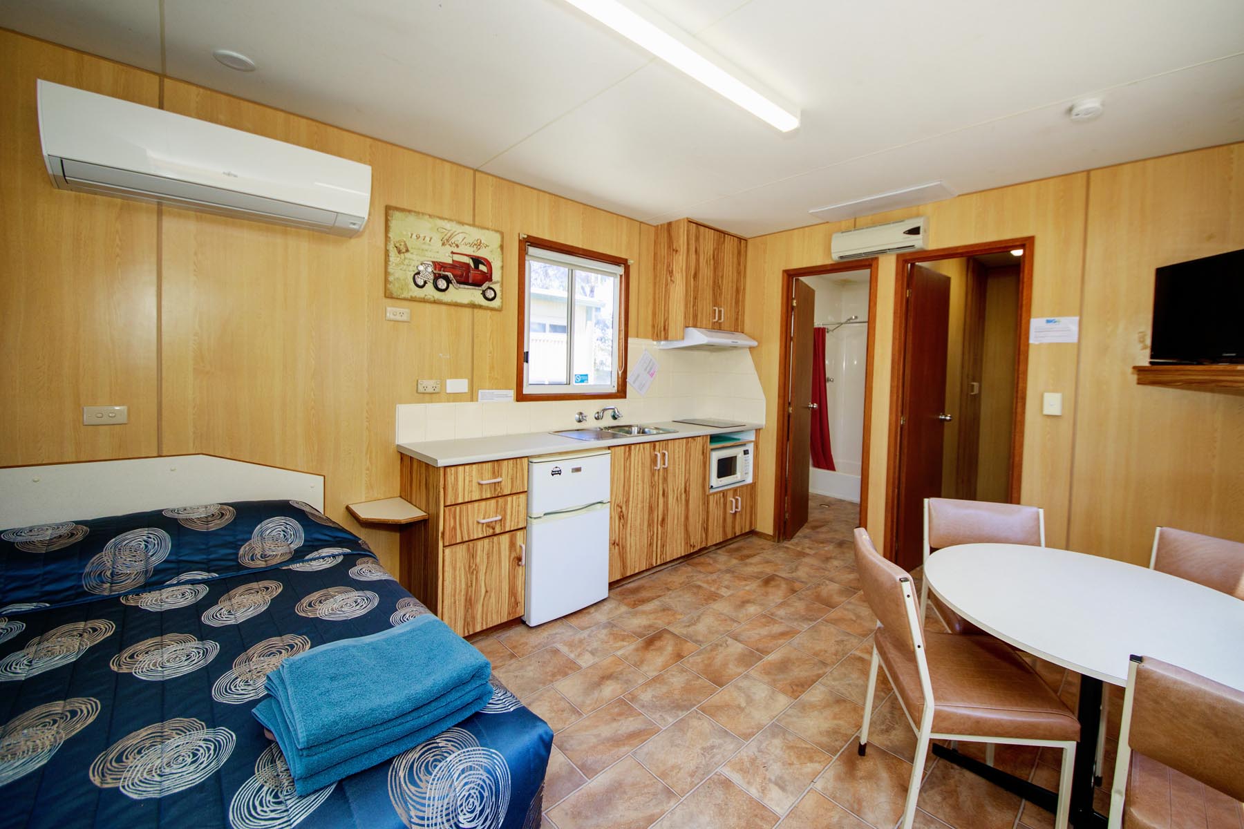 Our Holiday Cabins provide an ideal stay for couples, travelling alone or with small children. The central room contains a double bed along with the open plan kitchen dining area. A separate room contains the double bunks. Full self contained kitchen, air conditioned and quiet location. Full ensuite bathroom.