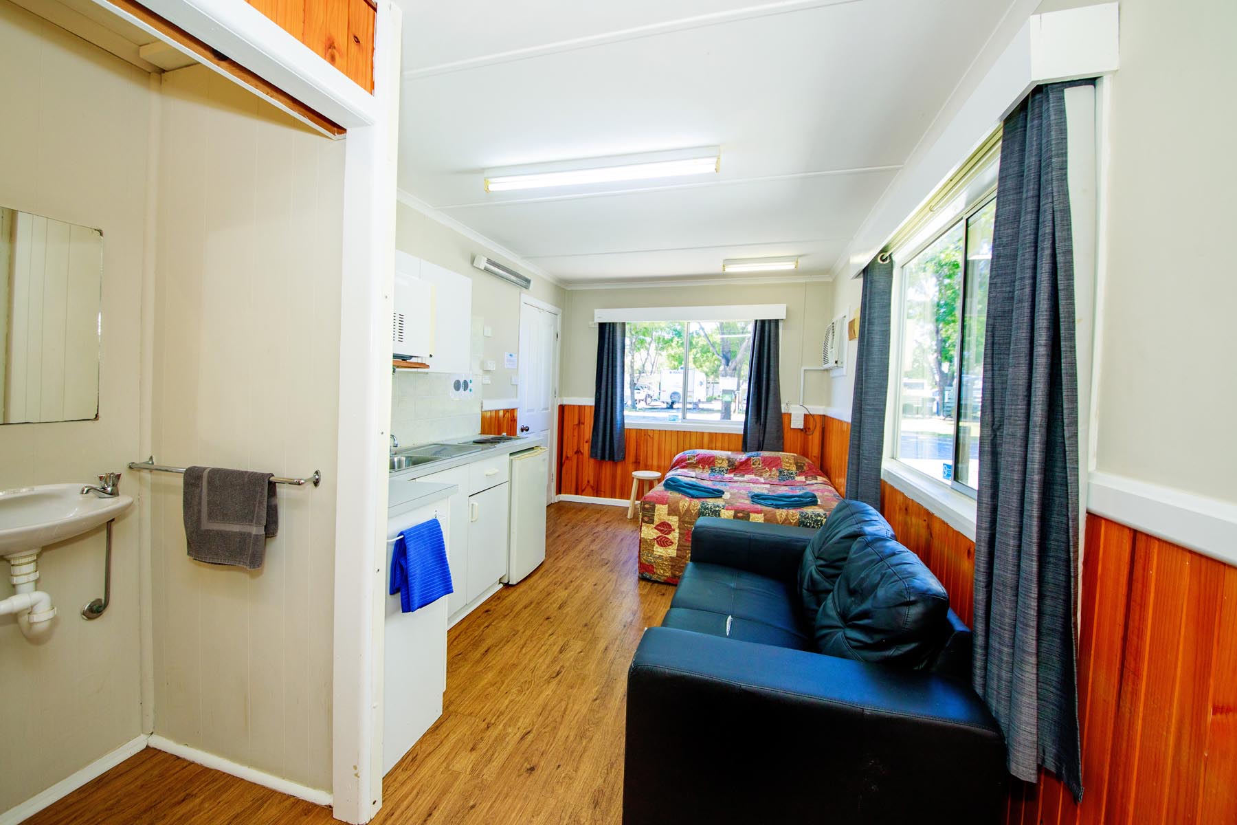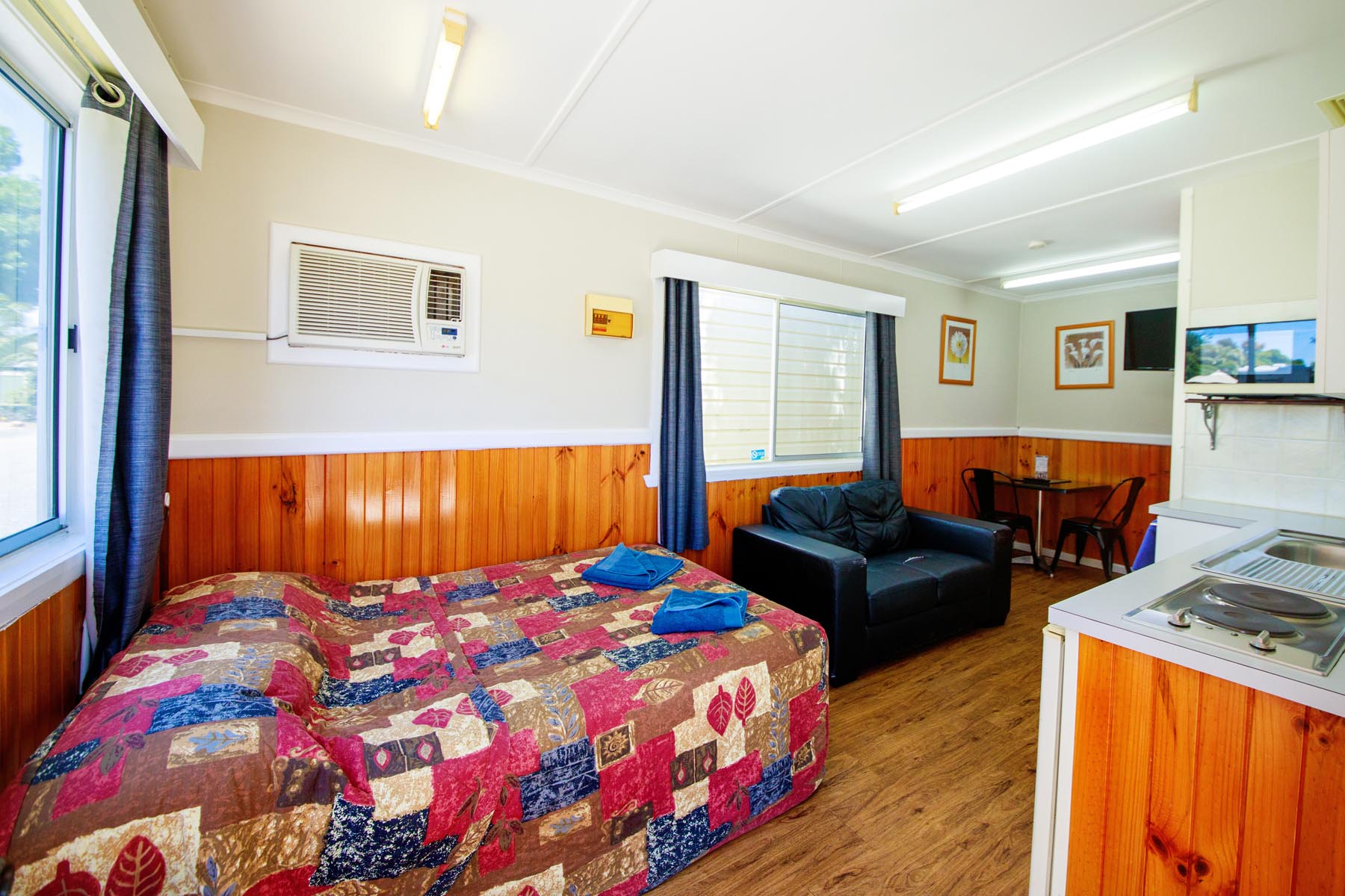 A great option for travellers looking for a basic clean cabin at a good price. Our standard cabin is a self contained open plan cabin with a double bed, dining table and chairs and fully self contained kitchenette.
