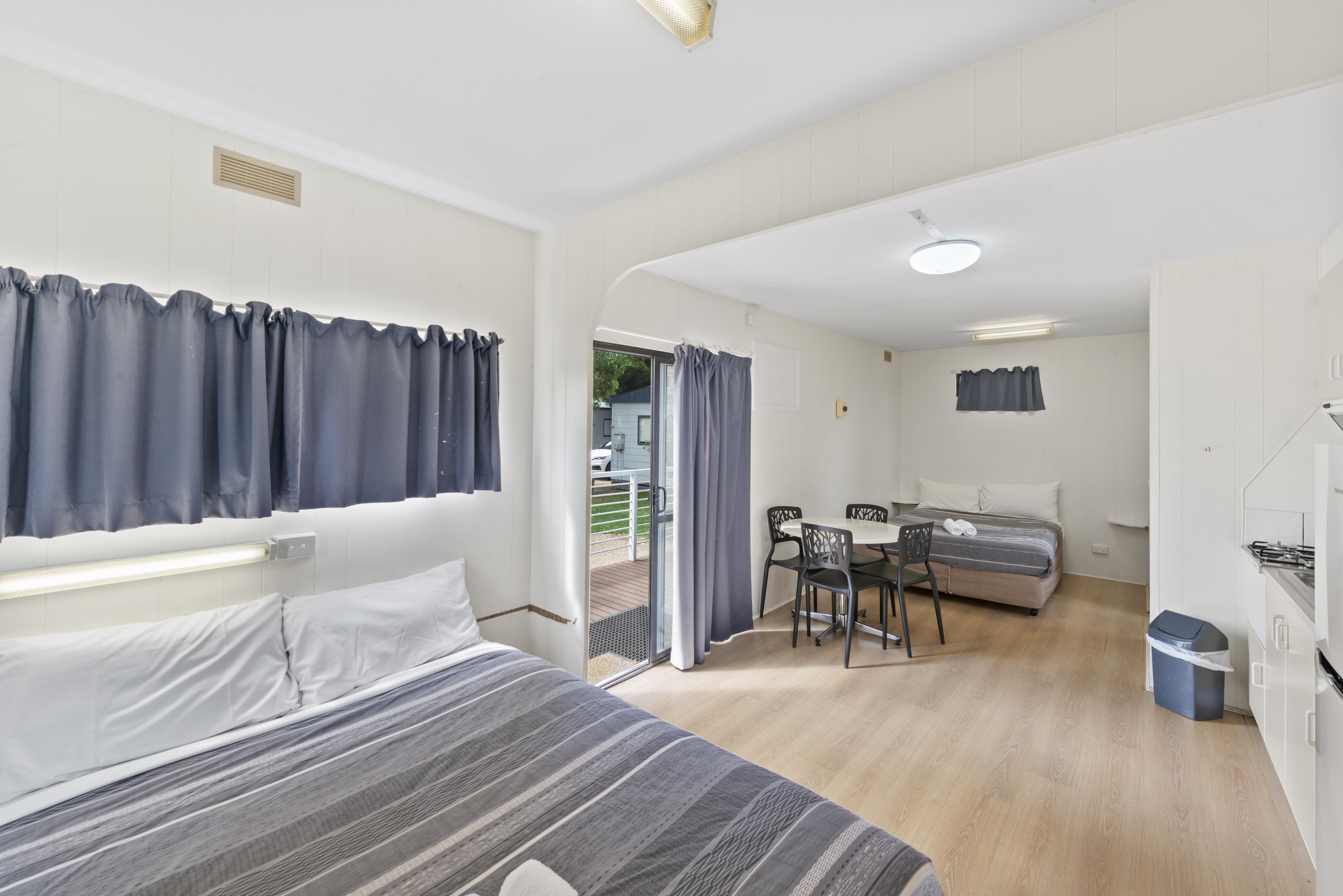 Our Studio Cabin comfortably sleeps up to 2 guests, featuring a queen bed, ensuite bathroom and kitchenette, all in a cosy open-plan space.