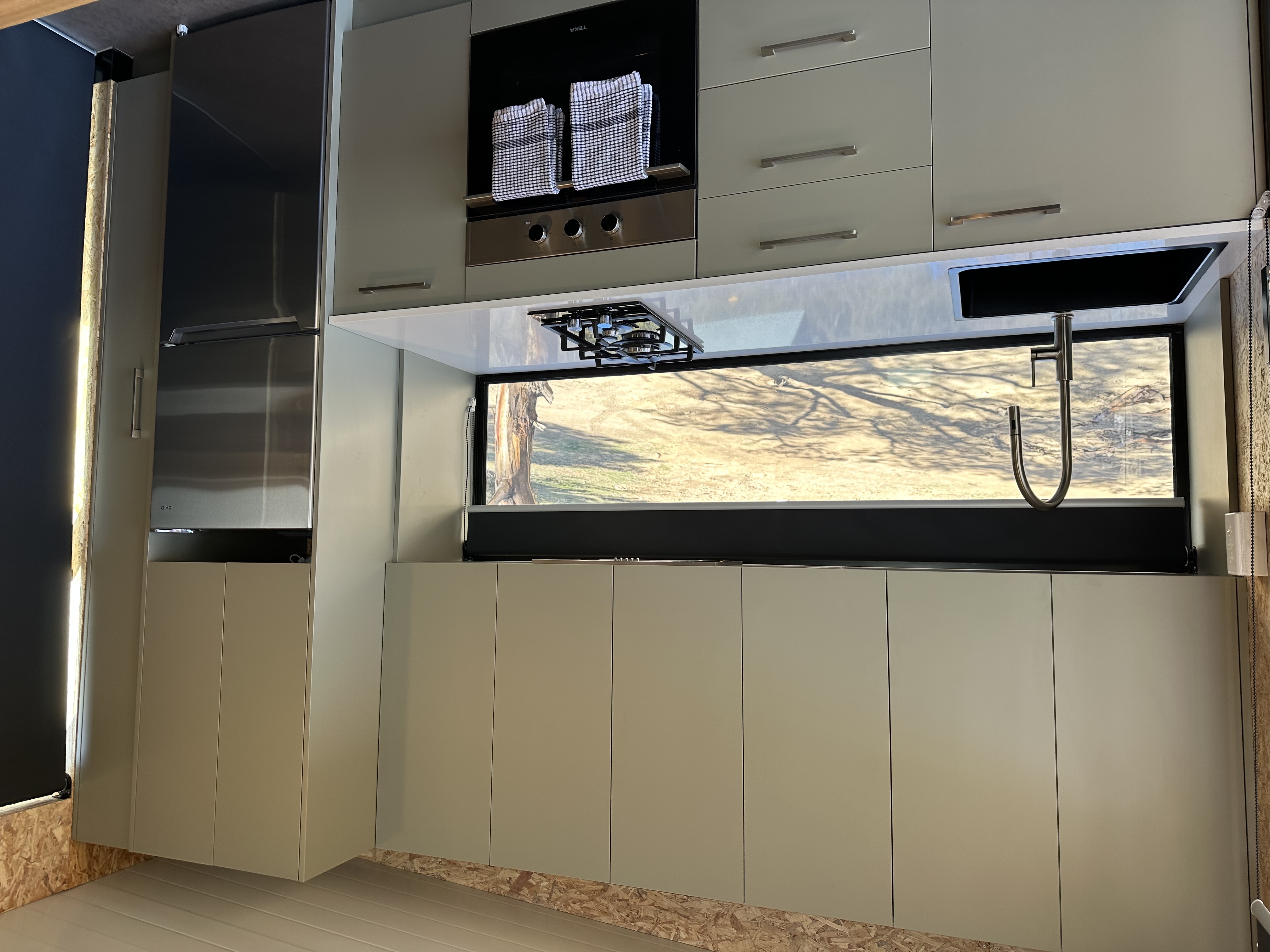 - Kitchenette with oven, cooktop, microwave, and washer/dryer combo