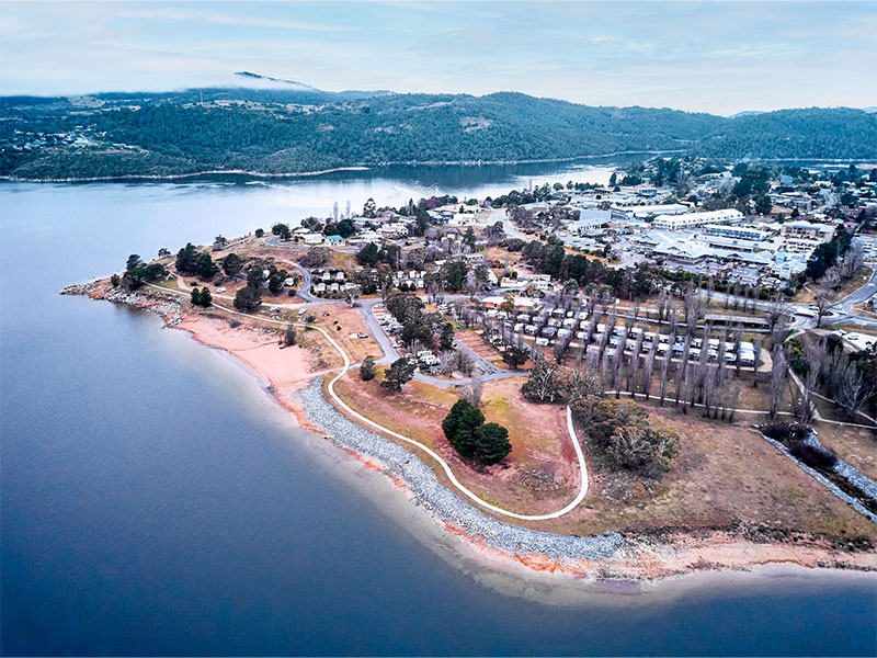 NRMA Jindabyne Holiday Park is situated on the shores of Lake Jindabyne in the NSW Snowy Mountains, a short walk from Jindabyne village. It’s an easy drive from Thredbo and Perisher snowfields and Kosciuszko National Park. There’s accommodation to suit every style and budget, from two-bedroom lake view villas to funky glamtainers, cute tiny homes, comfy studios, and pet-friendly caravan and camping sites. Whichever you choose, the stunning mountain and lake surroundings make it a stay to remember. The perfect base for outdoor adventure in every season, be on the first chairlift in winter, with an onsite ski tuning table and drying room to make your snow trip easy. In summer, the lakeside location and onsite boat ramp make wakeboarding, water skiing and fishing easy, while the mountains await discovery on foot, bike, 4WD – even horse! Back at camp, the roaring communal campfire is the perfect place to debrief a day of adventure beneath the stars.