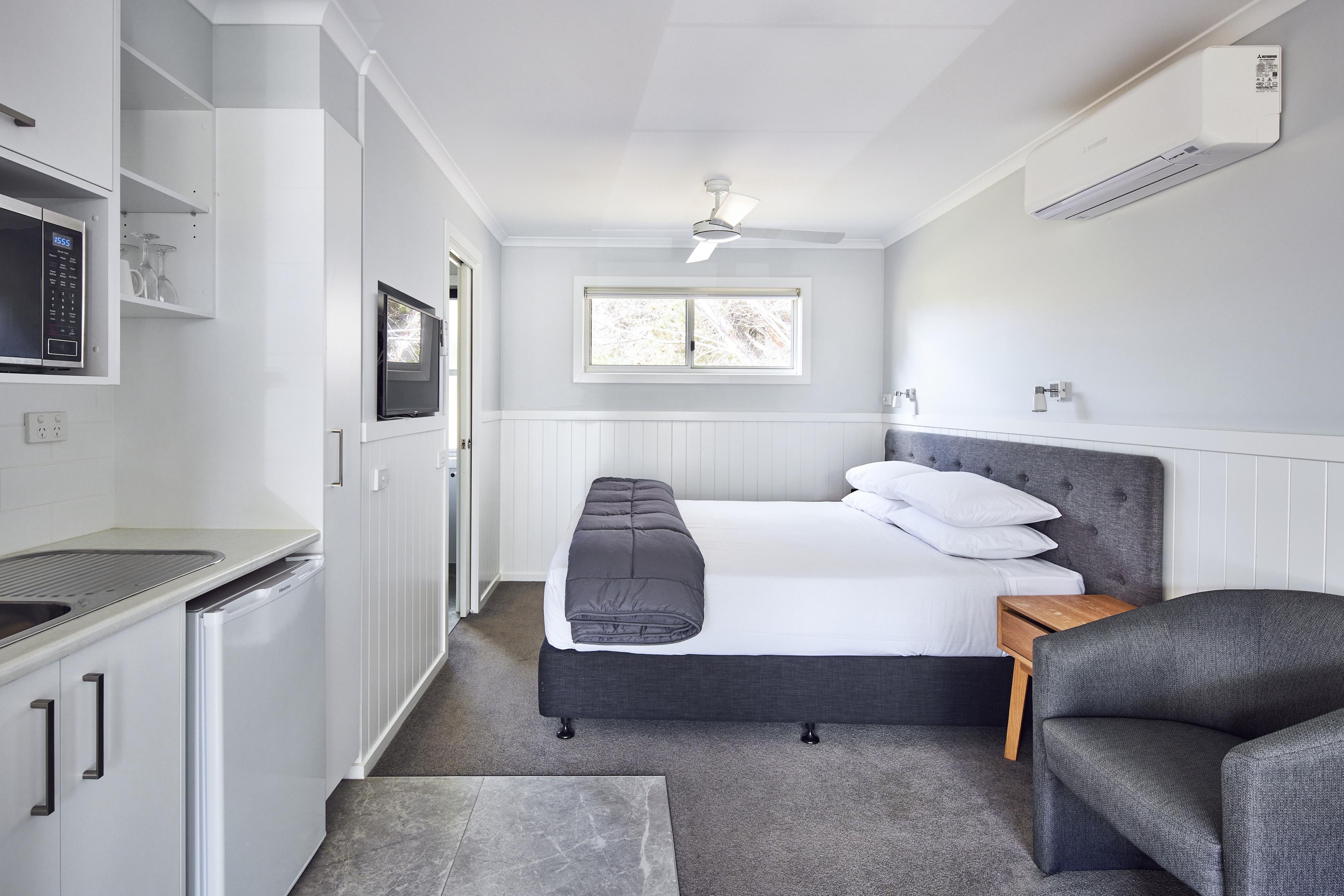 Located near the lake in a quiet part of the park. Open plan. One split king bed, which can be split into 2 singles upon request at time of booking only. Features air-conditioning and heating; kitchenette with bar fridge and microwave; indoor seating and TV; bathroom; veranda with outdoor seating on shared veranda.