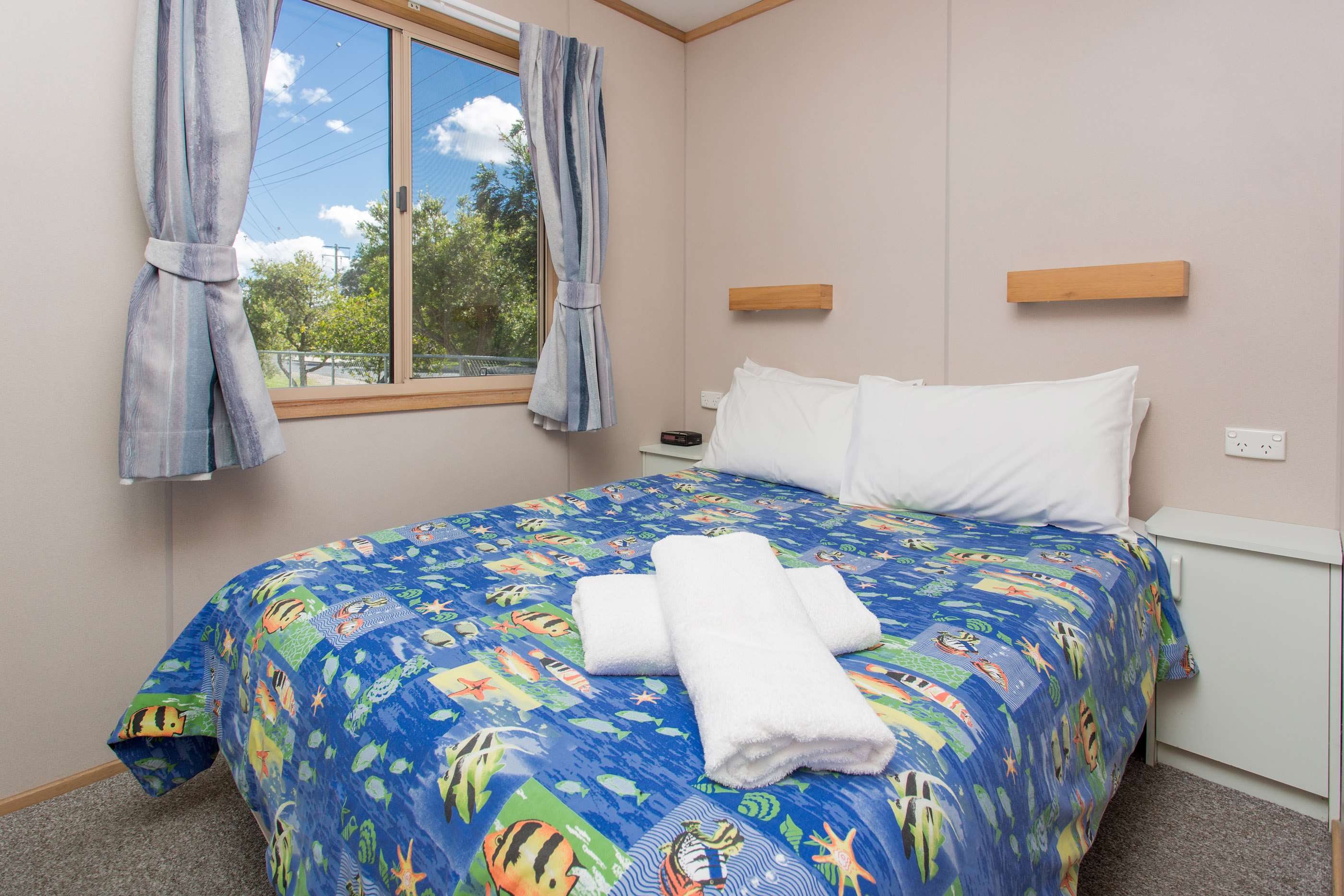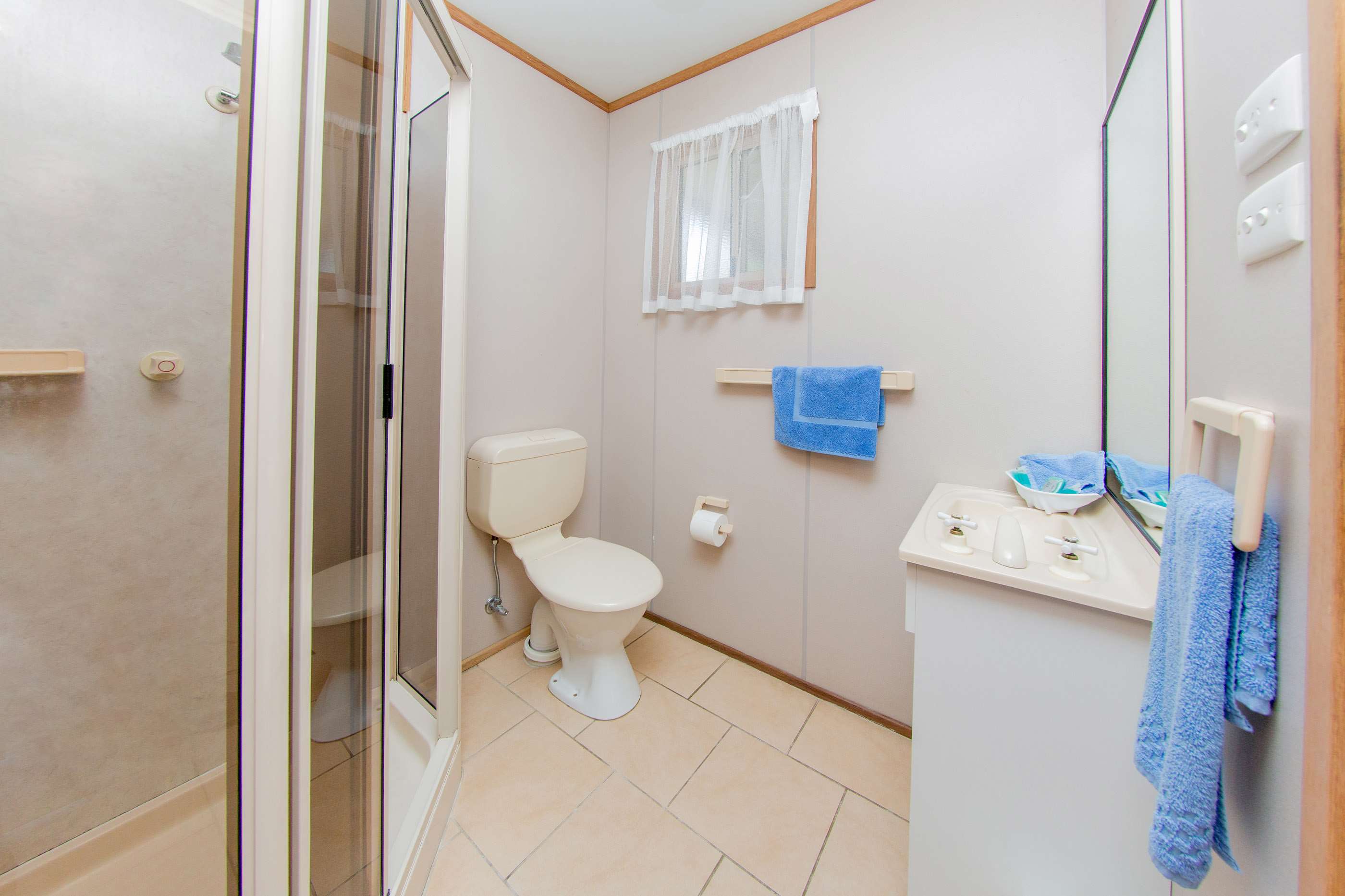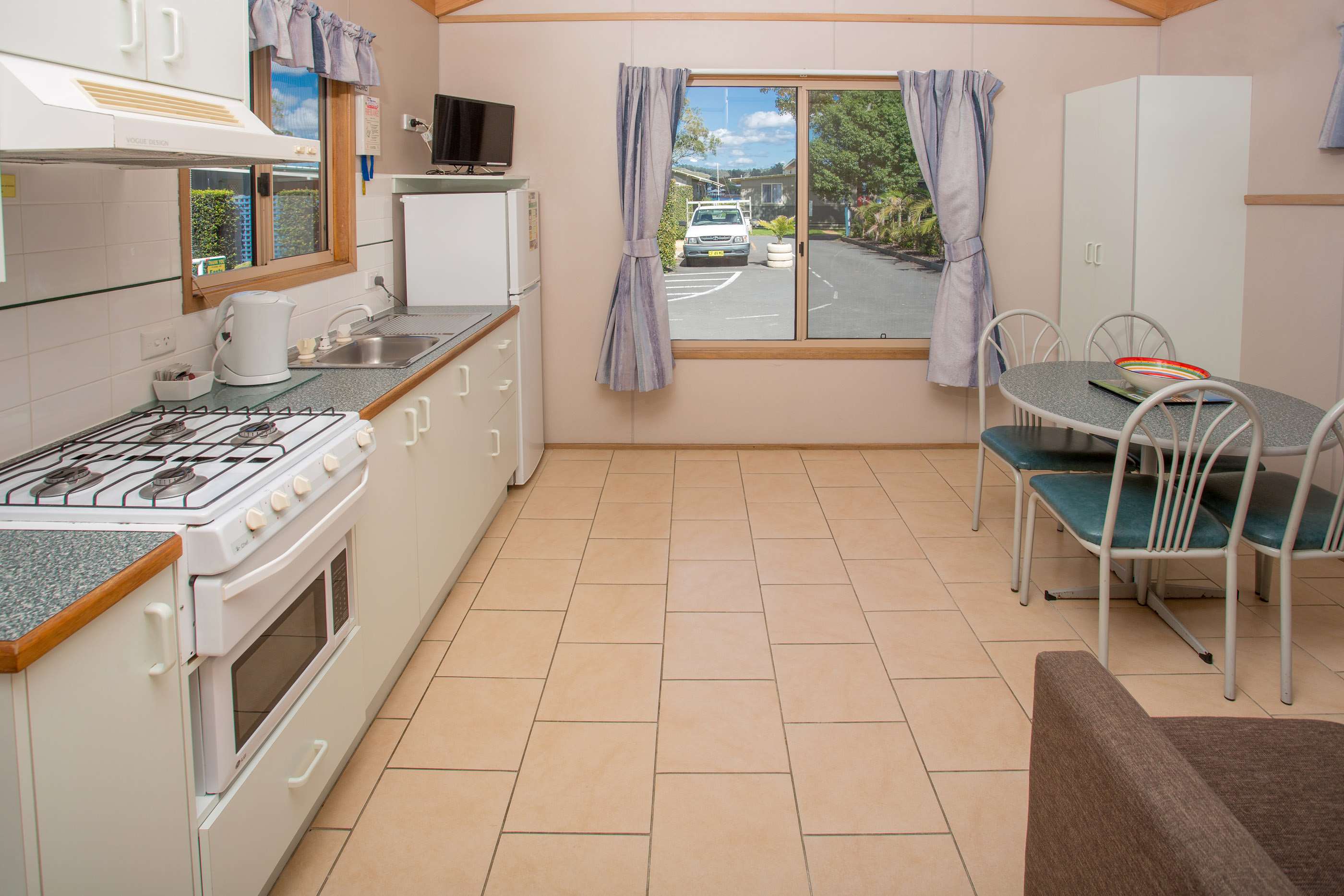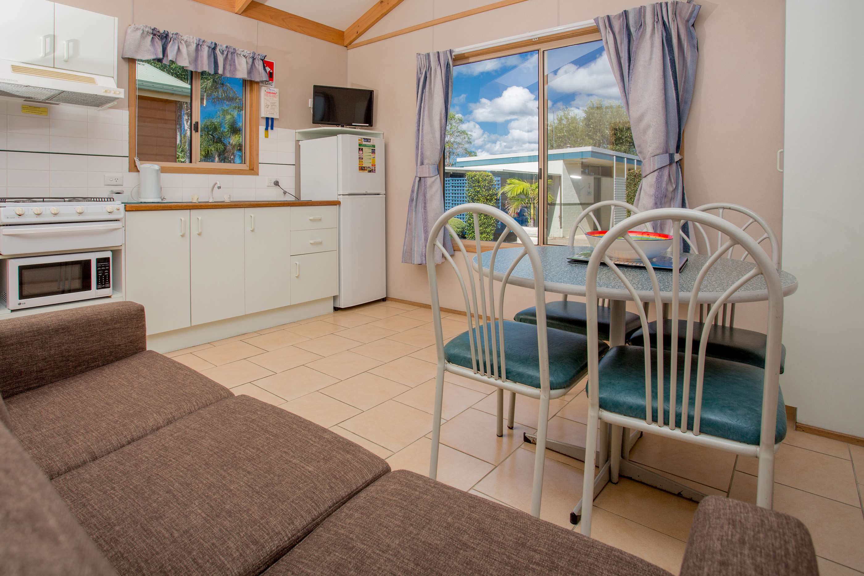 These cabins features an ensuite bathroom, main bedroom separate from living room, lounge in living room television, heating and air-conditioning, iron, and ironing board. The kitchen facilities includes cooking utensils, crockery, cutlery, fridge, gas griller and cooktop and microwave.