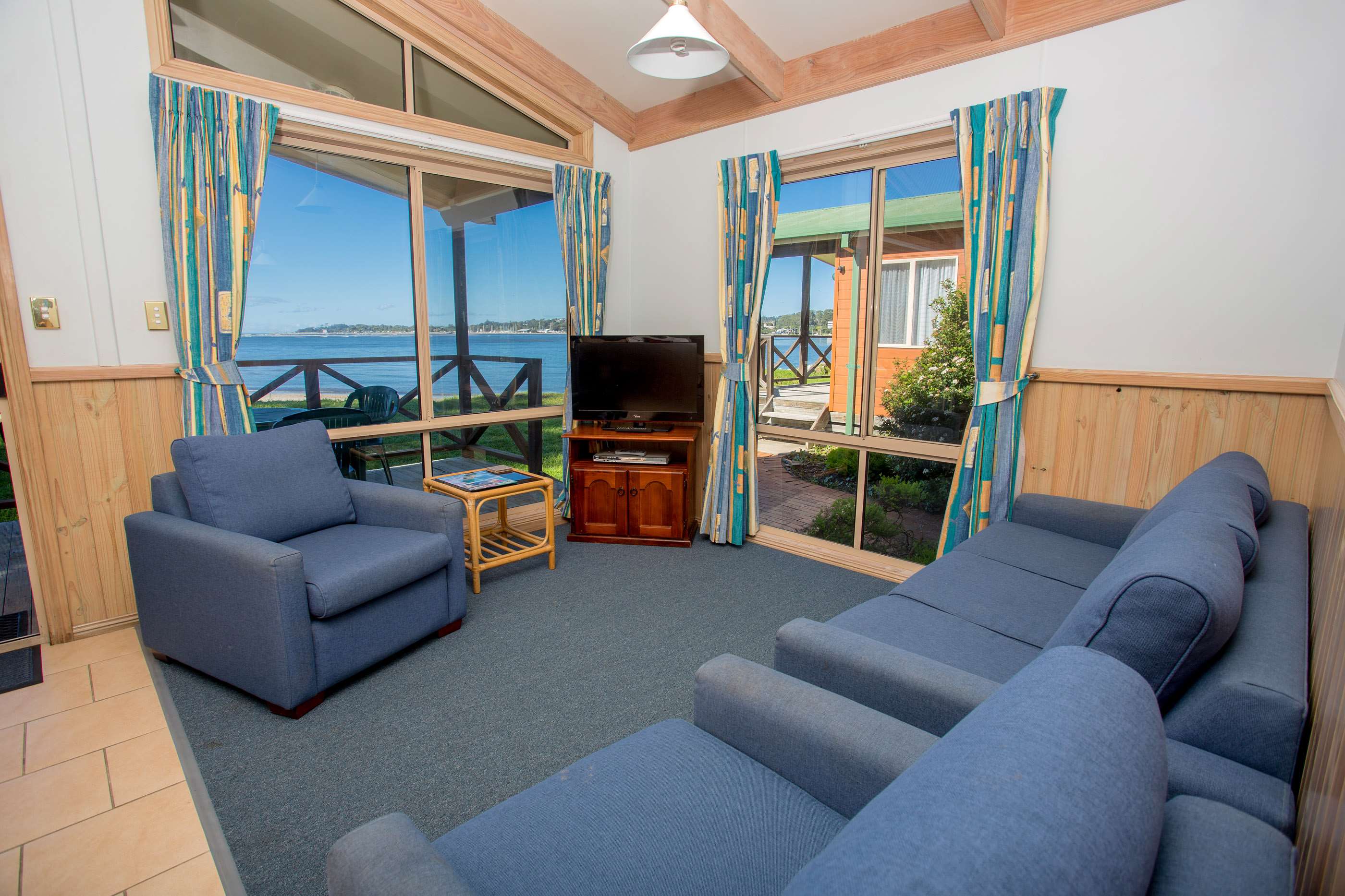 Our beautiful self contained Holiday Ocean Spas comfortably sleep up to 5 guests and are equipped with all the creature comforts of home including, two televisions, air-conditioning, a full kitchen, iron and ironing board. The main bedroom has a queen bed, and the second bedroom has either two double bunk beds or a double bunk bed and a single bed, ideal for families of different sizes.