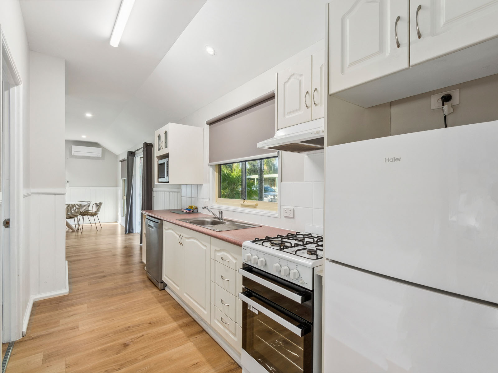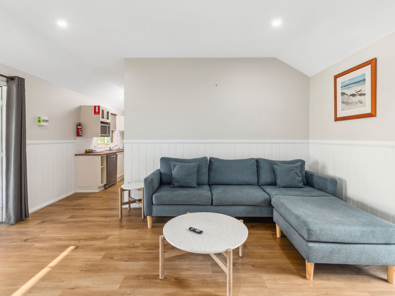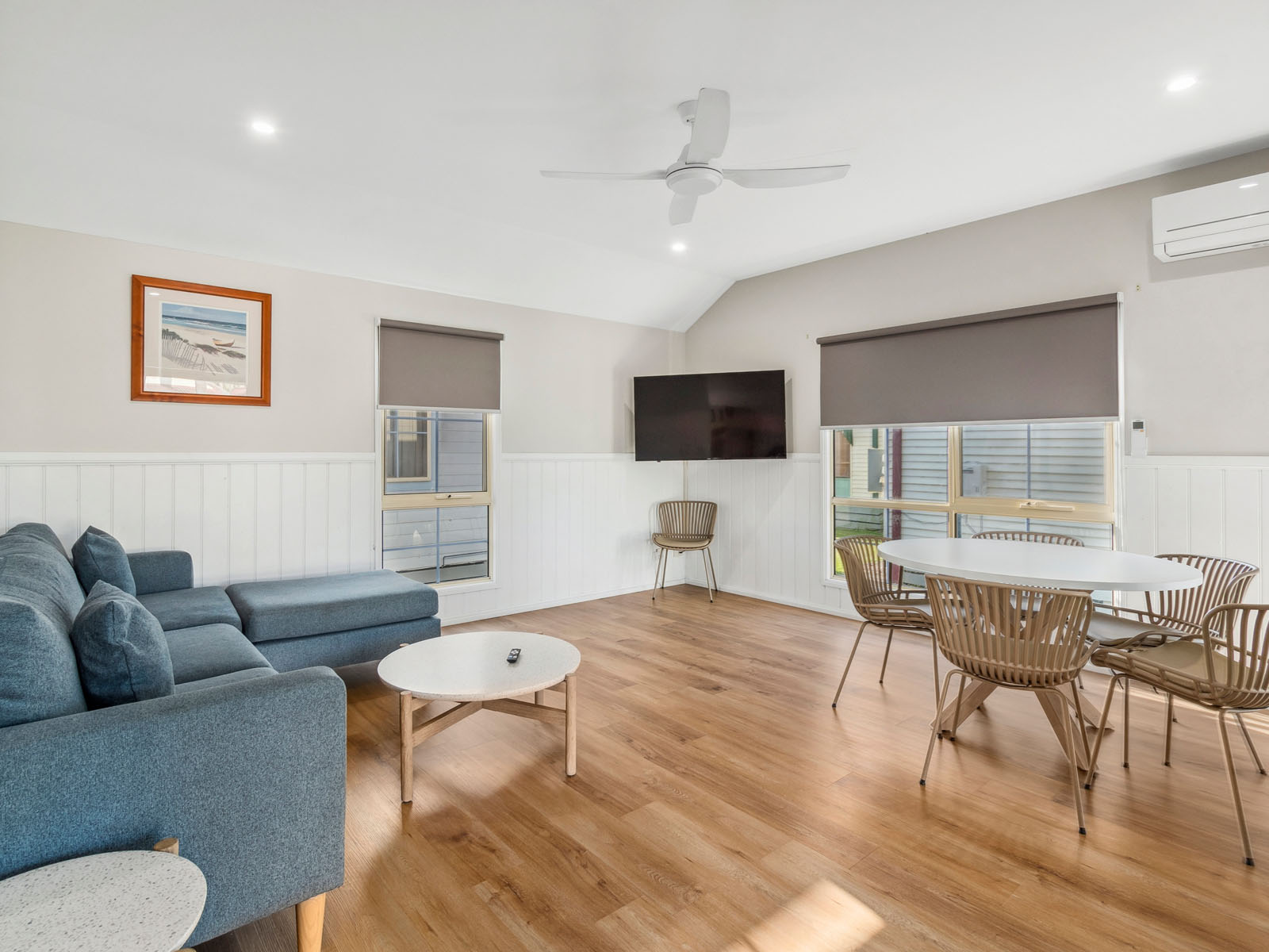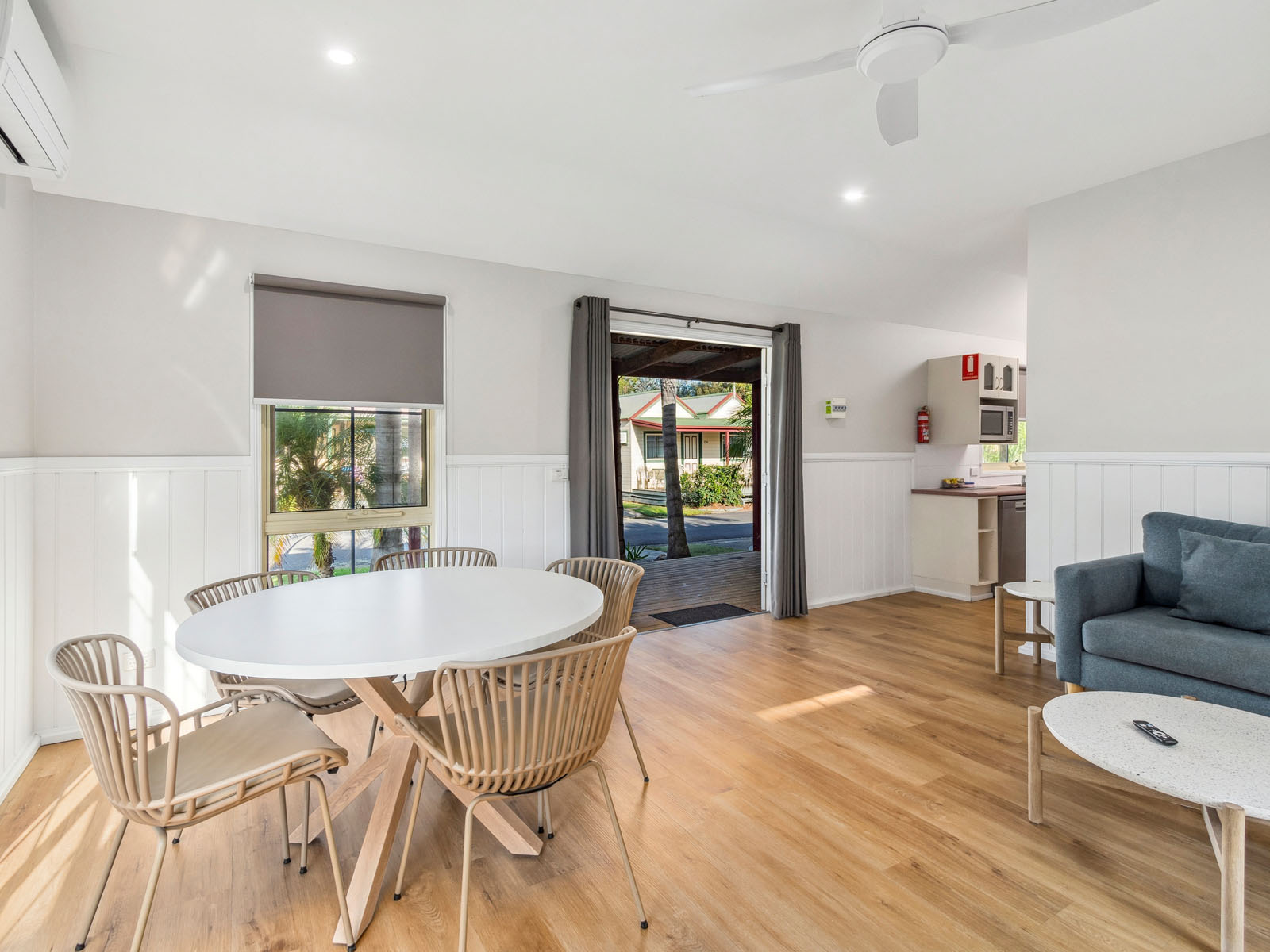 It includes two queen beds and one bunk bed, two bathrooms, and a full kitchen with dishwasher. The air-conditioned living space opens onto a private verandah with outdoor dining. Pet-friendly and practical, this villa is great for longer stays with family or friends.