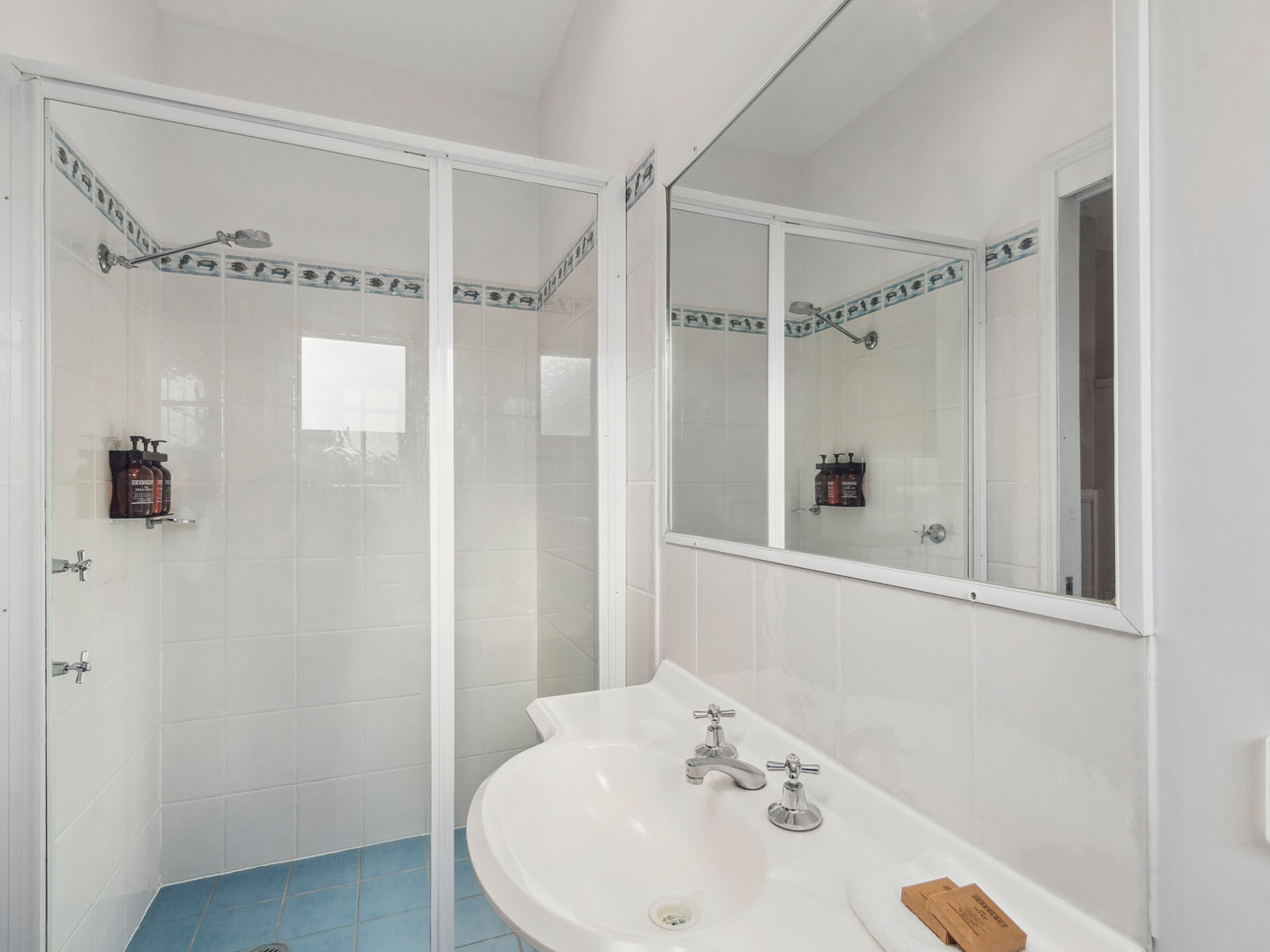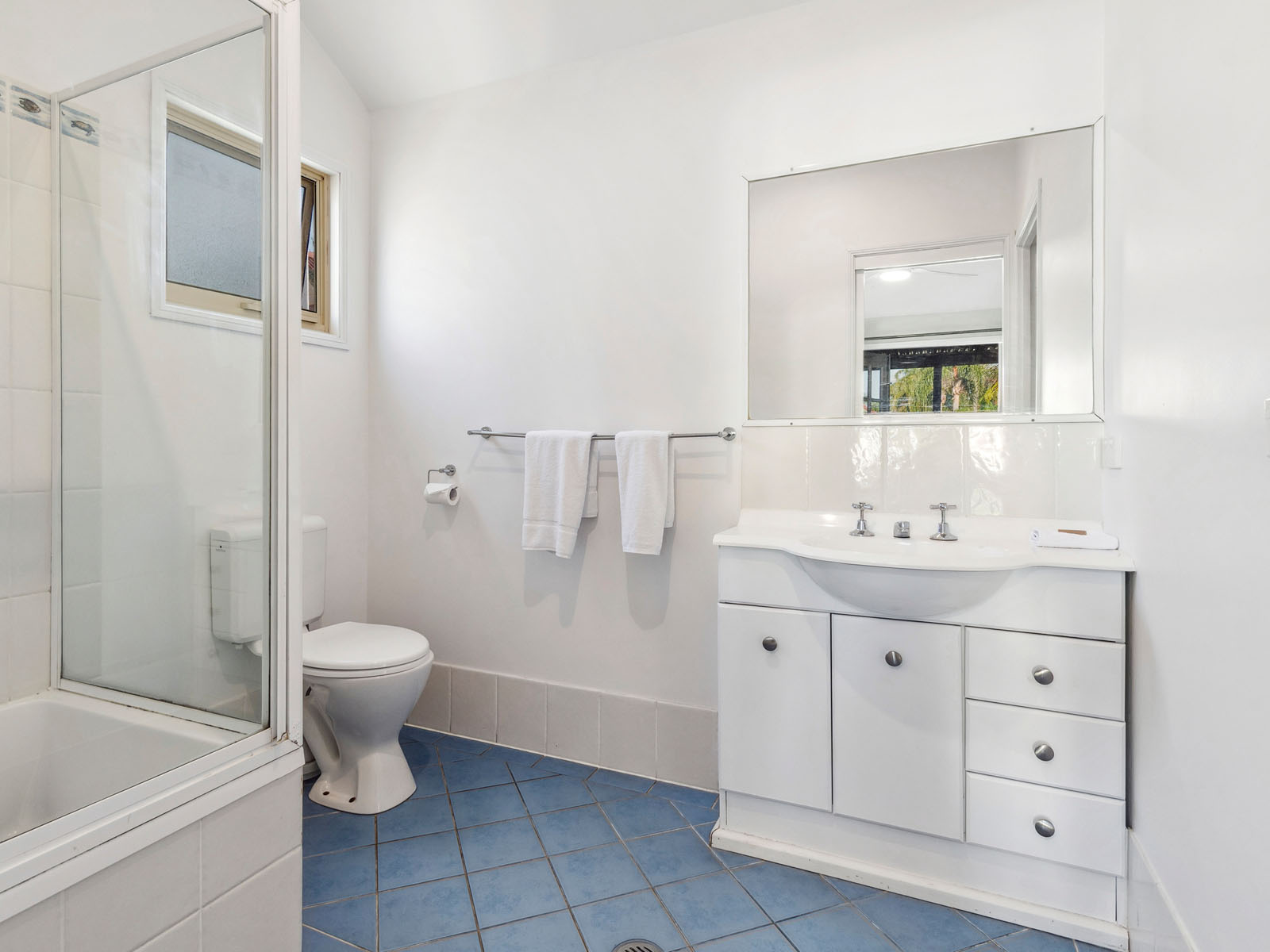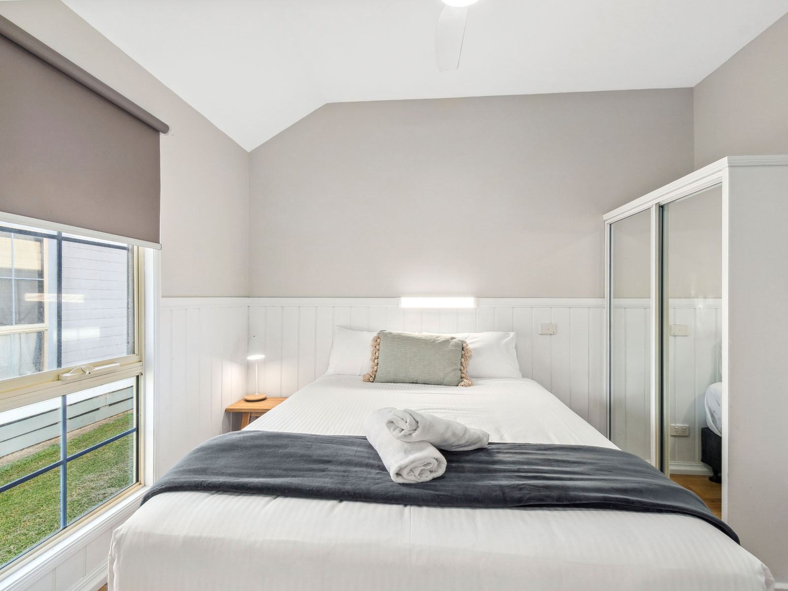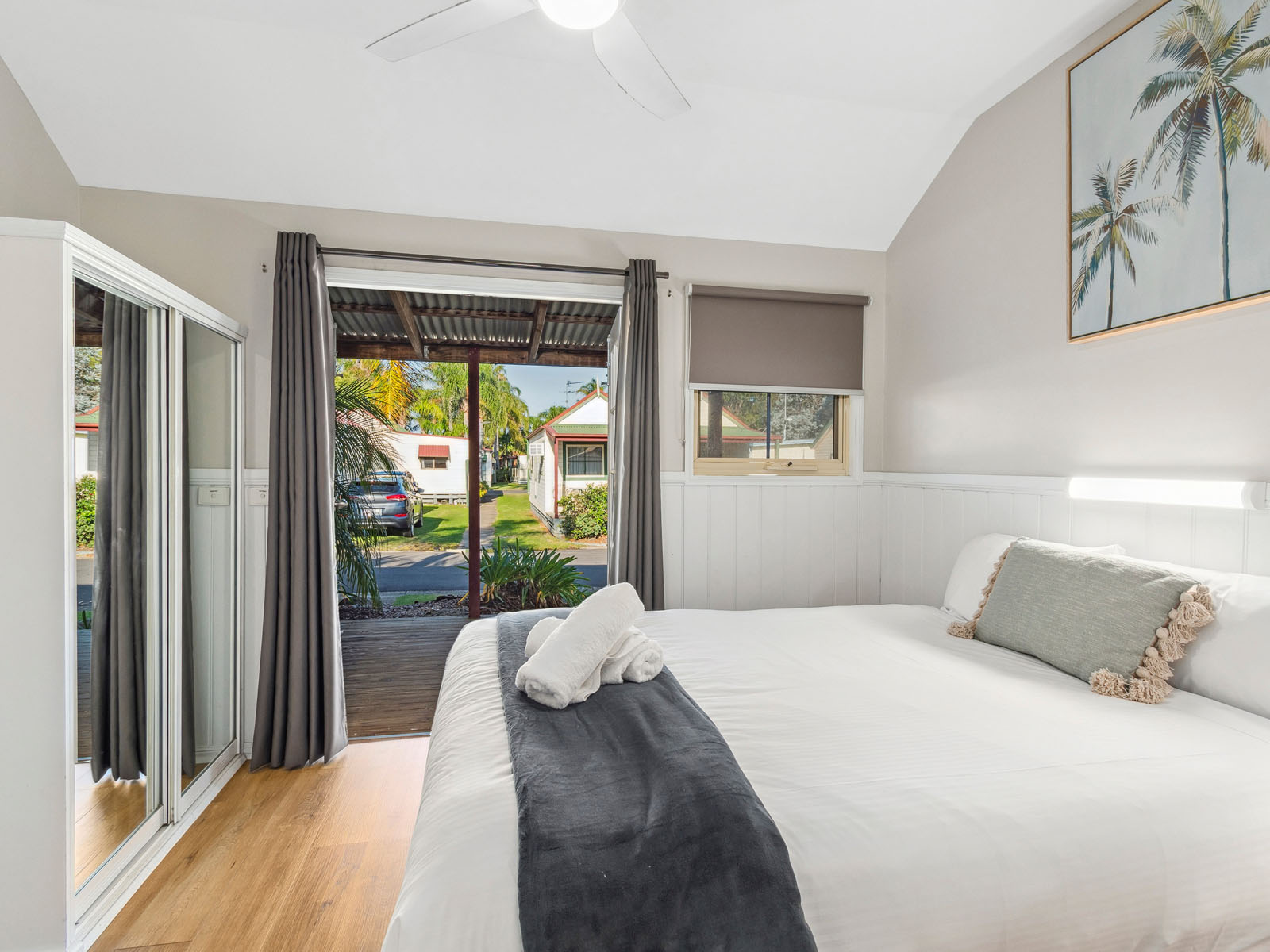 It includes two queen beds and one bunk bed, two bathrooms, and a full kitchen with dishwasher. The air-conditioned living space opens onto a private verandah with outdoor dining. Pet-friendly and practical, this villa is great for longer stays with family or friends.