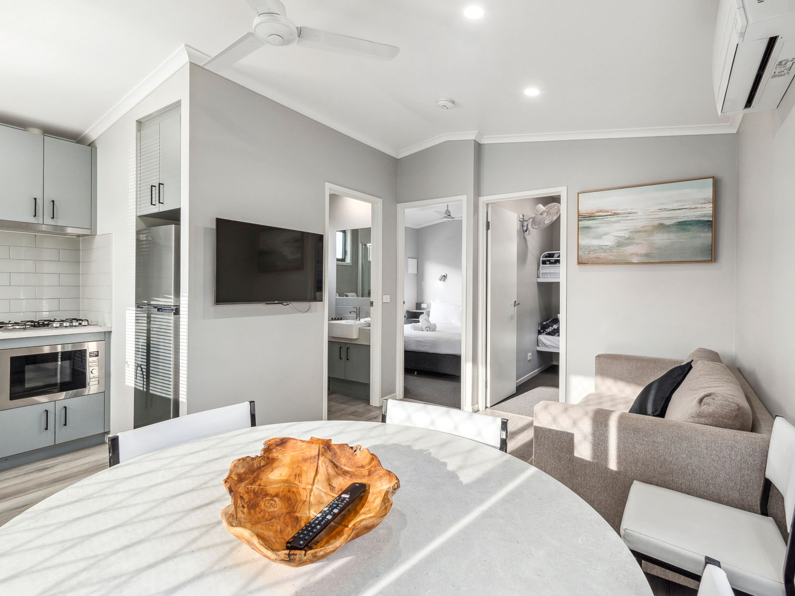It features a kitchenette with microwave, fridge, and gas cooktop, along with a bathroom and open plan living. The air-conditioned interior opens to a balcony, and the cabin is pet friendly.
