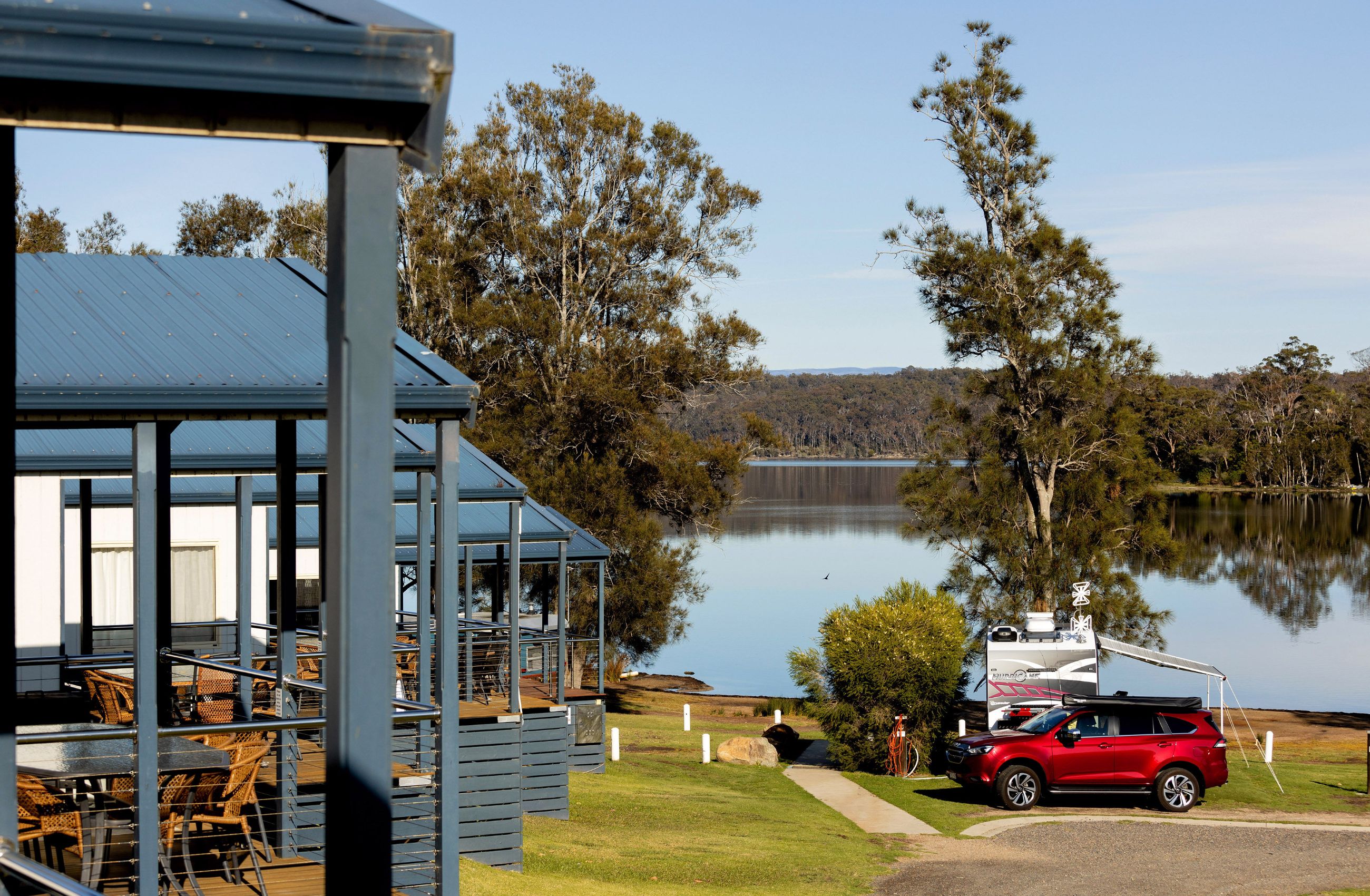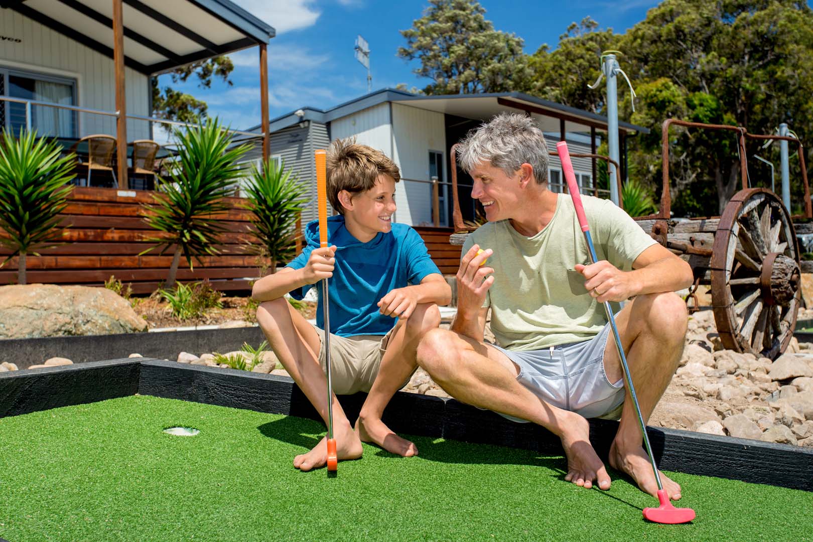 BIG4 Wallaga Lake Holiday Park sits right on the shores of Wallaga Lake, just 5km from Bermagui's centre. Camel Rock Beach is only a short stroll across the road. We provide a variety of accommodation options, including 3 Bedroom Alfresco Villas, The Lake House, Ensuite Cabins, and pet-friendly powered and unpowered sites. Experience a lakeside paradise with stunning sunsets, watersports, bushwalking, fishing, canoeing, and kayak hire. Kids can enjoy the playground and pool, while everyone can have fun at our 18-hole Golf Rush Fever Mini Golf. Our caravan park also features a beach jetty and boat ramp. Enjoy a meal and a drink at the onsite Brewery, the renowned Camel Rock Brewhouse, or whip up a feast in our camp kitchens and BBQ areas.