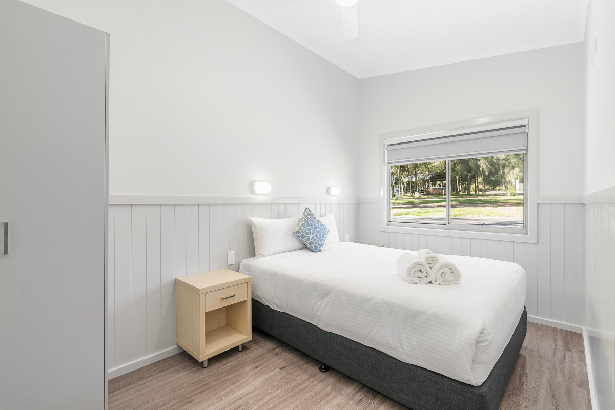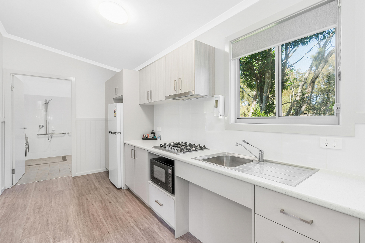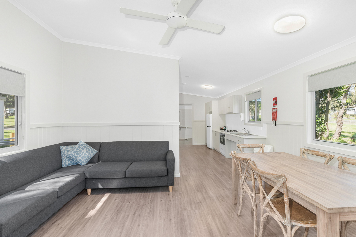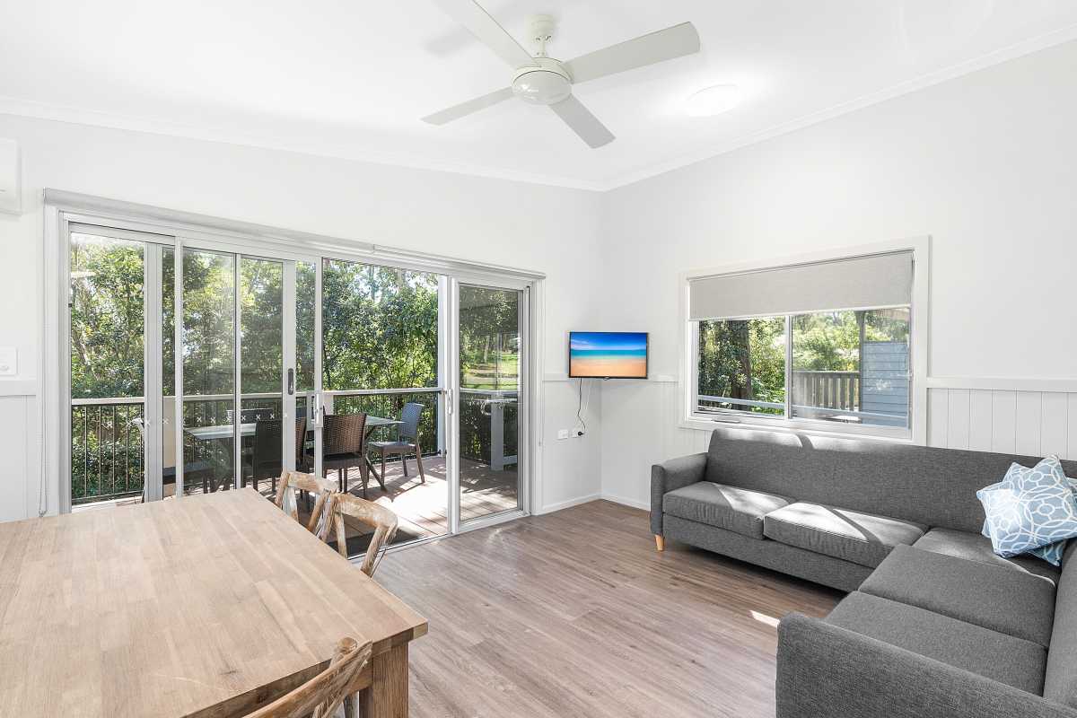 The kitchenette has a microwave and domestic sized fridge, while the open plan dining area comes complete with TV, DVD player, and split system air conditioning which is everything you need for a comfortable stay. Whether you’re relaxing on the deck after a day at the beach or cooking dinner on the BBQ, this cabin is your perfect coastal retreat.