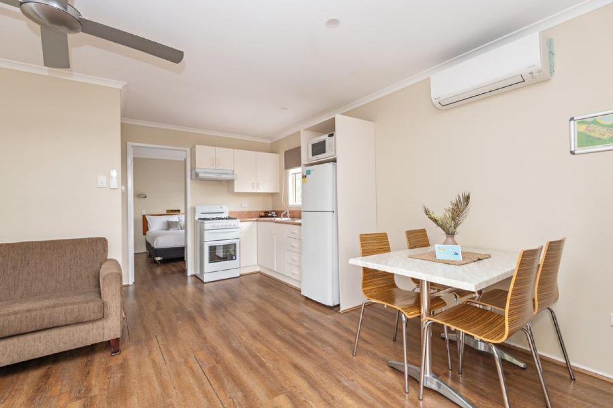 Fully equipped kitchen & domestic sized fridge, open plan living & dining area with TV, DVD & split system air conditioning.