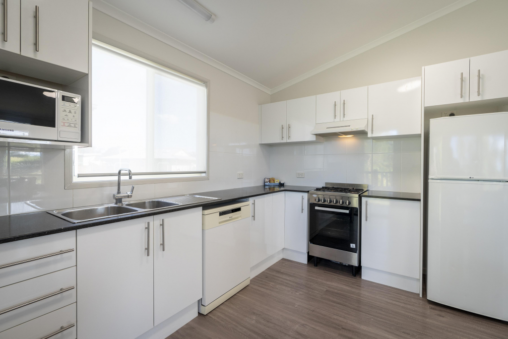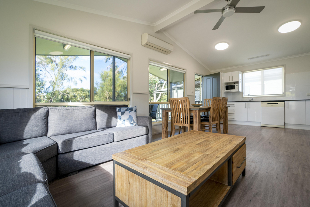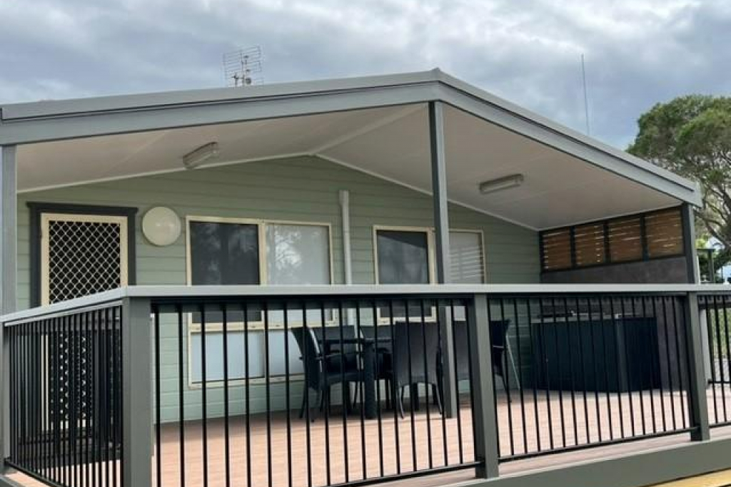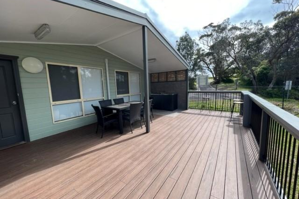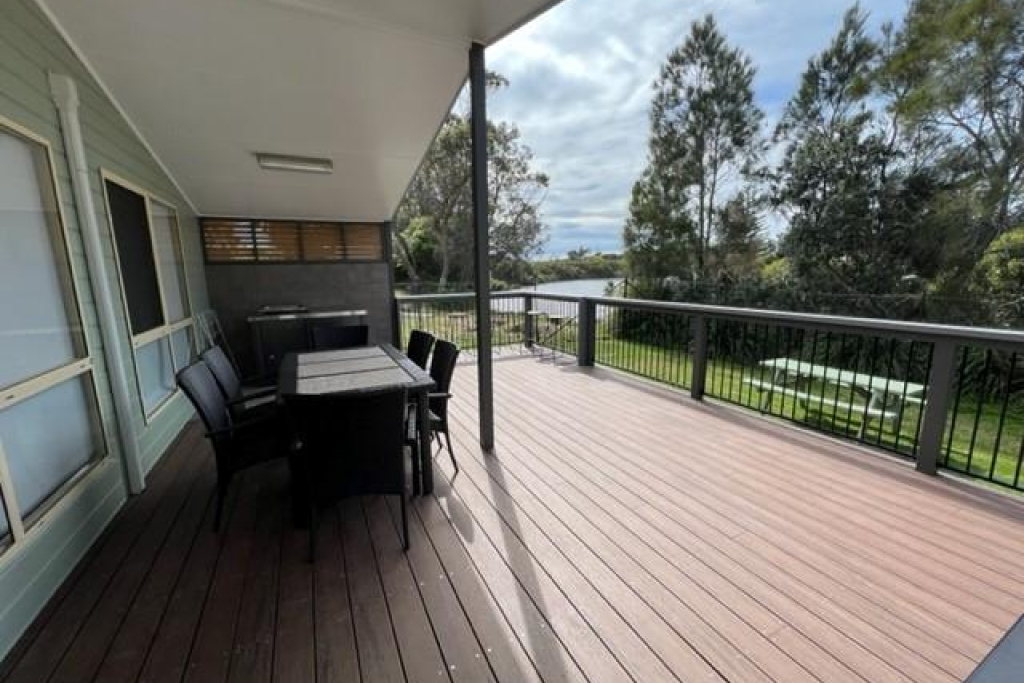 Enjoy a brand new large deck with your own BBQ and breakfast bar, outdoor setting and lounge with views of Currarong Creek. This is a large family sized cabin with roomy living and bedrooms. The main bedroom features a queen bed. The second bedroom contains two sets of bunks which are solid, roomy & suit adults as well as children. Linen is provided for all booked guests. Sleeps 6.
