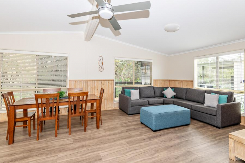 Located along the creek, this cabin has a fully equipped modern kitchen including fridge, microwave and dishwasher and large lounge area with TV, ceiling fans and air-conditioning.