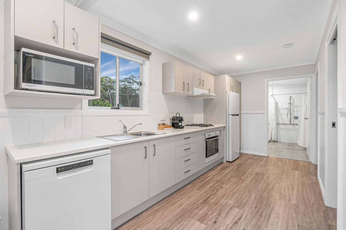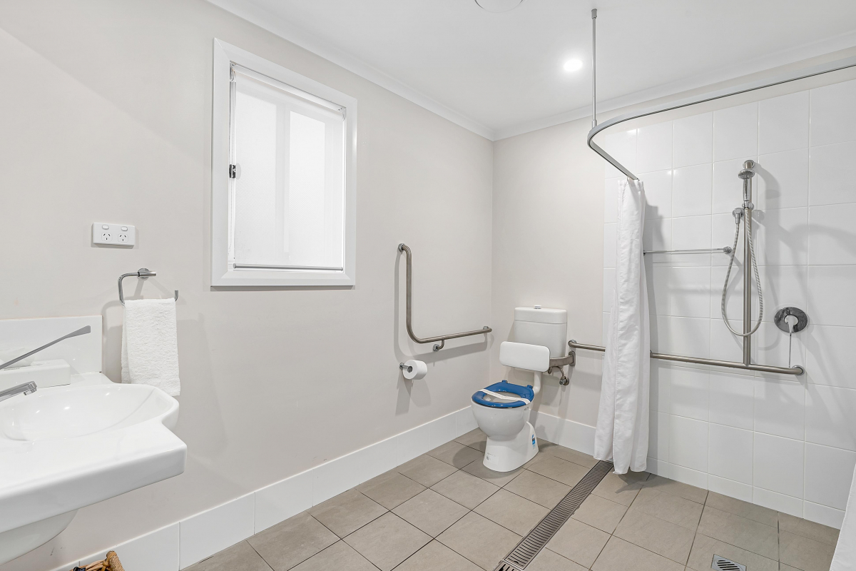 The kitchen benches are slightly lower and there is an electric under bench oven and gas cooktop for your cooking needs. A large shower recess for mobility equipment.