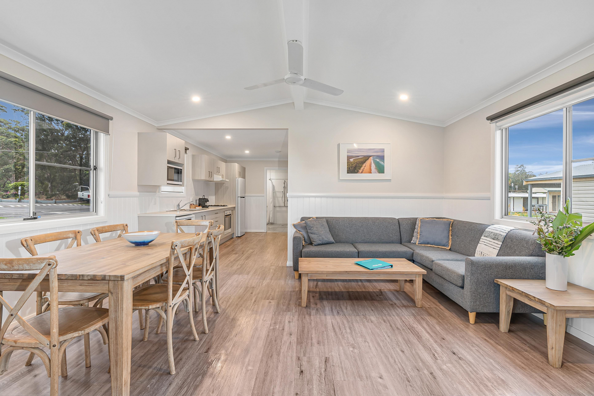 This cabin can sleep 4, with a queen bed in the main bedroom and a single bunk in the second bedroom. Combined living room & dining room.